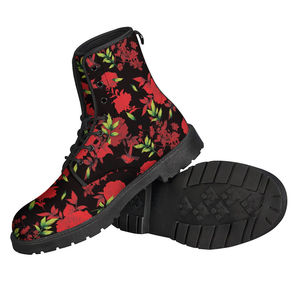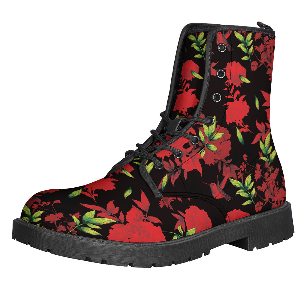 Black and Red Roses Floral Print Leather Boots for Stylish Hippies - 1