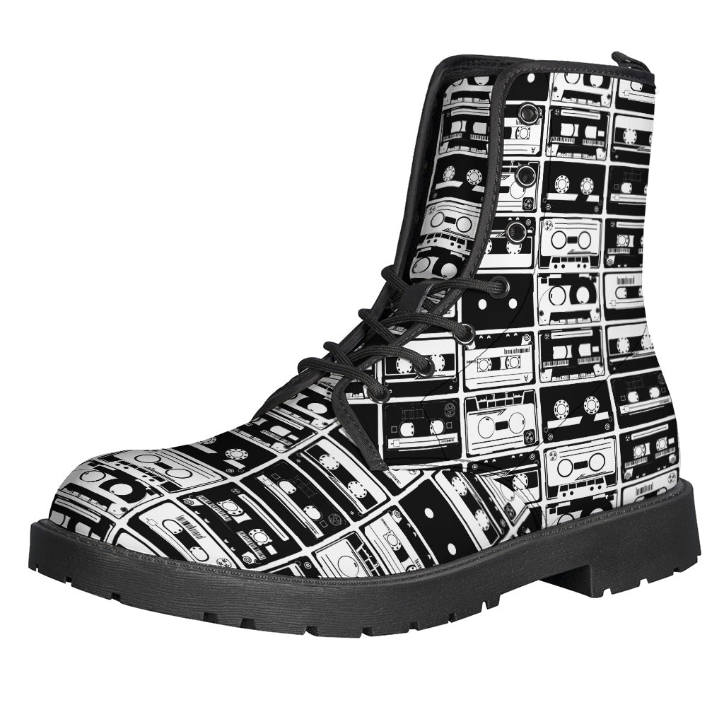 Embrace your inner free spirit with these Black and White Cassette Tape Print Leather Boots, perfect for the modern day hippie. These lightweight boots feature a unique cassette tape print design that will take you back to the groovy days of the 60s and 70s. Made from high-quality leather, these boots are not only stylish but also durable and comfortable for all-day wear. Whether you're heading to a music festival, exploring the great outdoors, or just looking to add a retro touch to your everyday outfit, these boots are the perfect choice. Let your adventurous soul shine with these Hippies Leather Lightweight Boots.