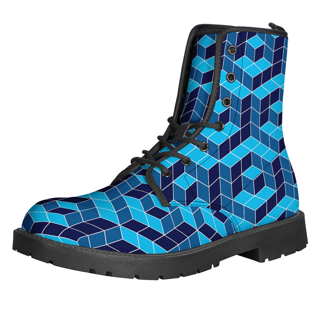 Embrace your inner hippie with these unique and stylish Leather Lightweight Boots. Featuring a vibrant blue geometric cube shape pattern print, these boots are the perfect statement piece for any free-spirited individual. Made from high-quality leather, these boots are not only stylish but also durable and comfortable enough for all-day wear. Whether you're heading to a music festival or simply exploring the great outdoors, these boots are sure to be a standout addition to your wardrobe. Embrace your individuality and stand out from the crowd with these hippie-inspired Leather Lightweight Boots.