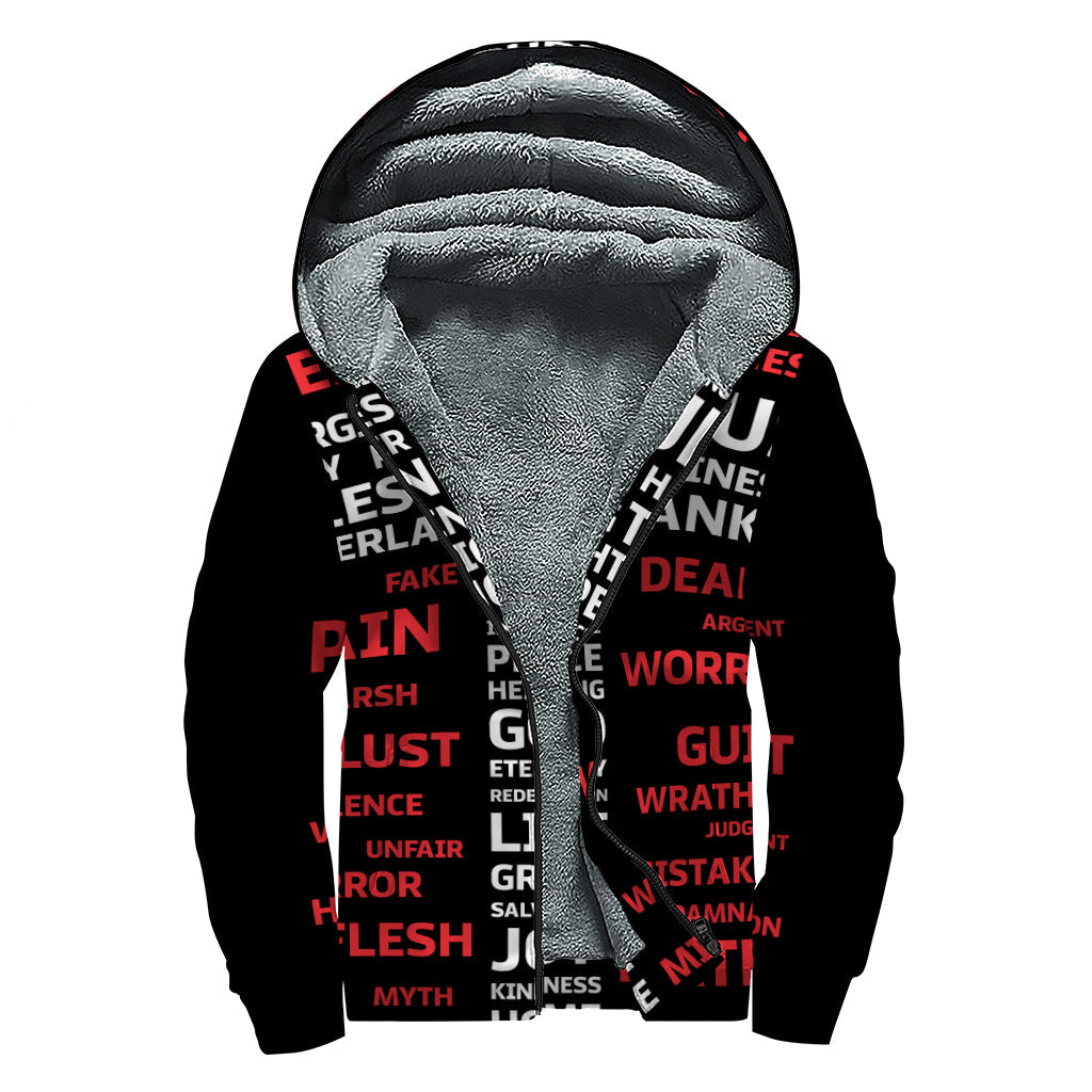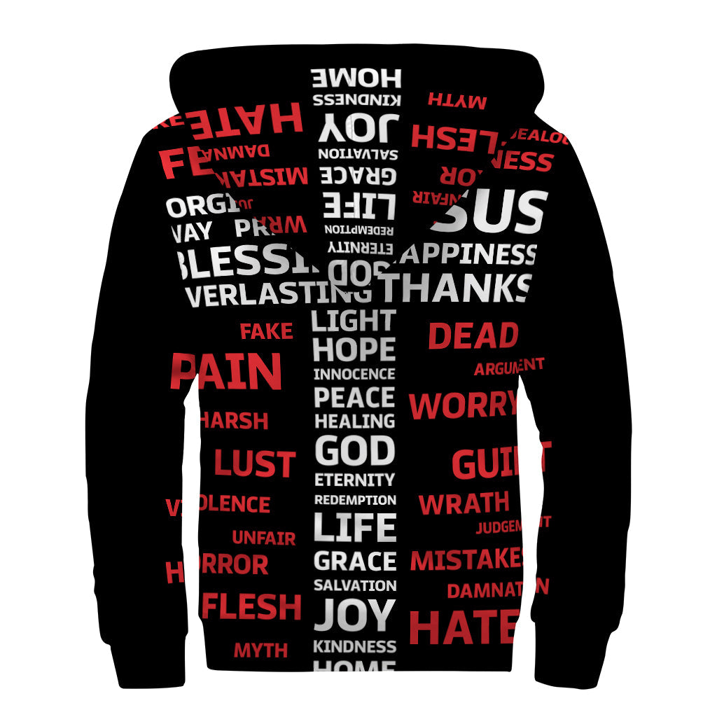 Bring out your inner flower child with this groovy Sherpa Lined Zip Up Hoodie perfect for any modern-day hippie. Featuring a unique Christian cross and religious words print, this hoodie is sure to make a statement. The ultra-cozy Sherpa lining will keep you warm and toasty during chilly days, while the zip-up design makes it easy to layer over your favorite tie-dye tee. Whether you're headed to a music festival or just hanging out with friends, this hoodie is the perfect combination of style and comfort for any free spirit. Peace, love, and Sherpa-lined goodness await with this must-have hippie essential.