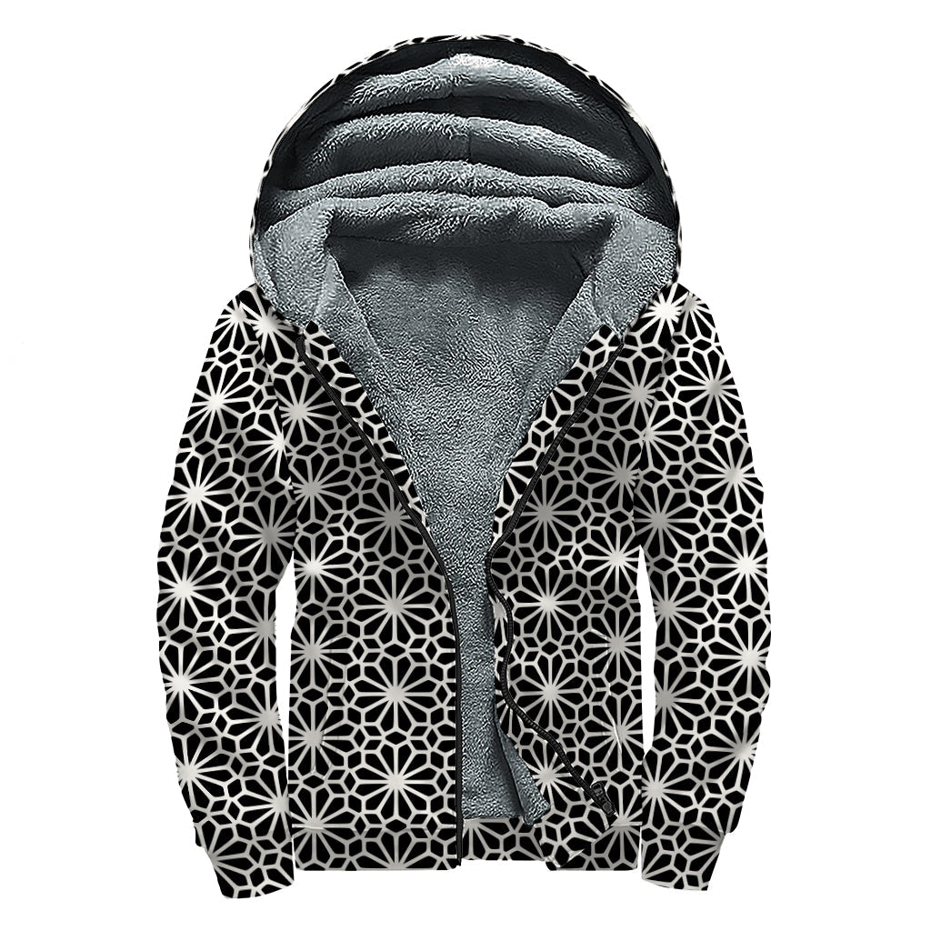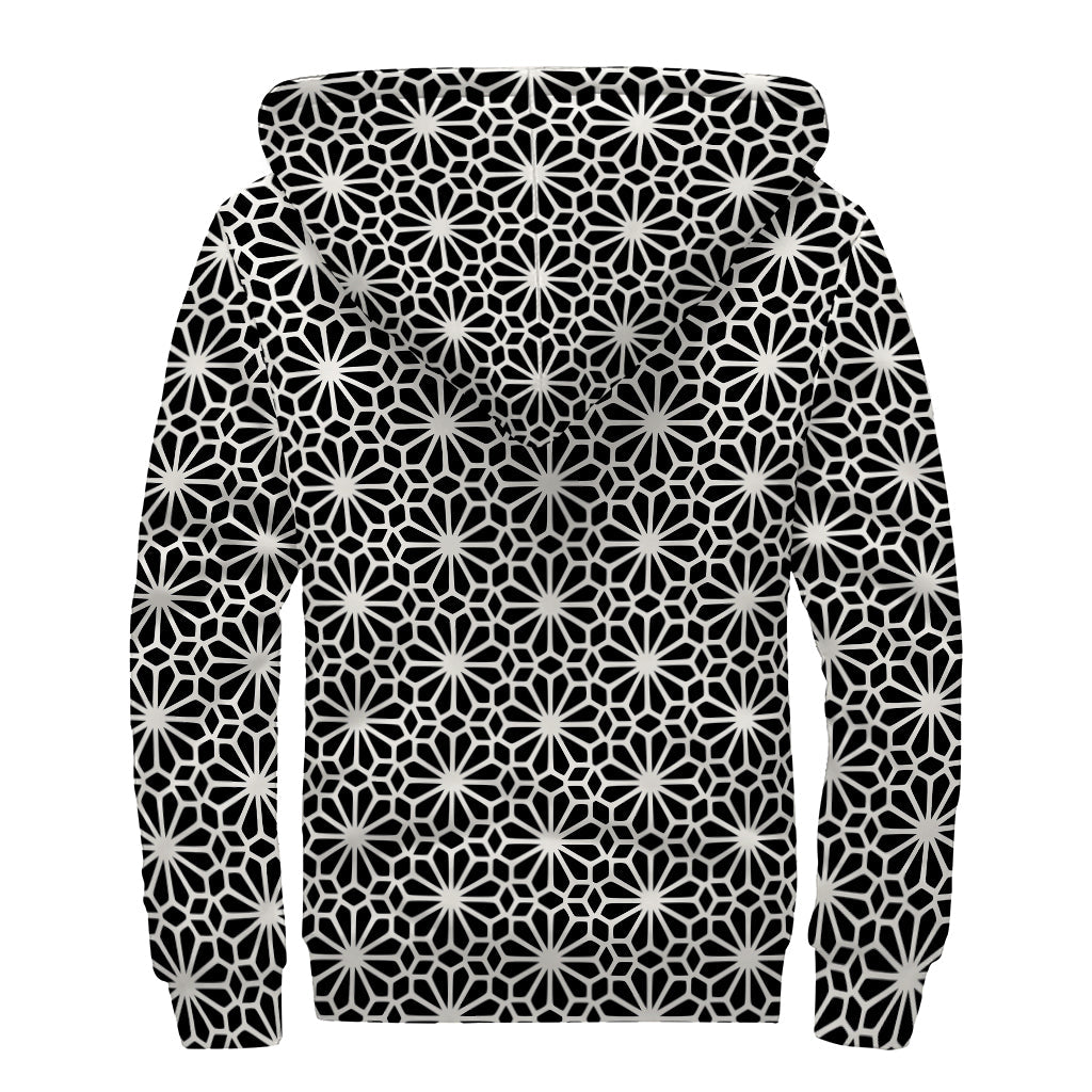 Bohemian Bliss: Black and White Geometric Floral Print Sherpa Lined Zip Up Hoodie