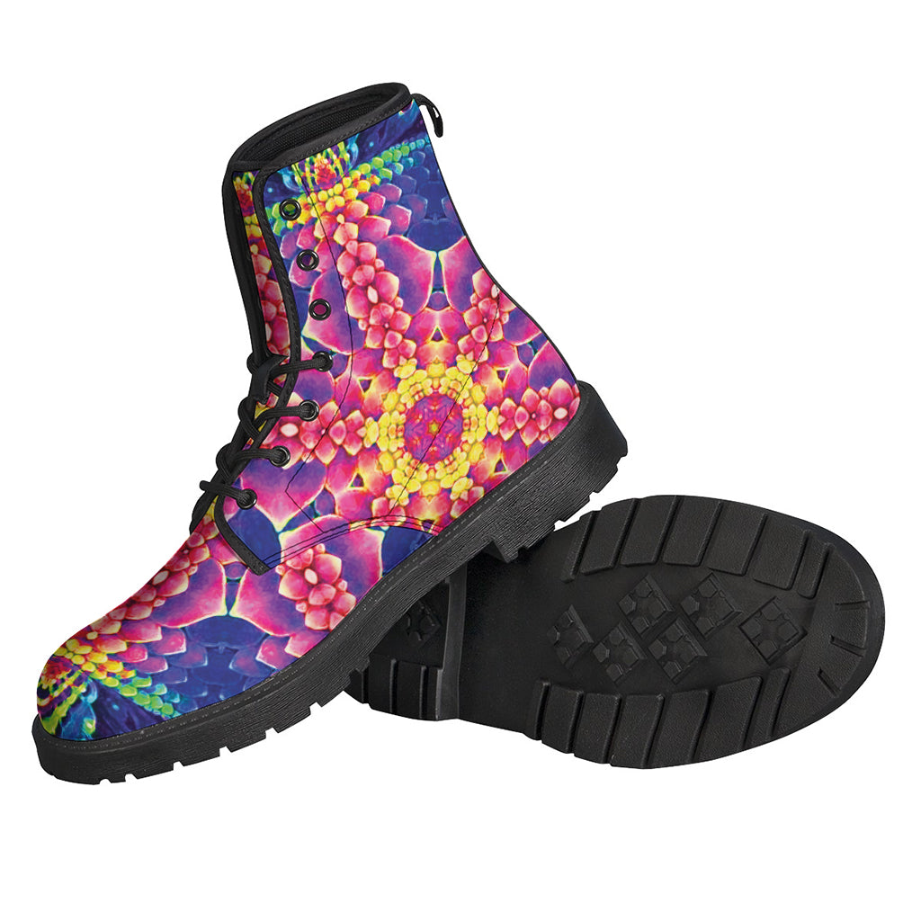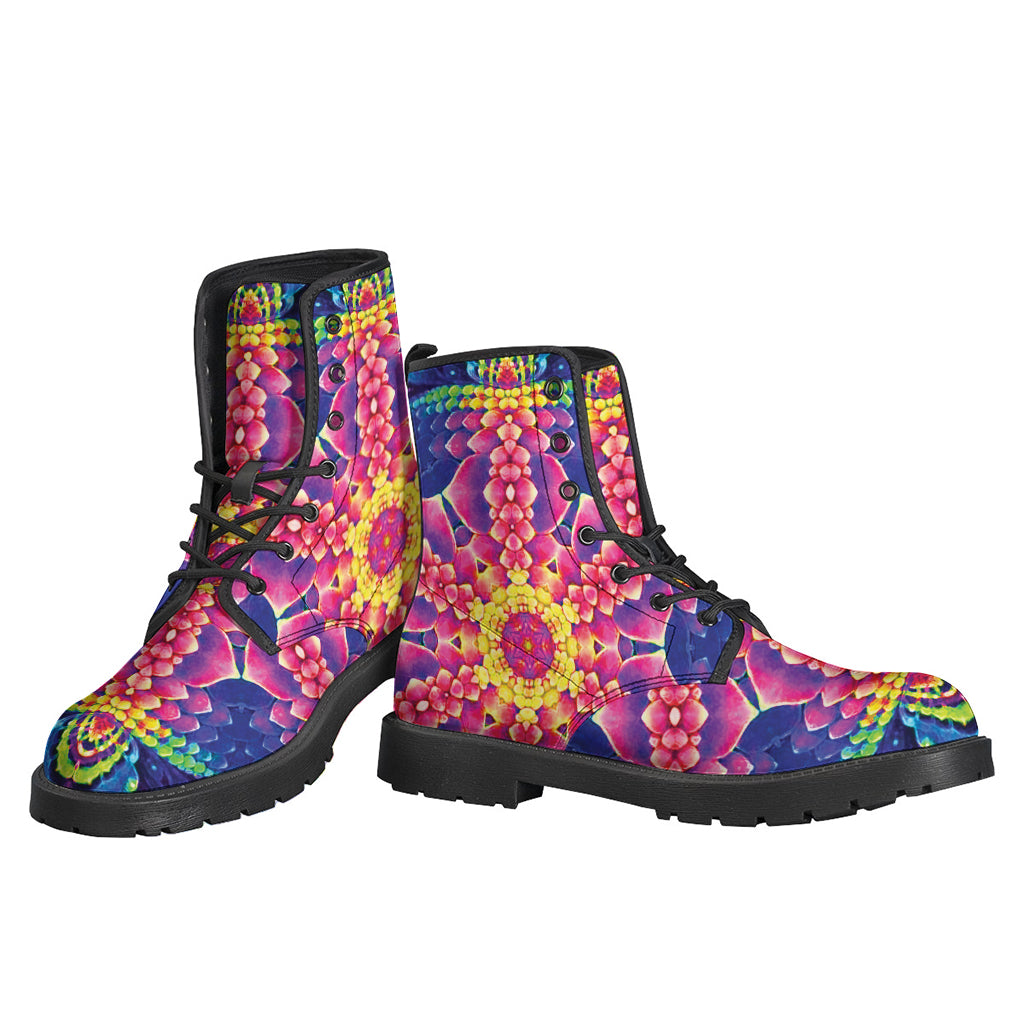 Channel your inner bohemian spirit with these colorful psychedelic kaleidoscope print leather boots. Handcrafted with love and care, these lightweight boots are perfect for the free-spirited hippie in you. The vibrant print is sure to make a statement wherever you go, whether you're dancing at a music festival or strolling through the park. Made from high-quality materials, these boots are not only stylish, but also durable and comfortable for all-day wear. Embrace your love for all things groovy and add these unique hippie leather boots to your collection today.