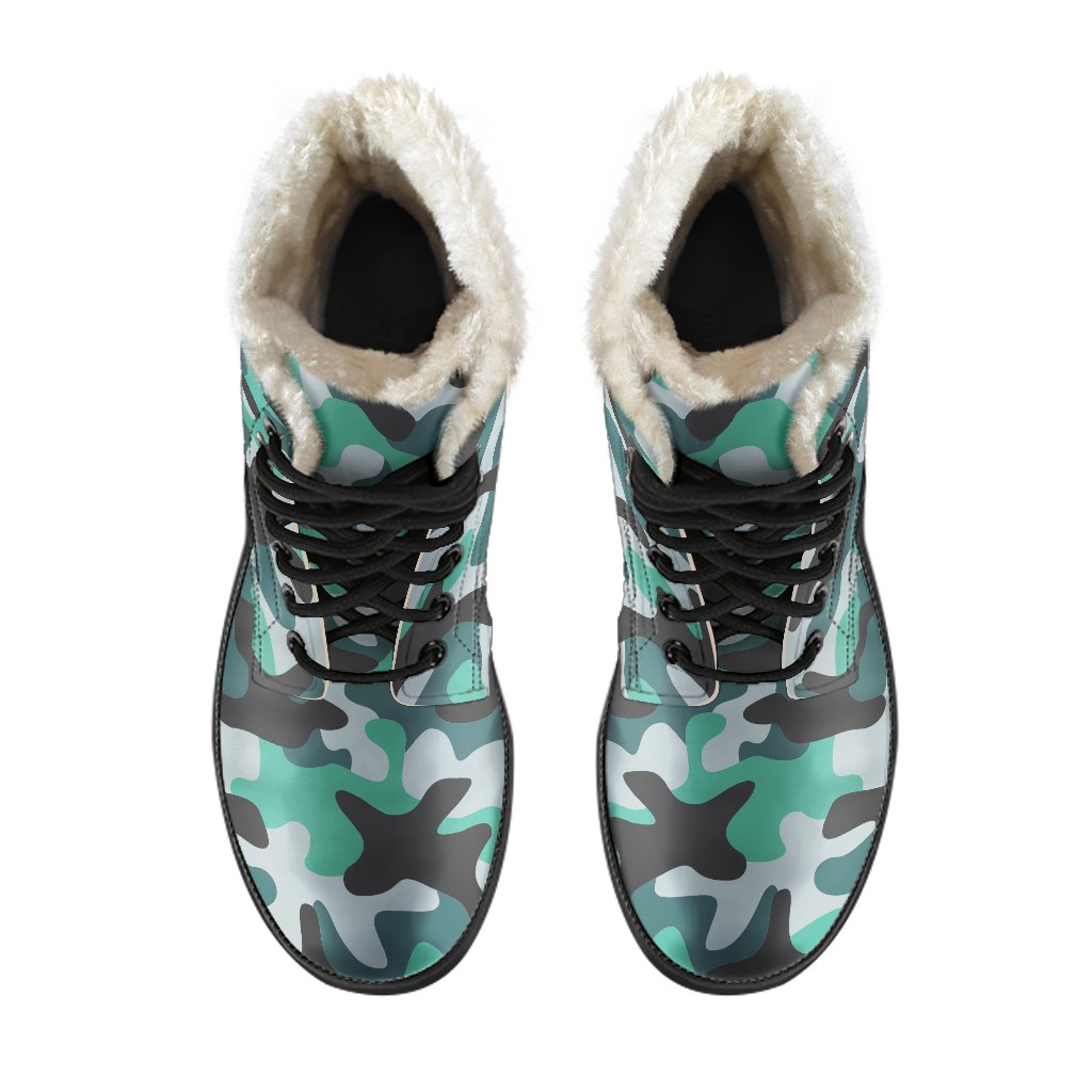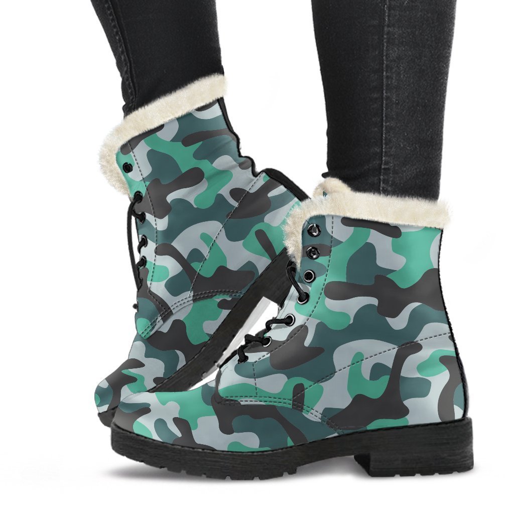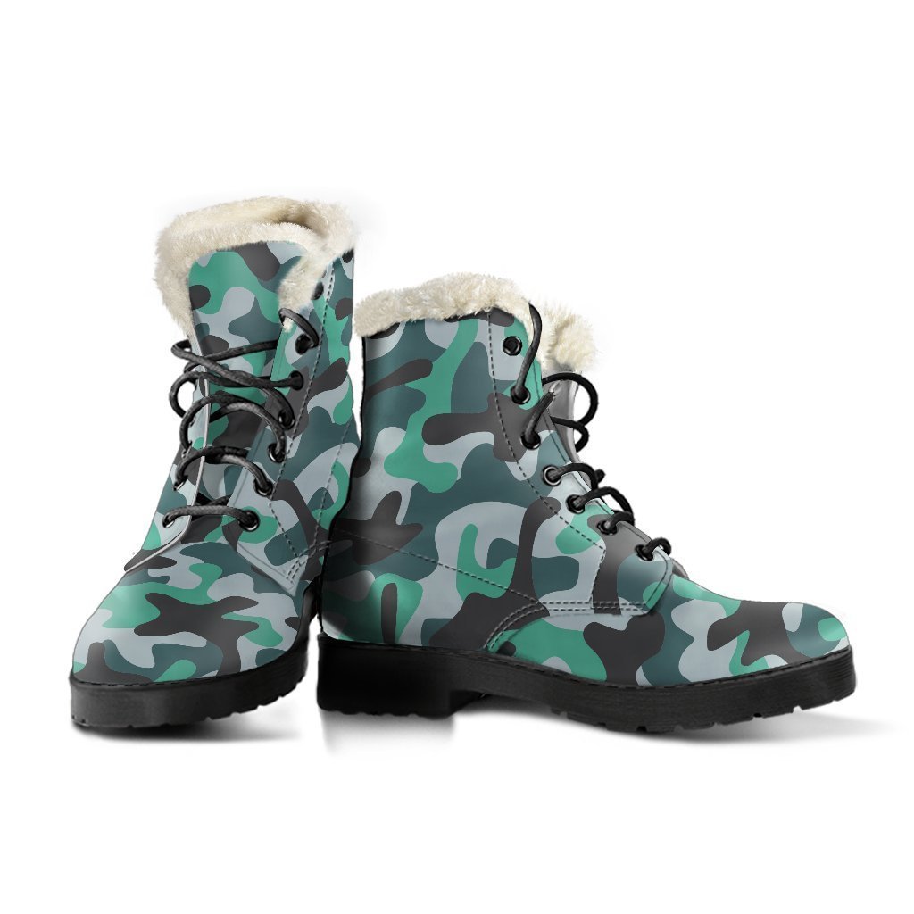 These Teal and Black Camouflage Print Faux Fur Leather Boots are the perfect footwear for any hippie looking to add a touch of unique style to their outfit. The bold teal and black camouflage print gives these boots a funky and vibrant look that is sure to stand out in a crowd. The faux fur lining adds an extra element of comfort and warmth, making them ideal for wearing at outdoor music festivals or just lounging around in style. The durable leather construction ensures that these boots will last through all your adventures, while the lace-up design allows for a customizable fit. Embrace your inner hippie with these eye-catching and trendy boots that are sure to become a favorite in your wardrobe.