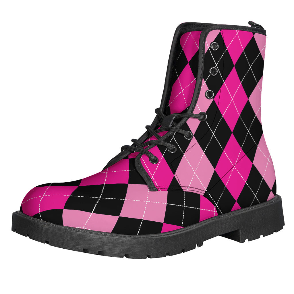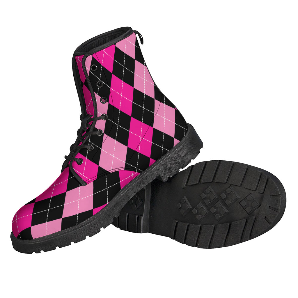 These Black and Deep Pink Argyle Pattern Print Leather Boots are the perfect footwear for hippies looking to add a touch of style to their ensemble. Made from high-quality leather, these lightweight boots are durable and comfortable, making them ideal for everyday wear. The unique argyle pattern print in black and deep pink adds a fun and eye-catching element to these boots, perfect for those looking to stand out from the crowd. Whether you're heading to a music festival, a weekend adventure, or just out and about, these hippie-inspired leather boots are sure to be a hit.