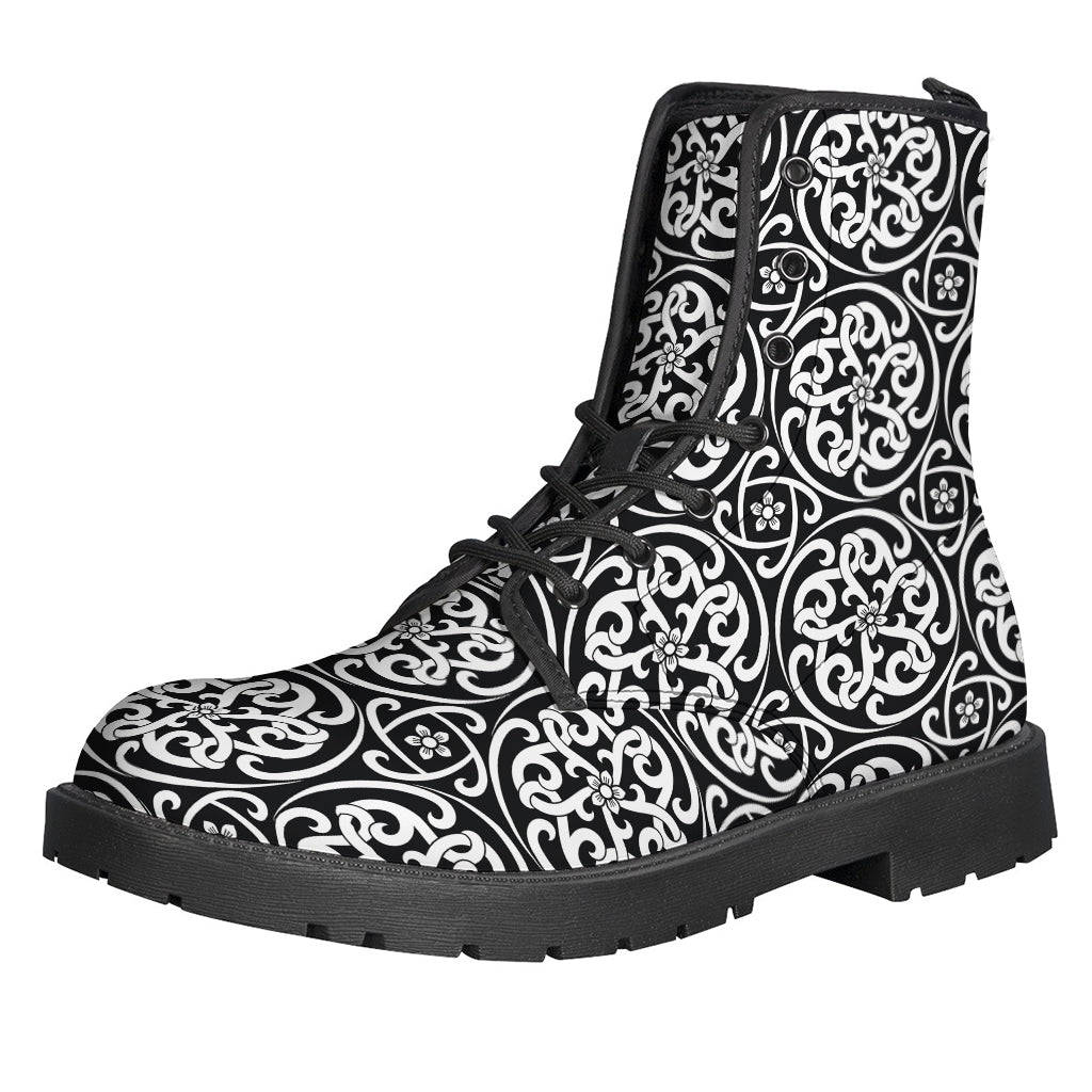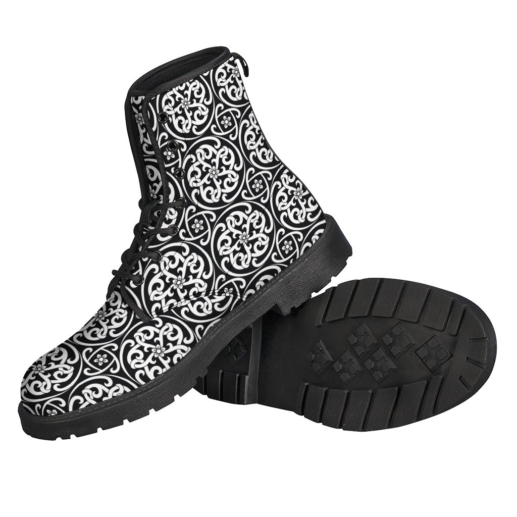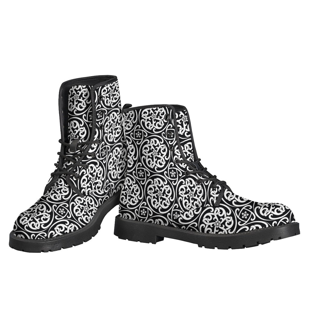 These bohemian-inspired Leather Lightweight Boots are perfect for the free-spirited hippie at heart. Made from high-quality leather, these boots feature a unique black and white Celtic pattern print that adds a touch of retro style to any outfit. With a comfortable fit and durable construction, these boots are ideal for all-day wear whether you're dancing at a music festival or exploring the great outdoors. Embrace your inner hippie and step out in style with these one-of-a-kind Leather Lightweight Boots.