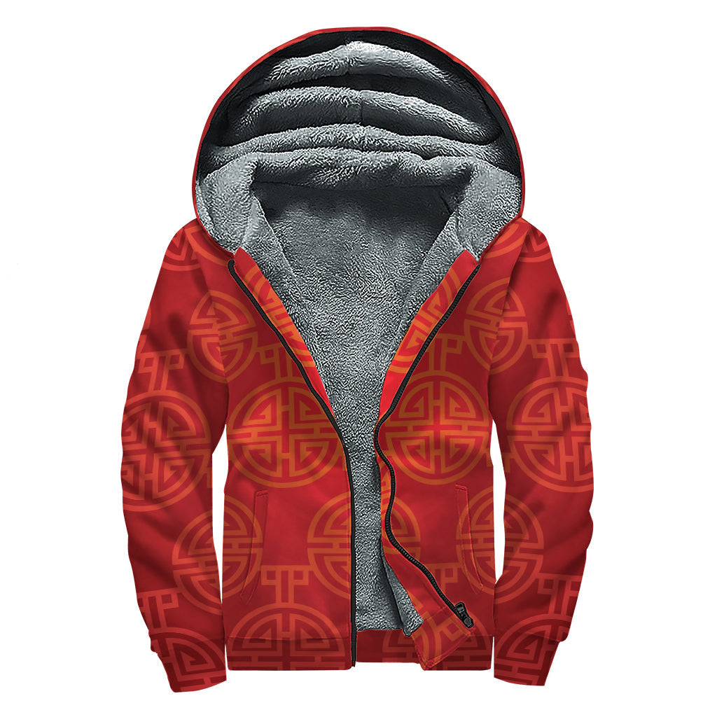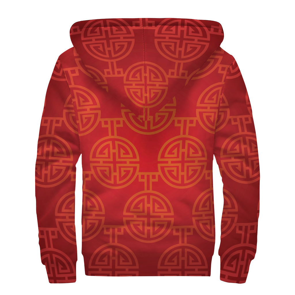 Chinese Lu Symbol Pattern Print Sherpa Lined Zip Up Hoodie: Embrace your Hippie Style