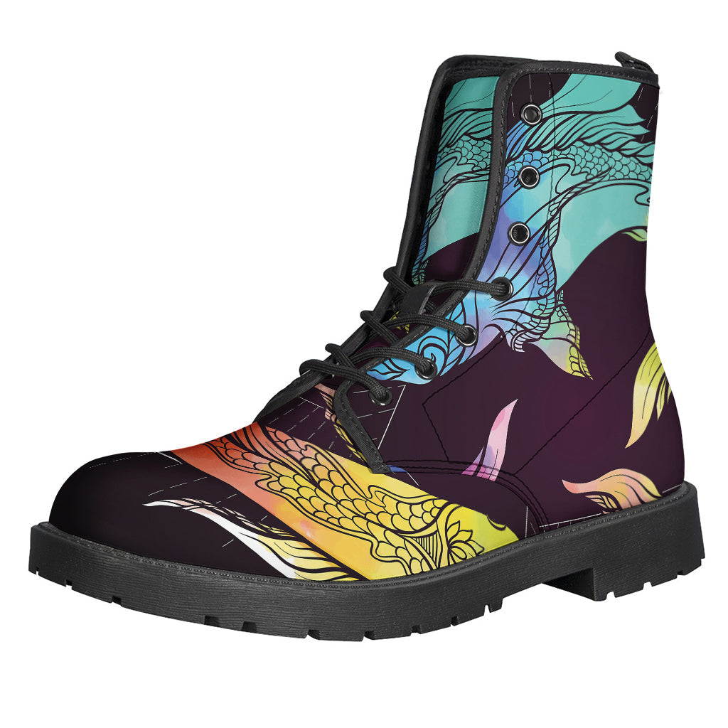 Embrace your inner hippie with these Colorful Pisces Sign Print Leather Boots. Made from lightweight leather, these boots are perfect for those who love to stand out and make a statement with their footwear. The vibrant and colorful Pisces sign print adds a playful touch to these classic lace-up boots. Whether you're attending a music festival or simply want to add a unique touch to your everyday look, these hippie-inspired boots are sure to turn heads wherever you go. Comfortable and stylish, these boots are a must-have for any free spirit looking to add a touch of bohemian flair to their wardrobe.