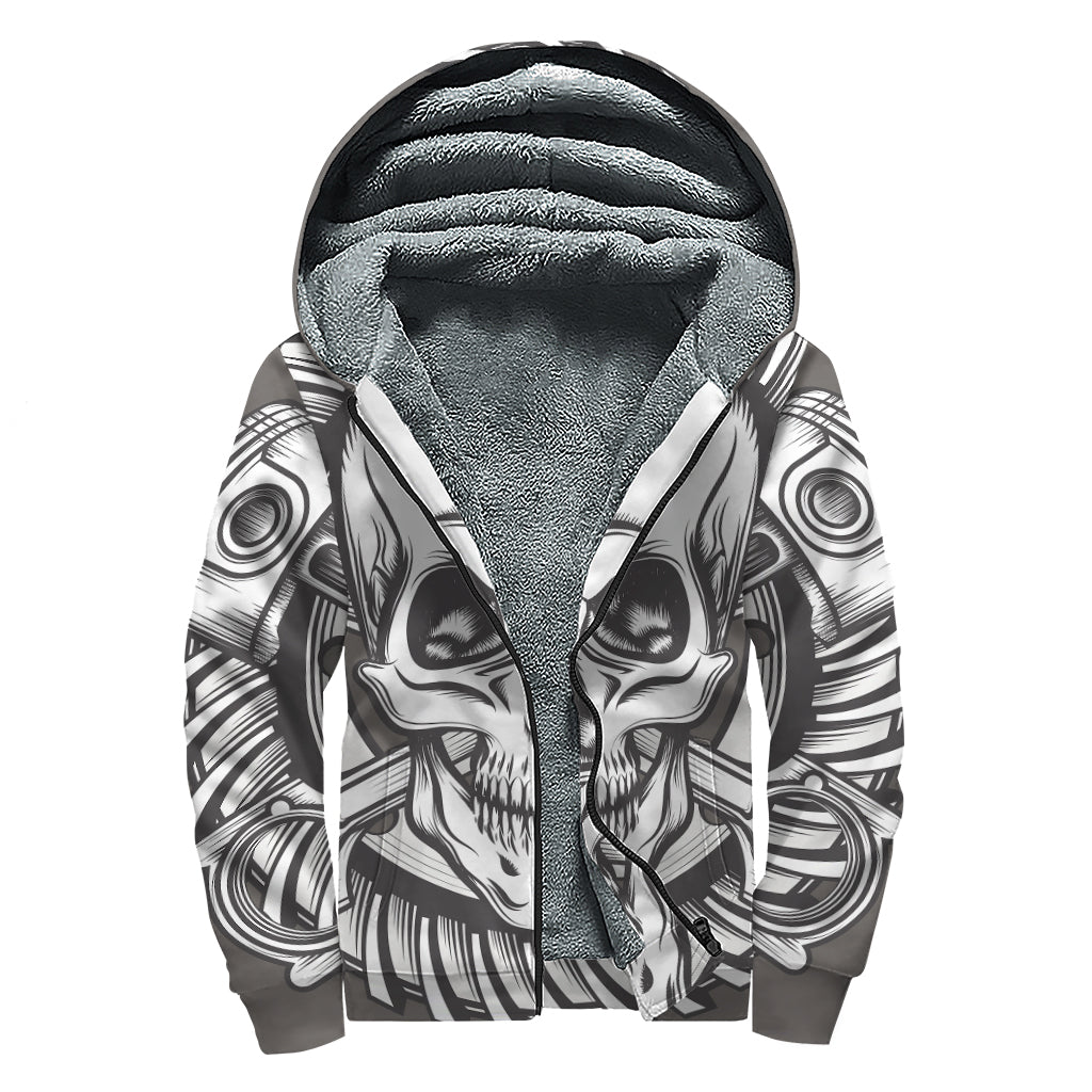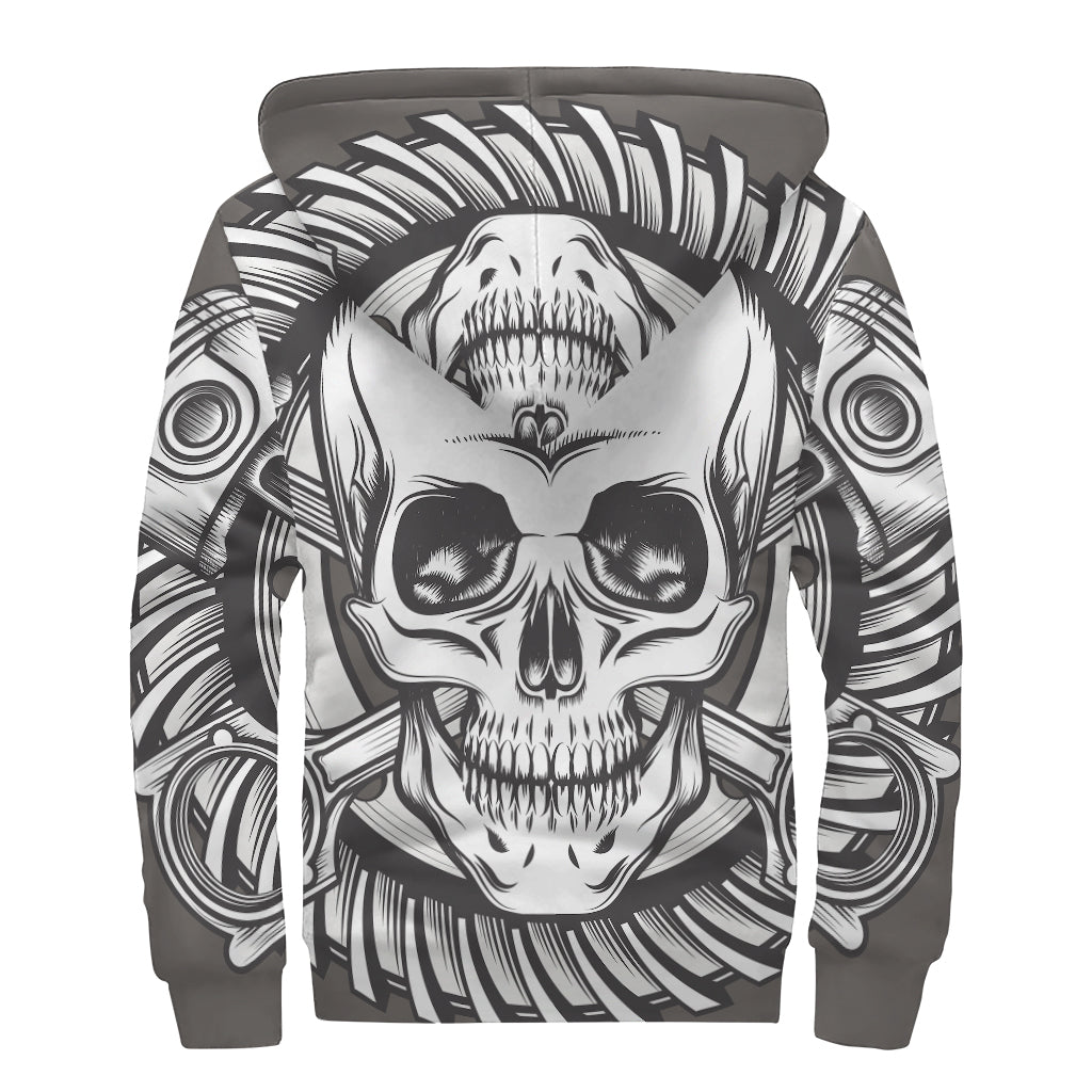 Stay warm and stylish with this Sherpa Lined Zip Up Hoodie from Gear Frost. This hoodie features a unique graphic print of a cross piston mechanic skull, perfect for those who love the hippie style. The Sherpa lining provides extra warmth and comfort, making it perfect for cooler weather. The zip-up design makes it easy to layer over your favorite outfits, while the hood adds a cozy touch. Whether you're hitting up a music festival or just looking to add some edgy style to your wardrobe, this Sherpa Lined Zip Up Hoodie is sure to become a staple in your closet.