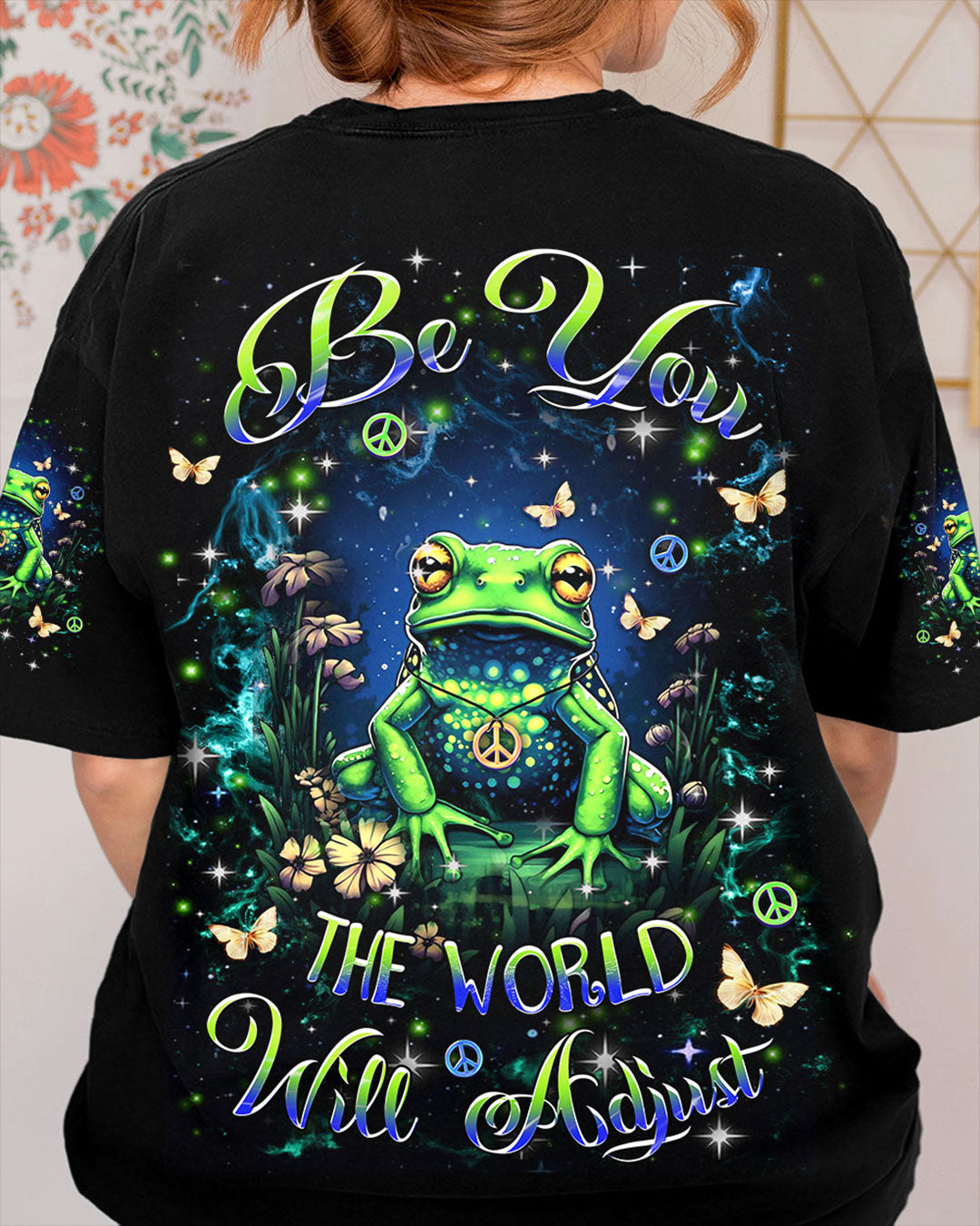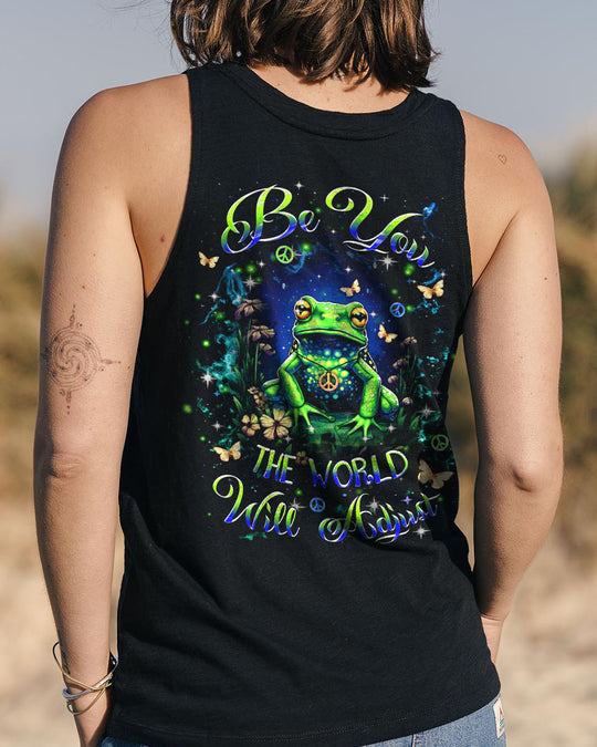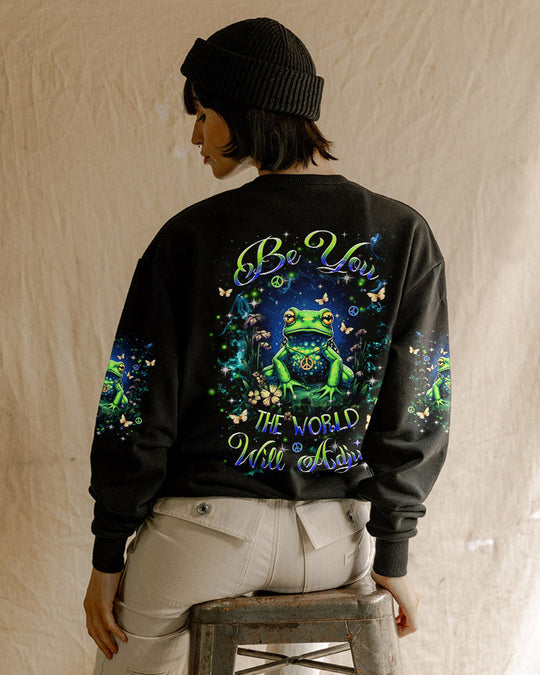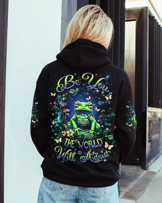 The "Be You, the World Will Adapt" Frog All Over Print shirt radiates a message of authenticity and confidence. Featuring an attractive frog motif throughout, this shirt is designed for comfort and decorated with unique designs. Perfect for those who cherish their uniqueness, it embodies a spirit of playfulness and positivity. Express your personality with this distinctive and expressive piece.