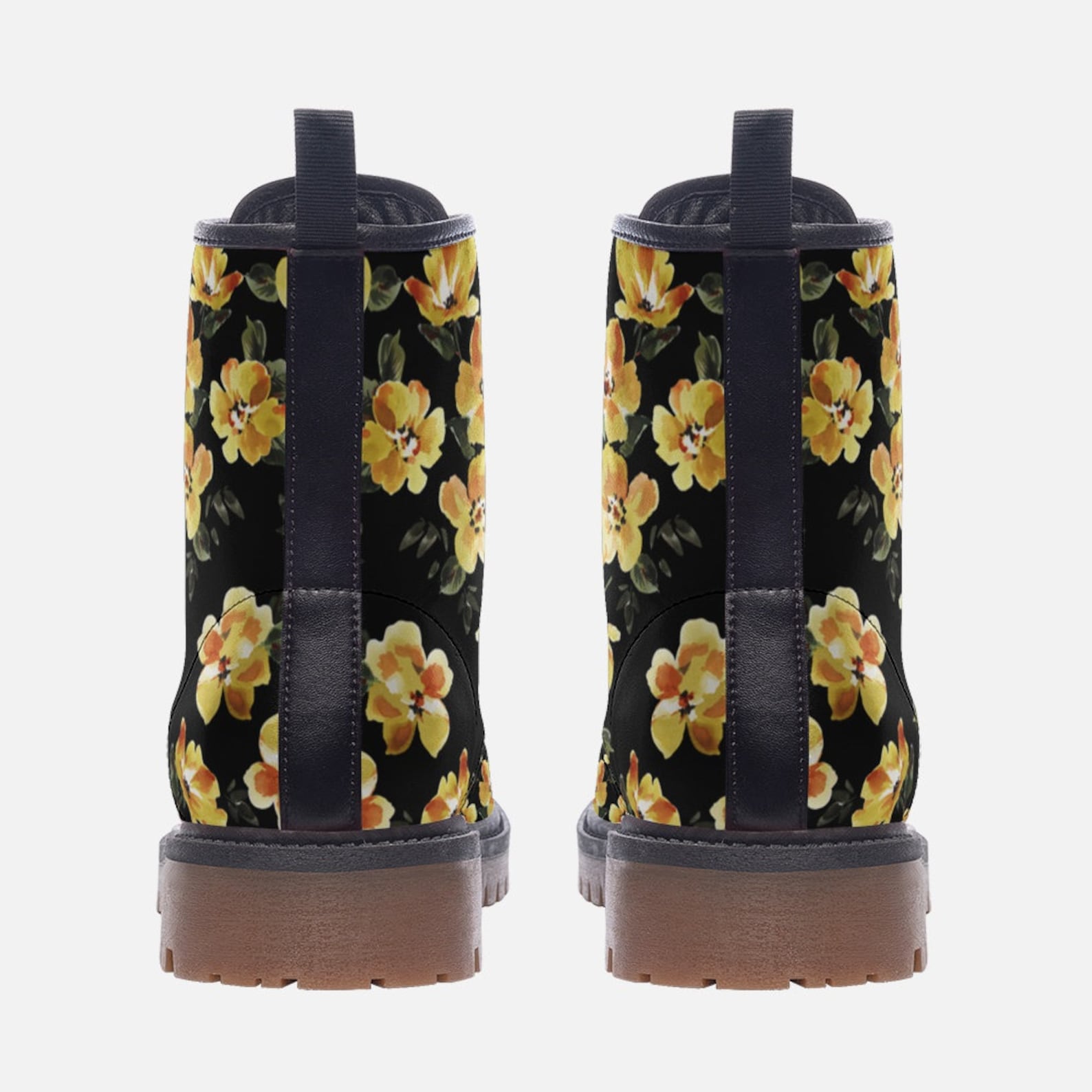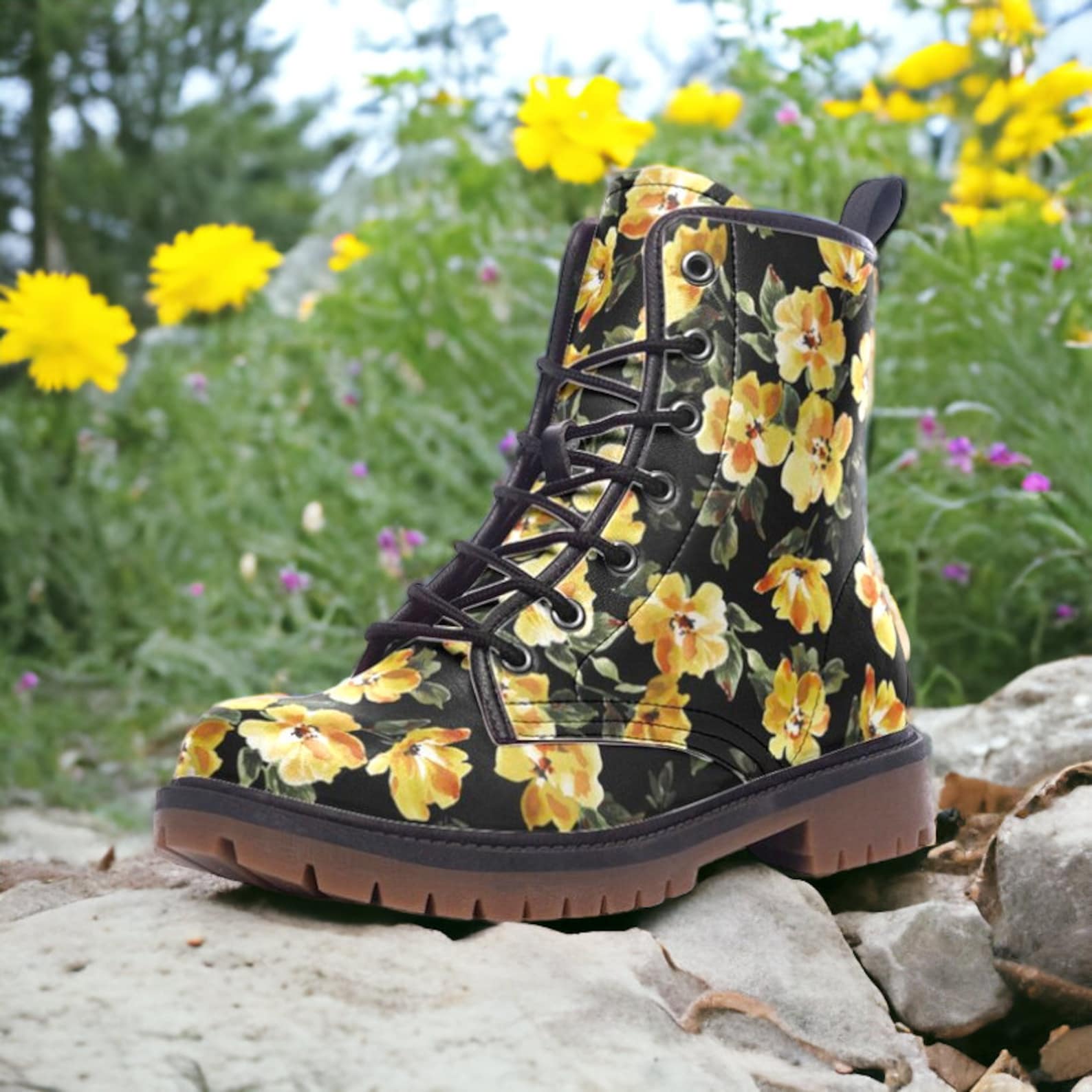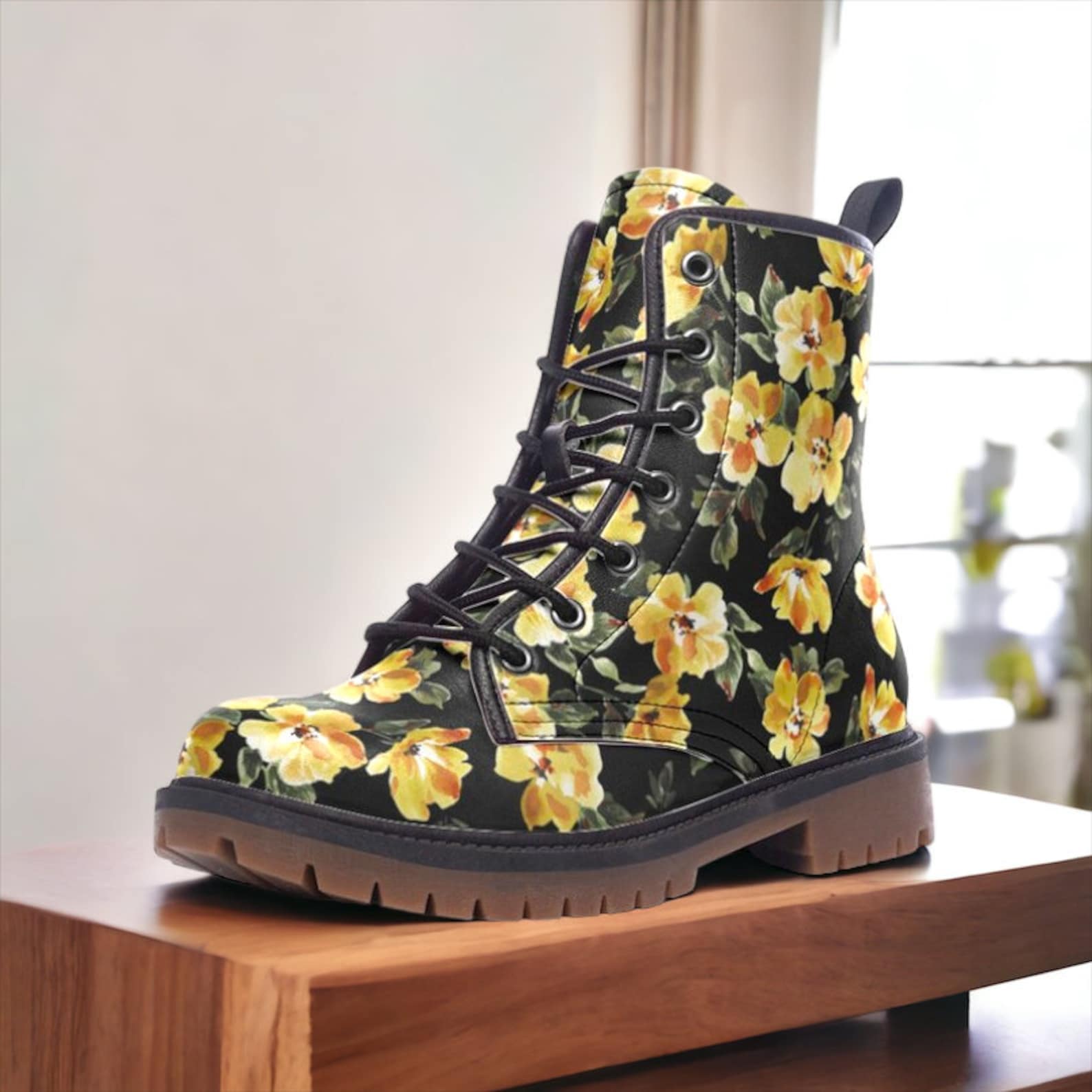 Emerald Blossoms - Black w Yellow Flowers Combat Boots.