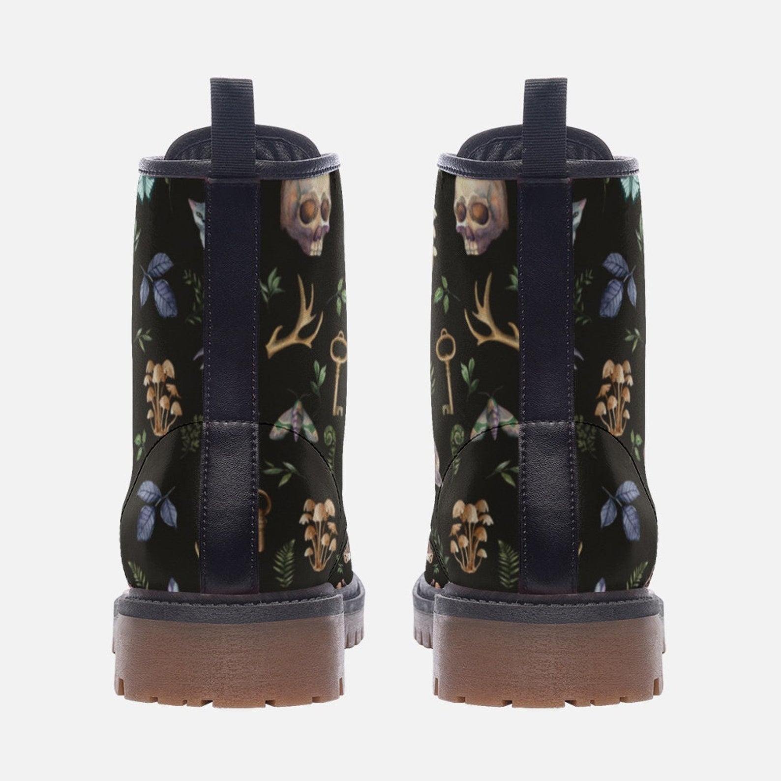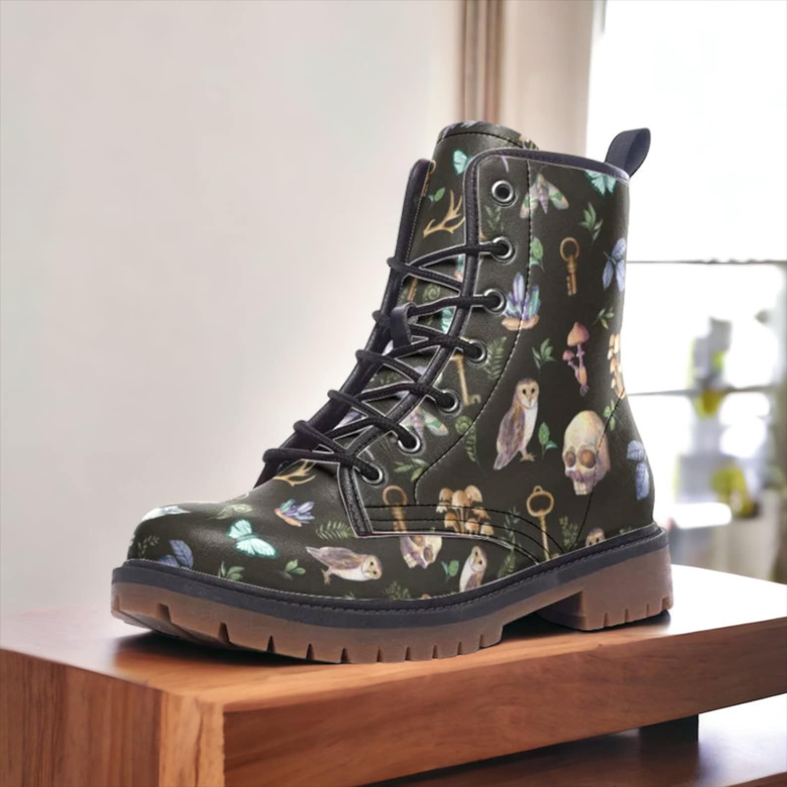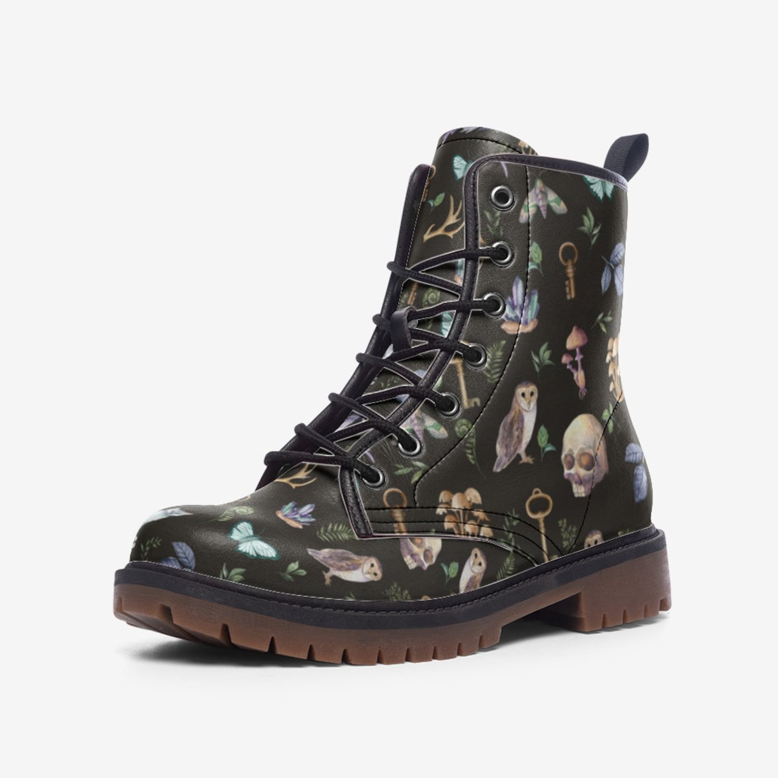 Discover the enchantment of our Skull Witchy Things Vegan Leather Combat Boots. Perfect for those who crave both style and sustainability, these boots combine witchy charm with eco-friendly materials. Enter a mystical world of emerald flowers and skull motifs, adding a touch of darkness to your wardrobe. Ideal for environmentally conscious fashionistas who want to express their individuality with every step.