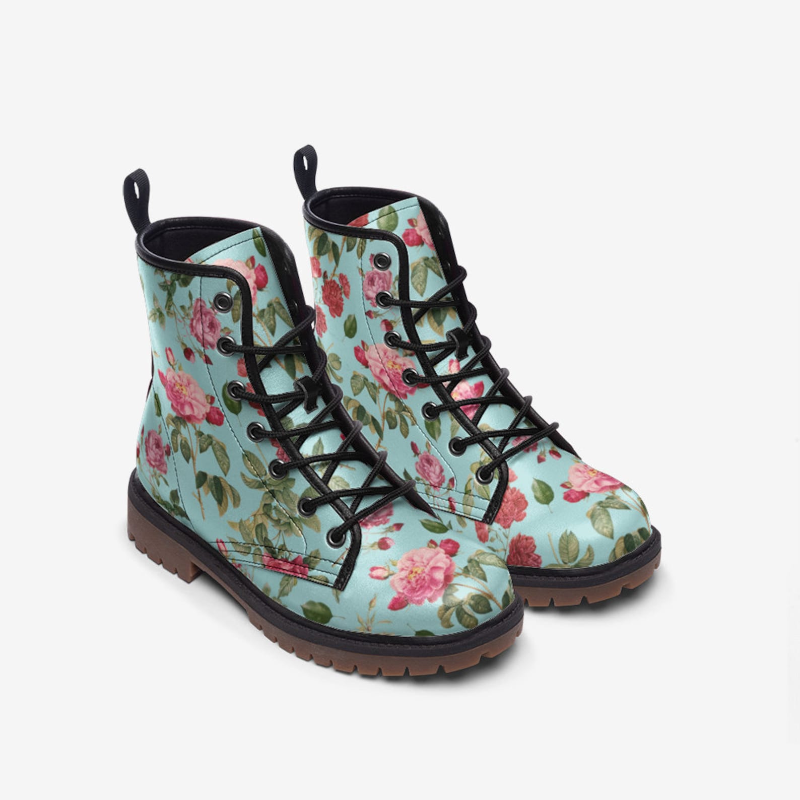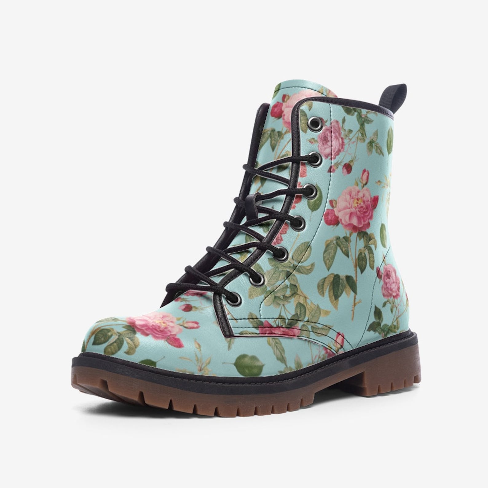 Emerald Blossoms Boots - Pink & Blue Floral Vegan Leather Combat Boots For Hippies