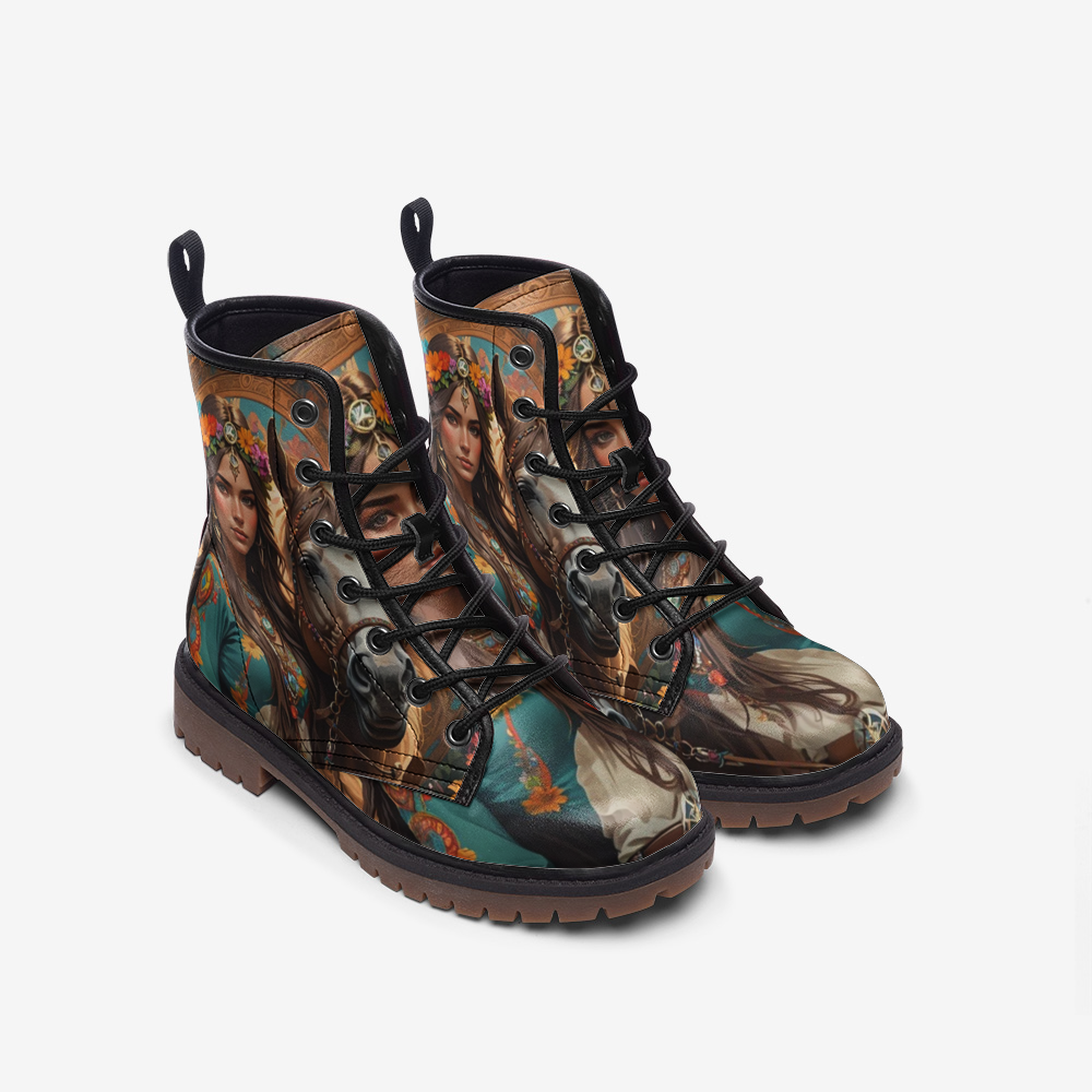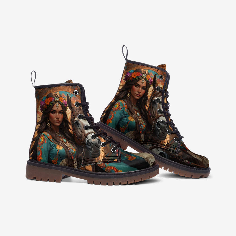 Discover the essence of free-spirited style with the new design from Emerald Blossoms: Brave Bohemian Girls. These lightweight casual leather boots are crafted for the modern hippie, combining casual comfort with vibrant handcrafted details. Each boot tells a story of adventure and individuality, with intricate floral prints and earthy tones that celebrate your unique journey. Perfect for festivals, road trips or everyday wear, these boots are designed to inspire and enhance your bohemian style. Embrace the spirit of adventure with every step!