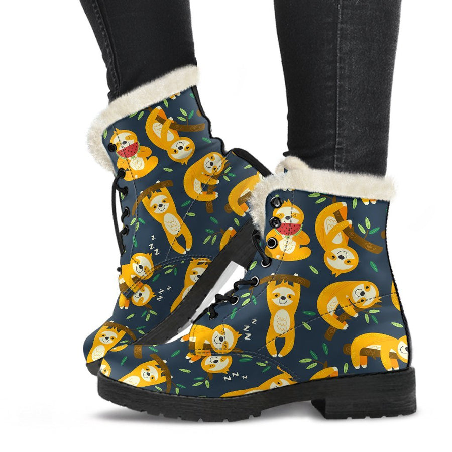 Cute Sloth, Vintage Vibes Print Comfy Faux Fur Boots For Holiday Season