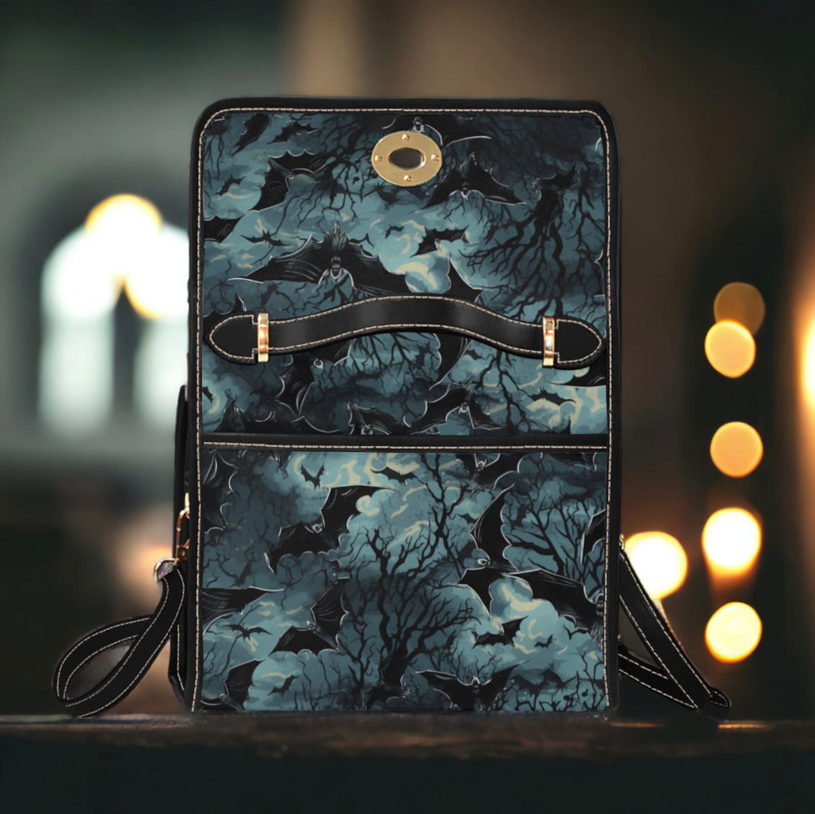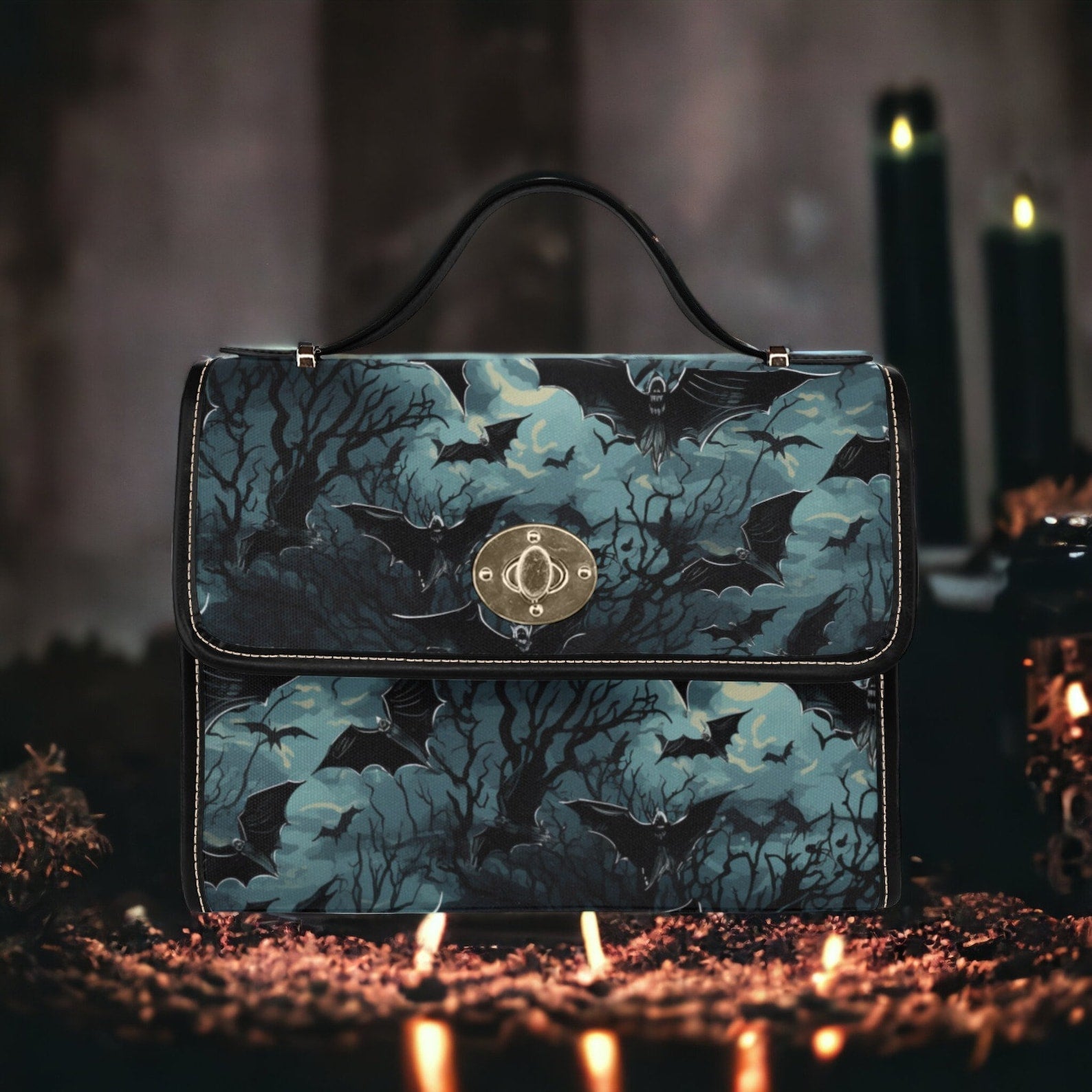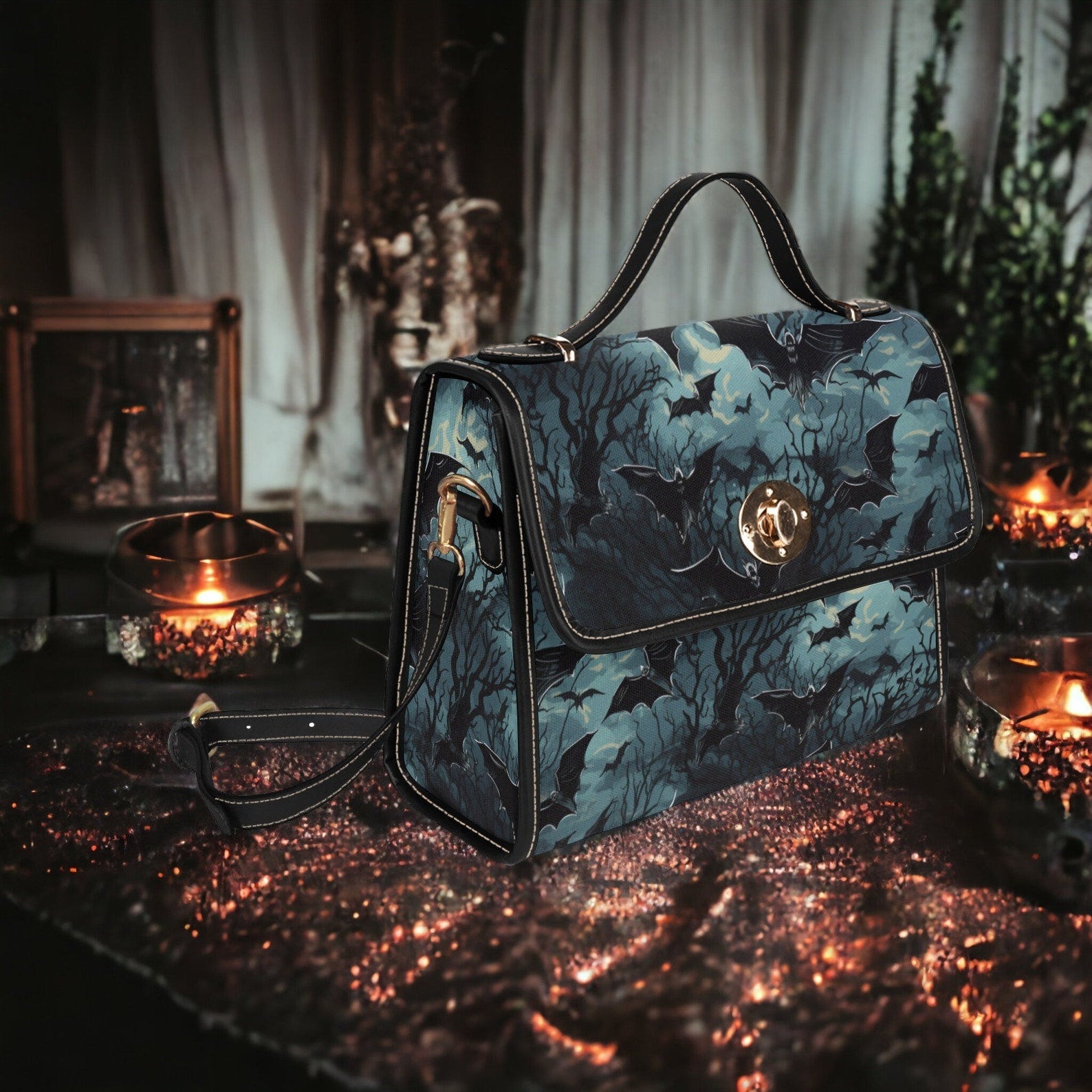 Capture the magic of Dark Academy with our Gothic Spooky Bat-Flying Night Satchel. Adorned with a design of hauntingly beautiful flying bats against a midnight background, this bag combines whimsical charm with practicality. Crafted from durable canvas, this is the ideal bag for carrying your essentials in style, whether you're wandering the halls of academia or exploring misty streets under bright skies moon. moon. Perfect for those who appreciate mystery in their everyday outfits.