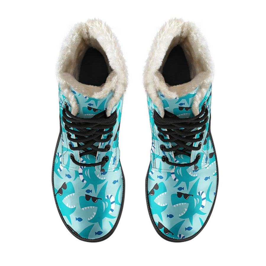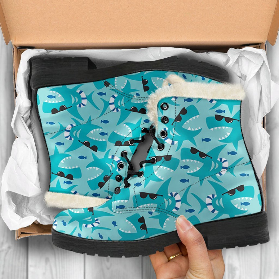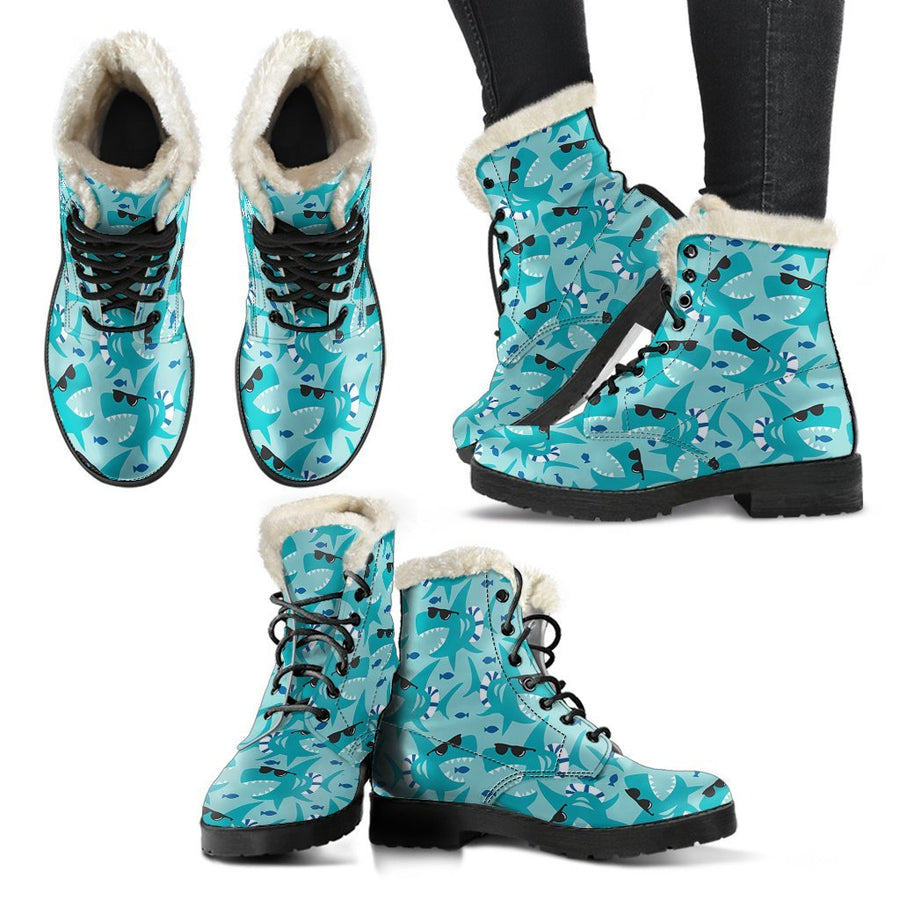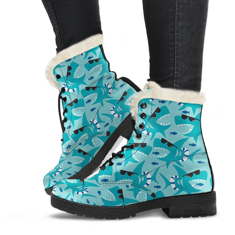 Emerald Blossoms - Deep Sea Shark, Vintage Vibes Print Comfy Faux Fur Boots For Holiday Season