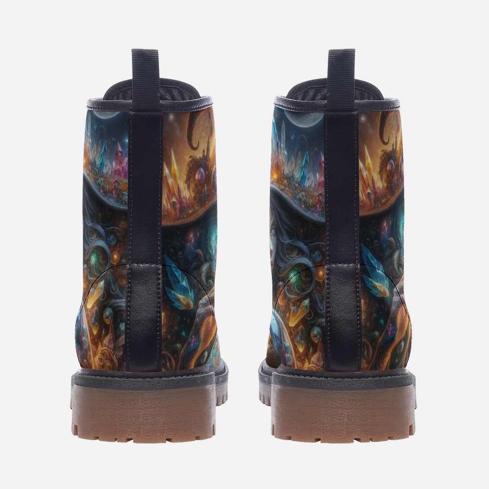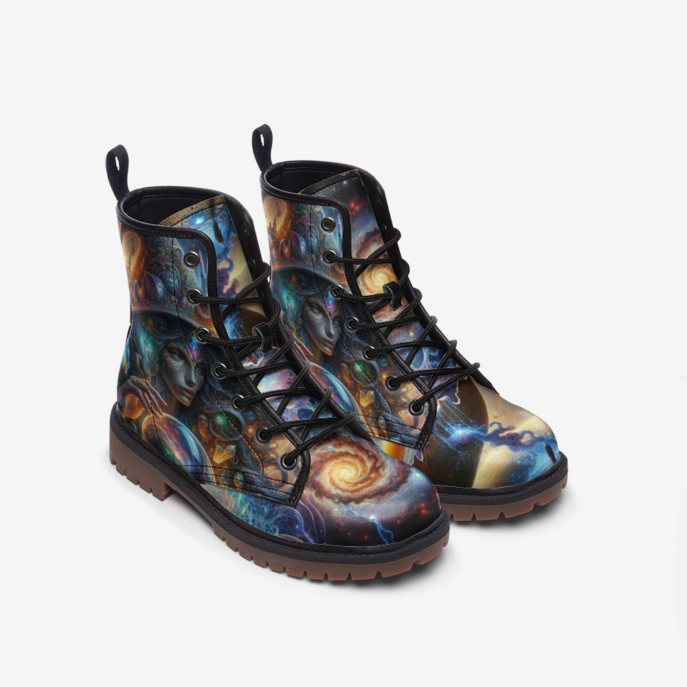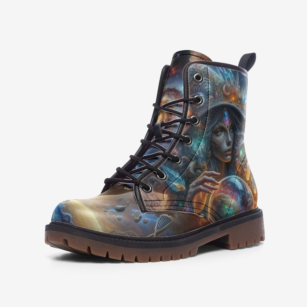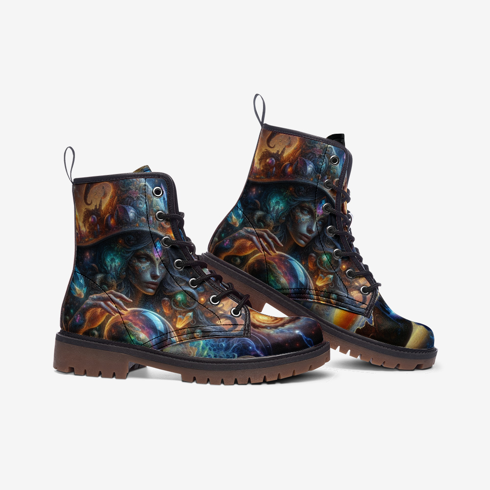 Explore the cosmos with our Galactic Hippie Witch vegan leather boots. This captivating design showcases a free spirited witch floating among the stars of the Milky Way, blending magic with the wonder of the cosmos. Perfect for boho souls and stargazing dreamers, these boots are crafted from eco-friendly vegan leather for comfort and durability. Step into the cosmos with every step, exuding both witchy vibes and celestial energy.