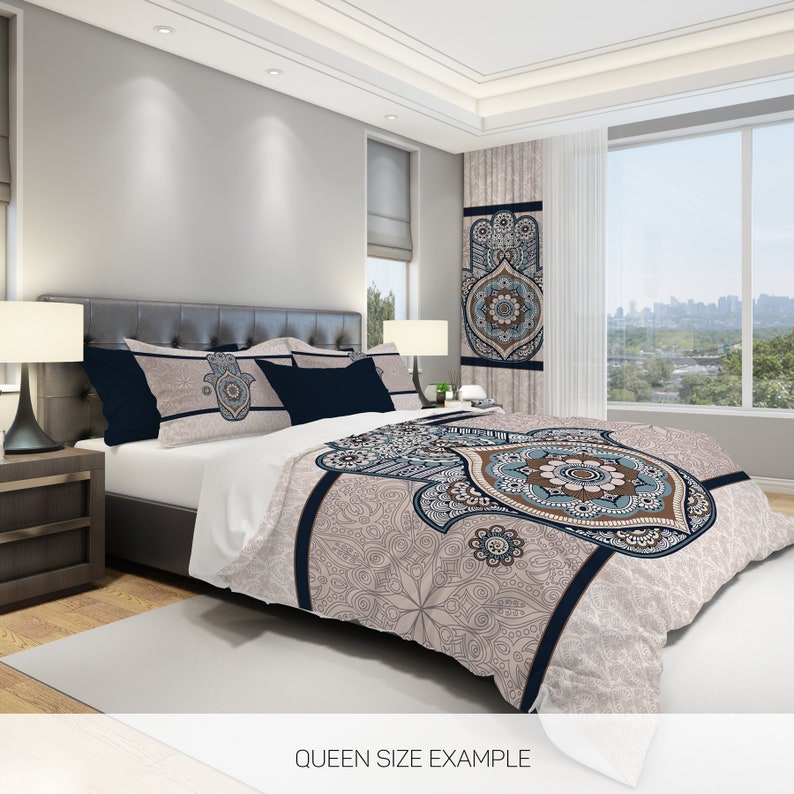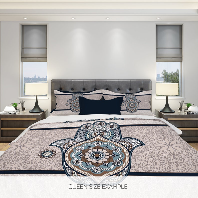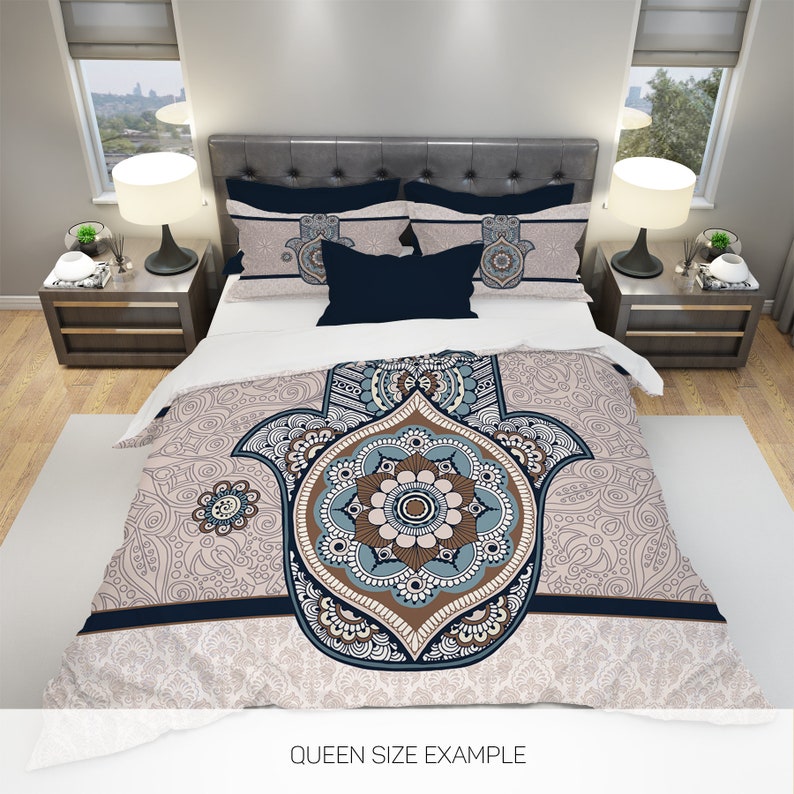 Transform your bedroom with the Hamsa Mandala Bedding Set, designed for the free-spirited. The set features the protective Hamsa symbol interwoven with intricate mandala motifs, bringing spiritual meaning and artistry to your space. Crafted from soft, high-quality fabrics, it ensures cozy comfort while adding a touch of bohemian elegance to your room.