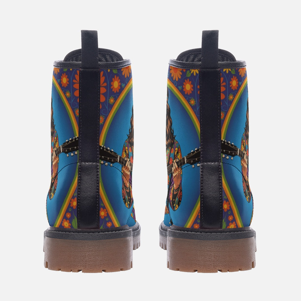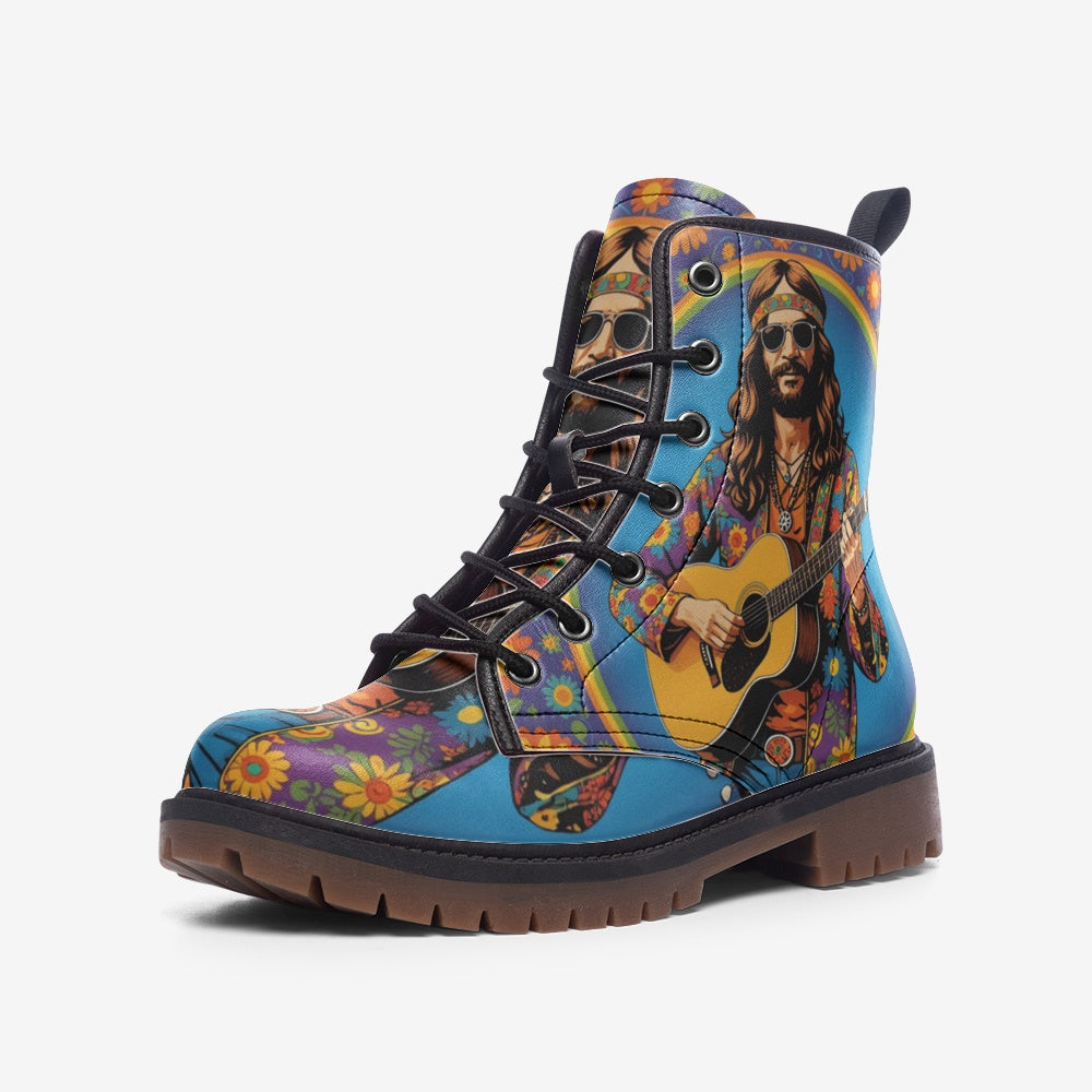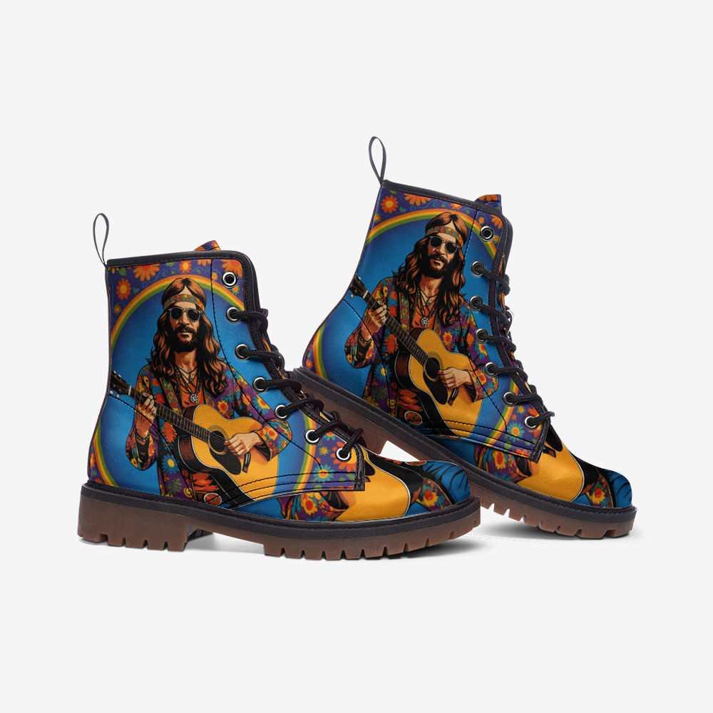 Celebrate your free spirit with the Hippie With The Guitar Casual Leather Boots from Emerald Blossoms. These lightweight, casual boots feature a unique guitar-themed design that matches your love of music and adventure. Crafted from premium leather for durability and comfort, they are perfect for those who live life with a melody in their hearts. Step out in style and let your inner hippie shine with every step.