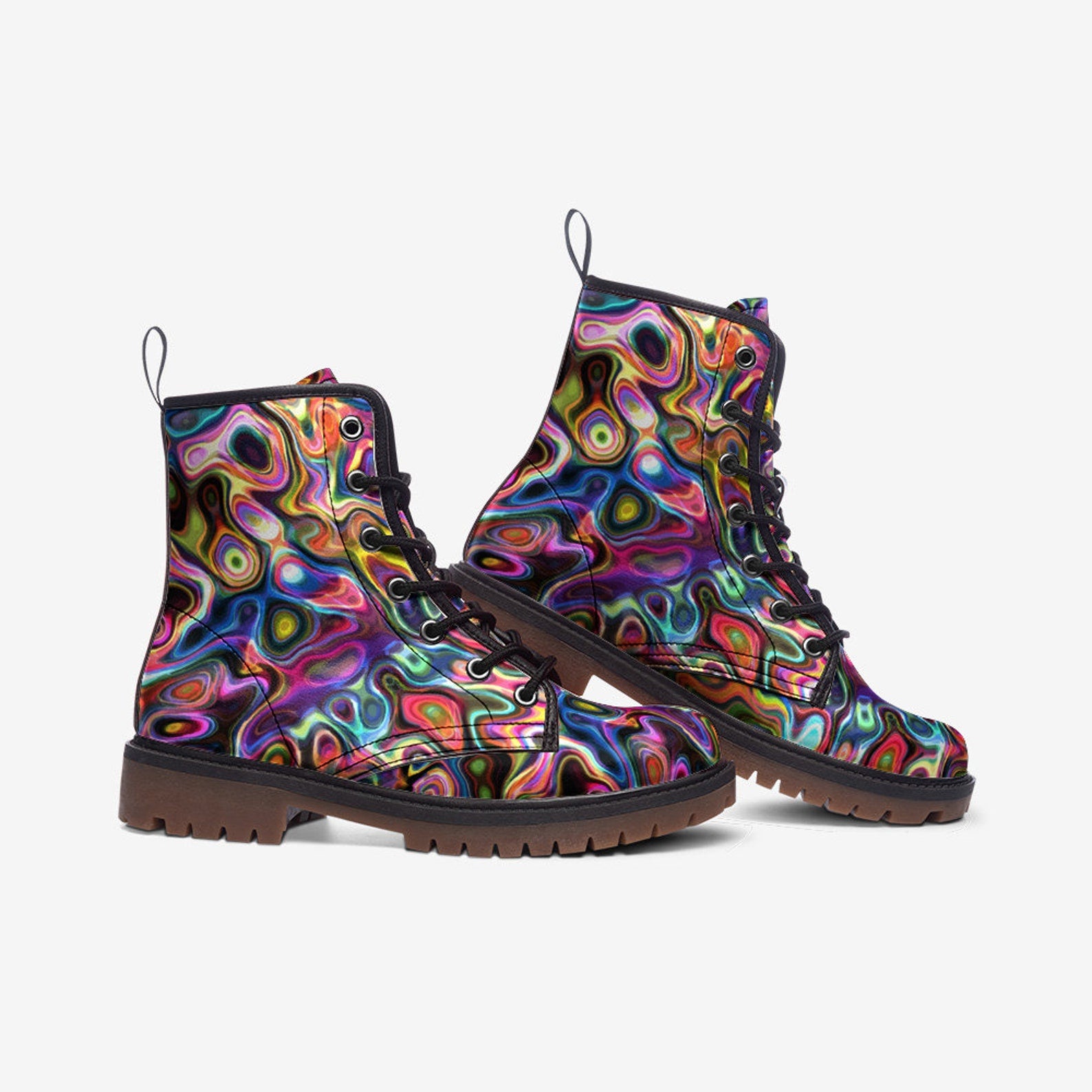 Unleash your inner star with the Hollywood Nights Vegan Leather Combat Boots. Crafted from luxurious vegan leather, these boots feature a striking combat design with a lace-up front and durable, rugged sole. Perfect for adding a personal touch to any outfit while being eco-friendly, they're both stylish and sustainable.