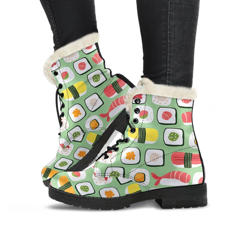 Emerald Blossoms - Kawaii Japanese Sushi Print Comfy Faux Fur Boots For Winter Season