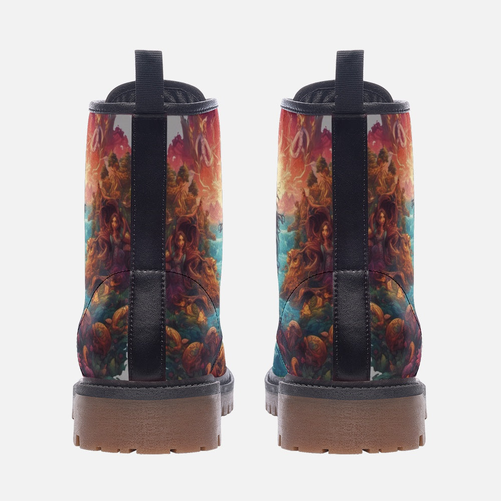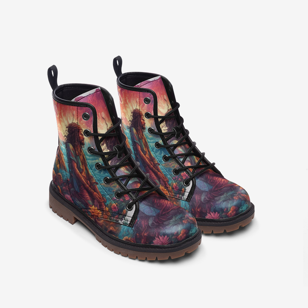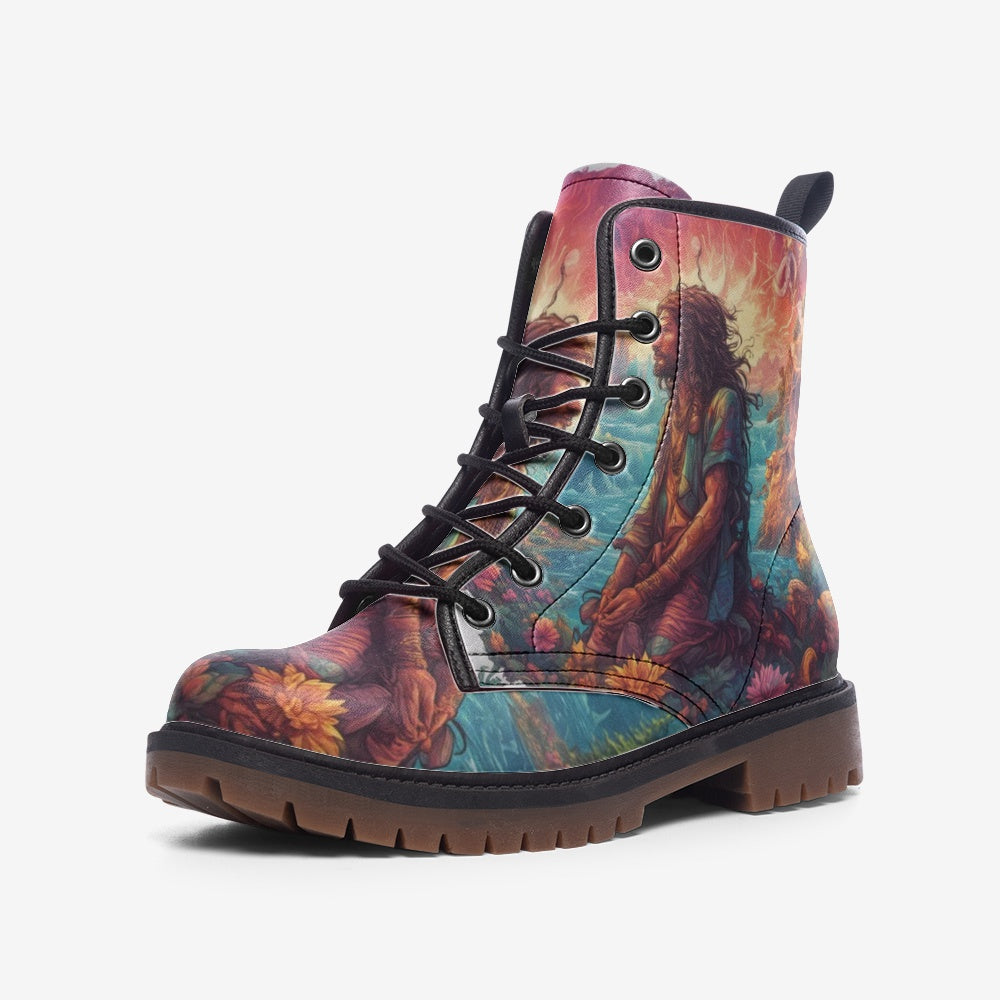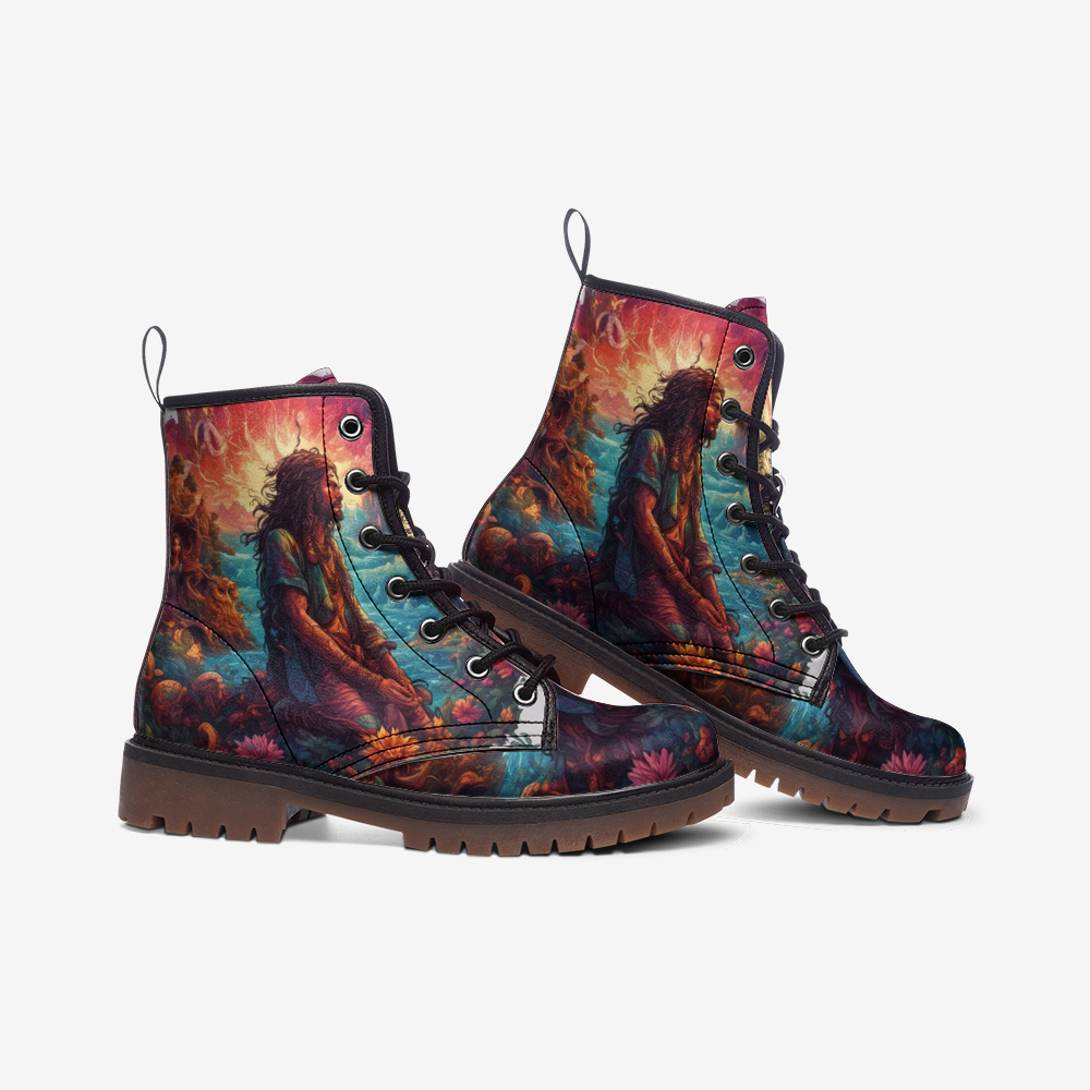 Introducing our lightweight Leather Boots, designed to embody serenity and contemplation for free-spirited hippies. Each pair features a minimalist yet profound design of a kneeling man, exquisitely crafted in genuine leather.