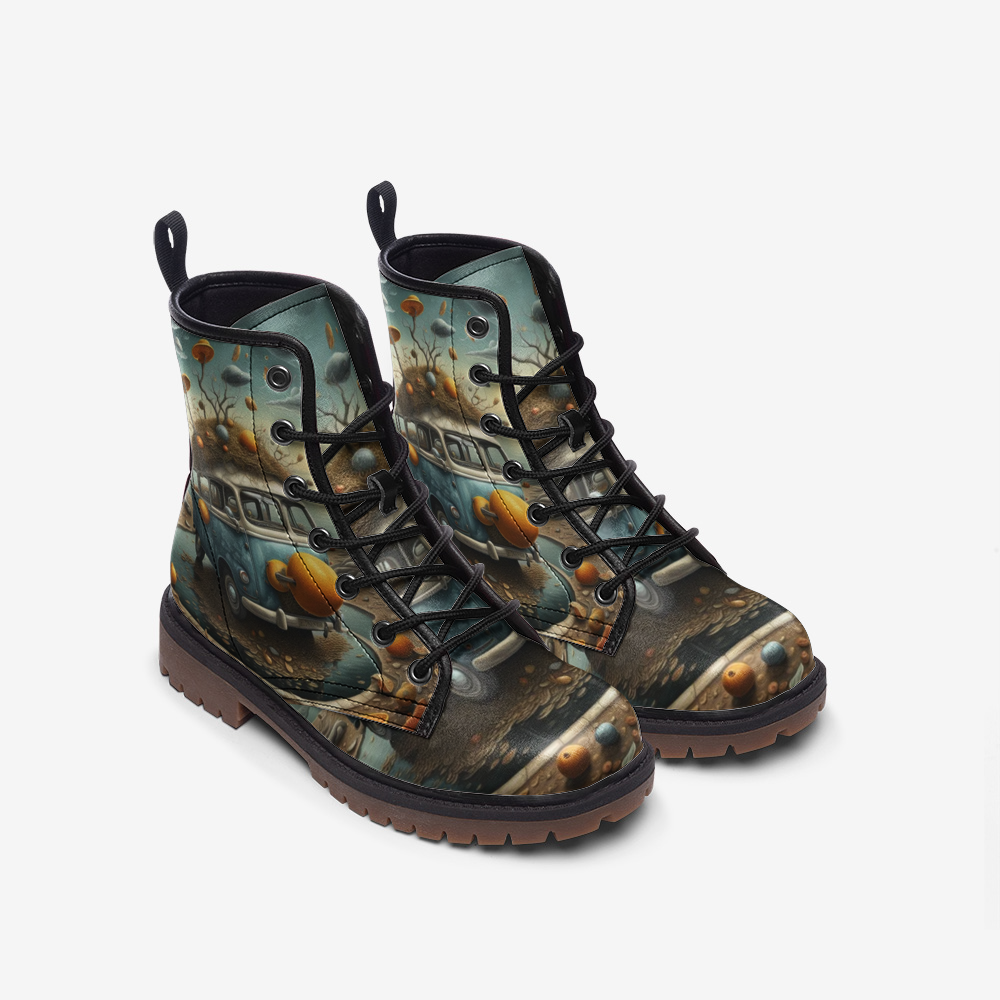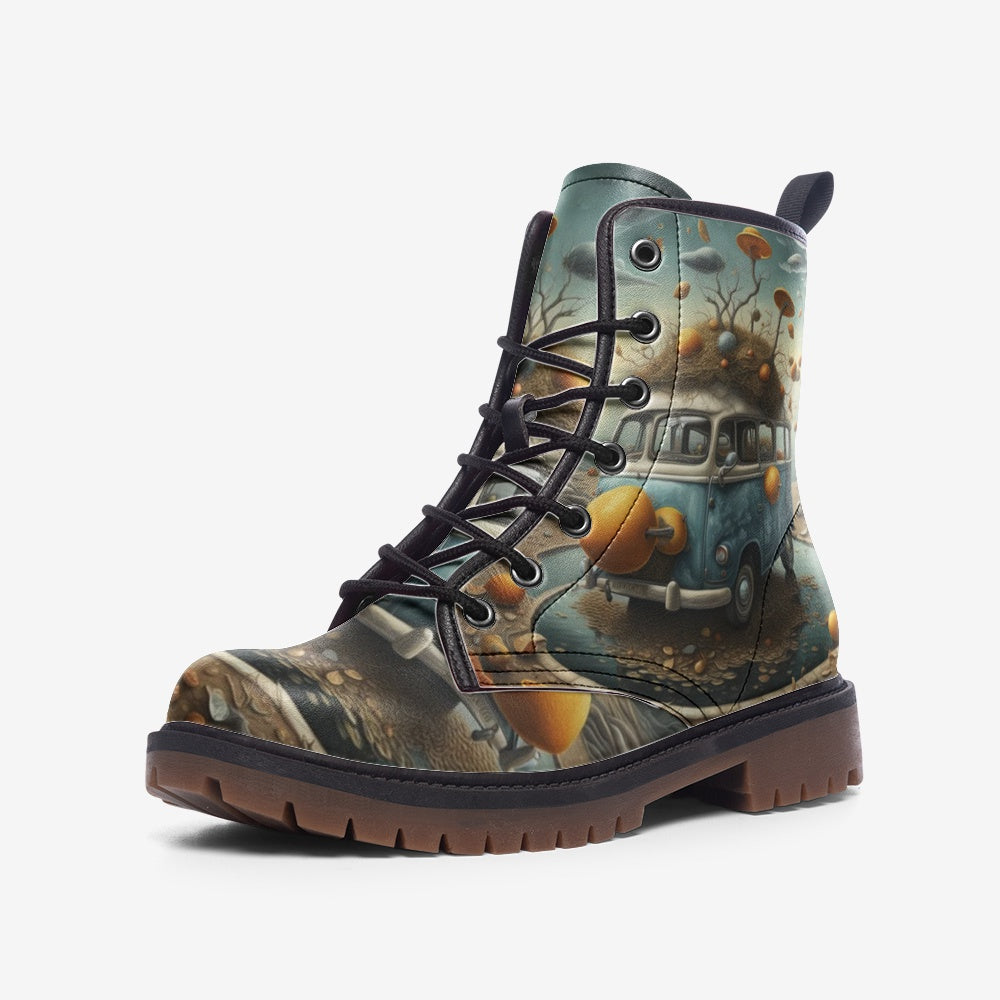 Hit the road in style with Emerald Blossoms' Road Trippin' Hippie Van Casual lightweight leather boots for the adventurous. These boots embody the spirit of exploration and freedom, featuring a unique hippie van design on a premium leather base. Designed for comfort and durability, the shoe features a lightweight construction, a reliable non-slip sole that provides stability on a variety of terrains, and a breathable lining that keeps you cool and comfortable during throughout the journey. Whether you're hiking through the woods, exploring new cities, or simply strolling around town, these boots combine functionality with a distinct bohemian flair. Enhance your adventurous spirit and embark on new horizons with Emerald Blossoms Road Trippin' Boots.