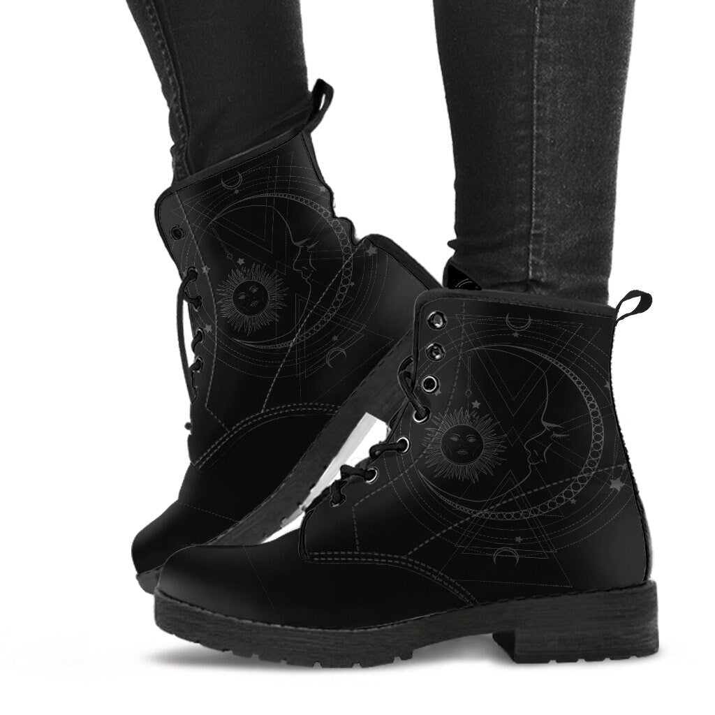 Emerald Blossoms - Sun And Moon Sacred Geometry Gray Fur Vegan Leather Boots, Unique Vegan Boots For Winter Season