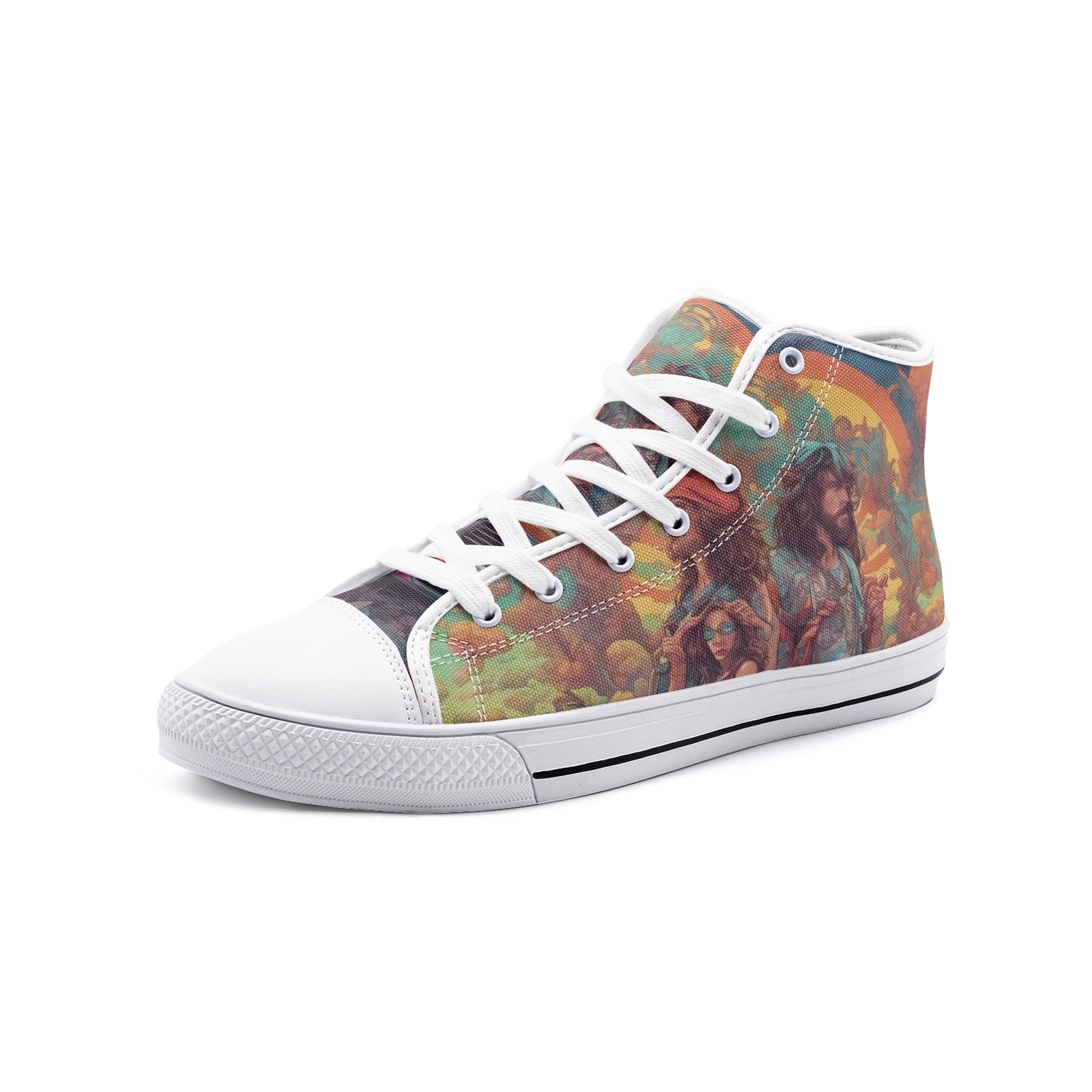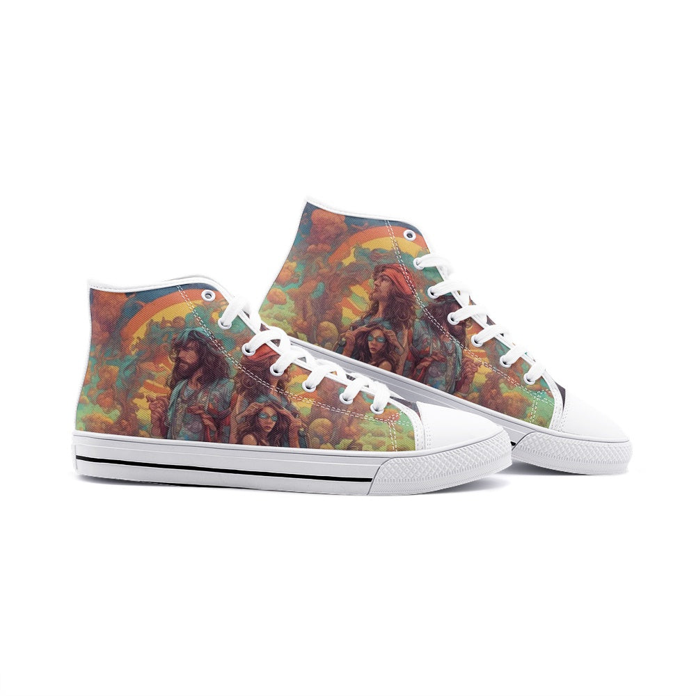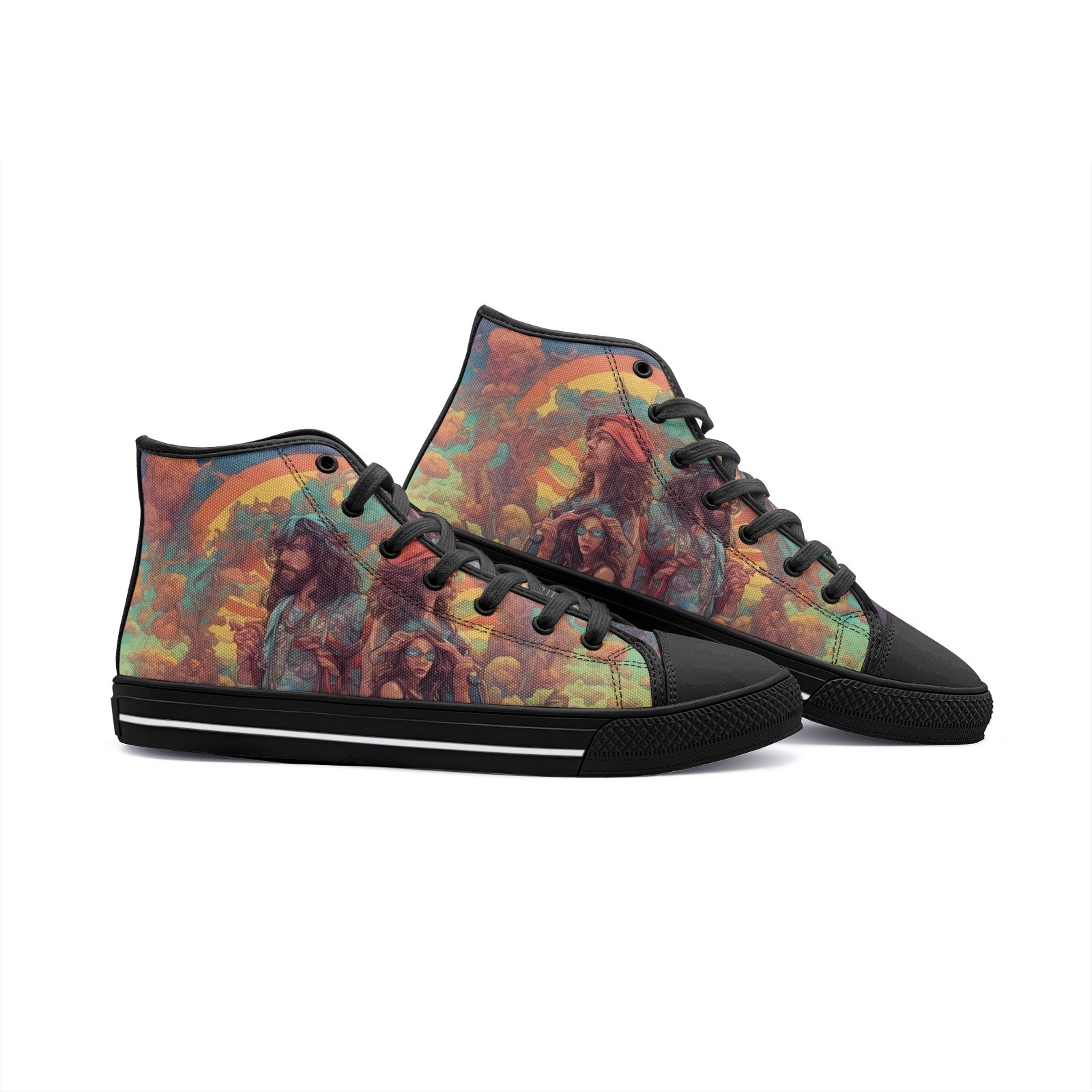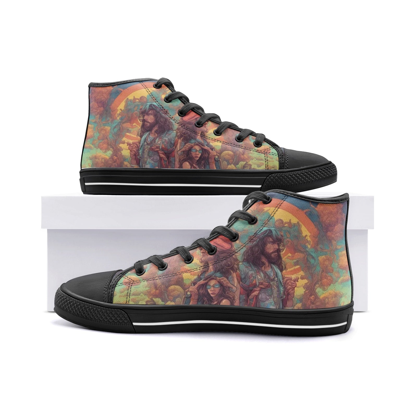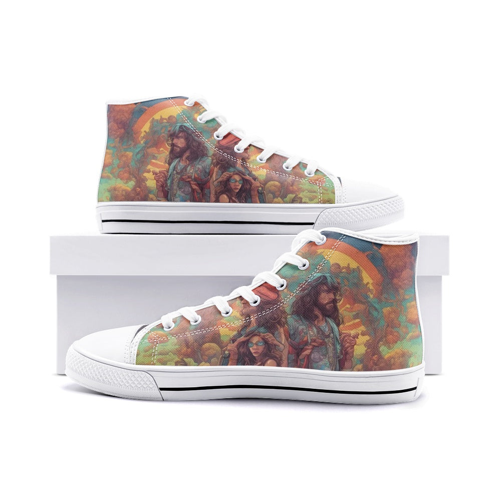 Celebrate your authentic spirit with the Emerald Blossoms The Real Hippie Tribe Retro Color Unisex Canvas High Top. Featuring a vibrant, retro-inspired design that pays homage to the classic hippie aesthetic, these high tops offer a bold splash of color and are reminiscent of iconic styles from the past. Crafted for comfort and durability, they are perfect for those who embrace a free-spirited lifestyle and want to express their individuality. Step out in style and join the true hippie community with shoes that are as unique and vibrant as you are