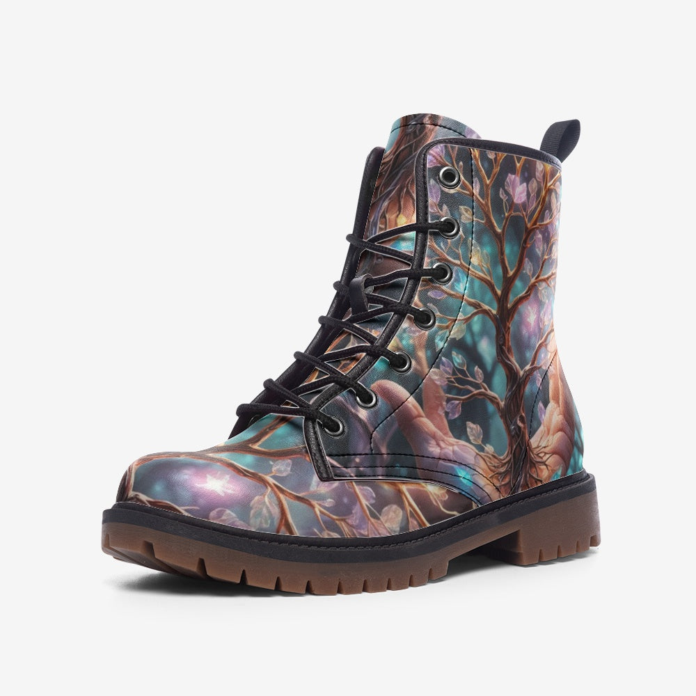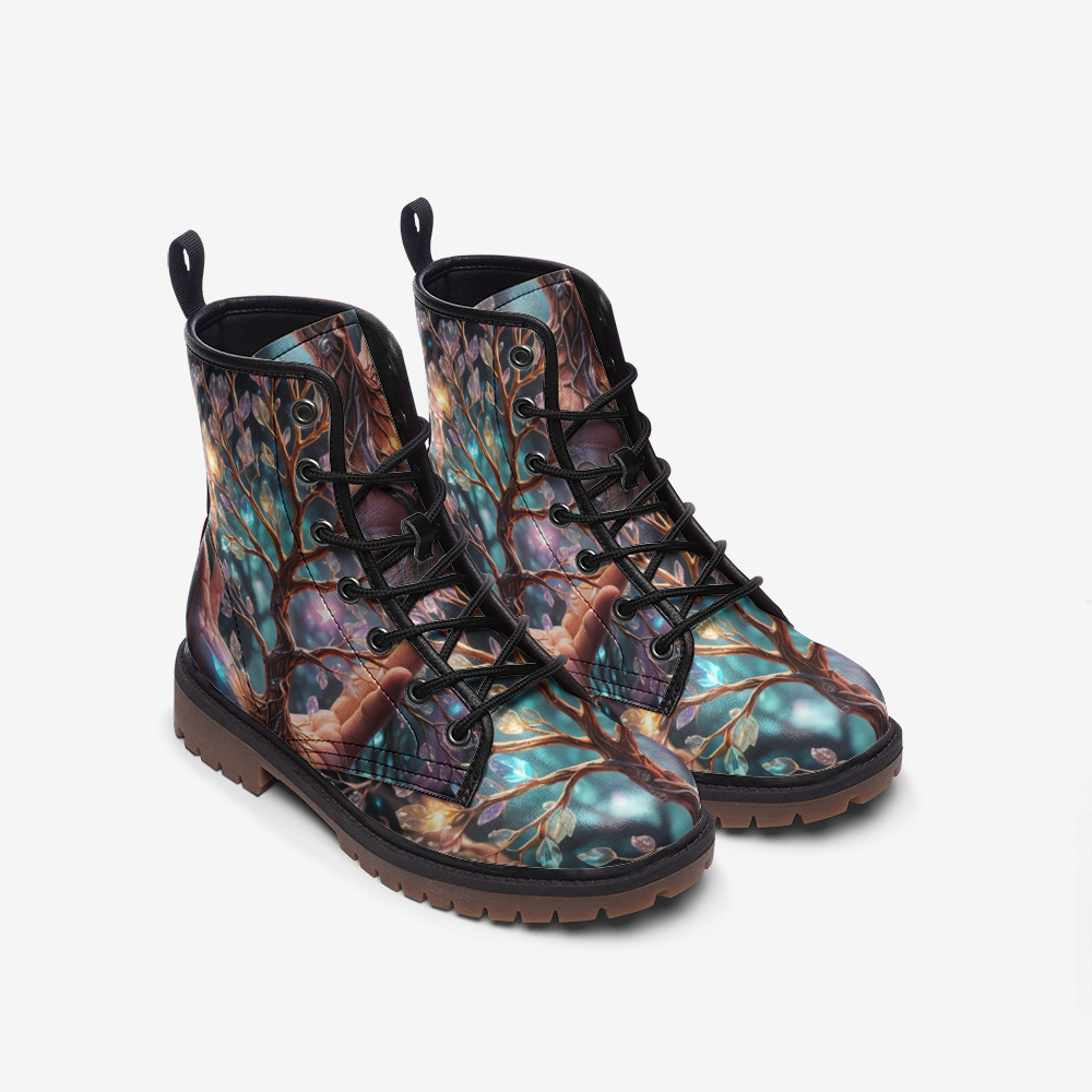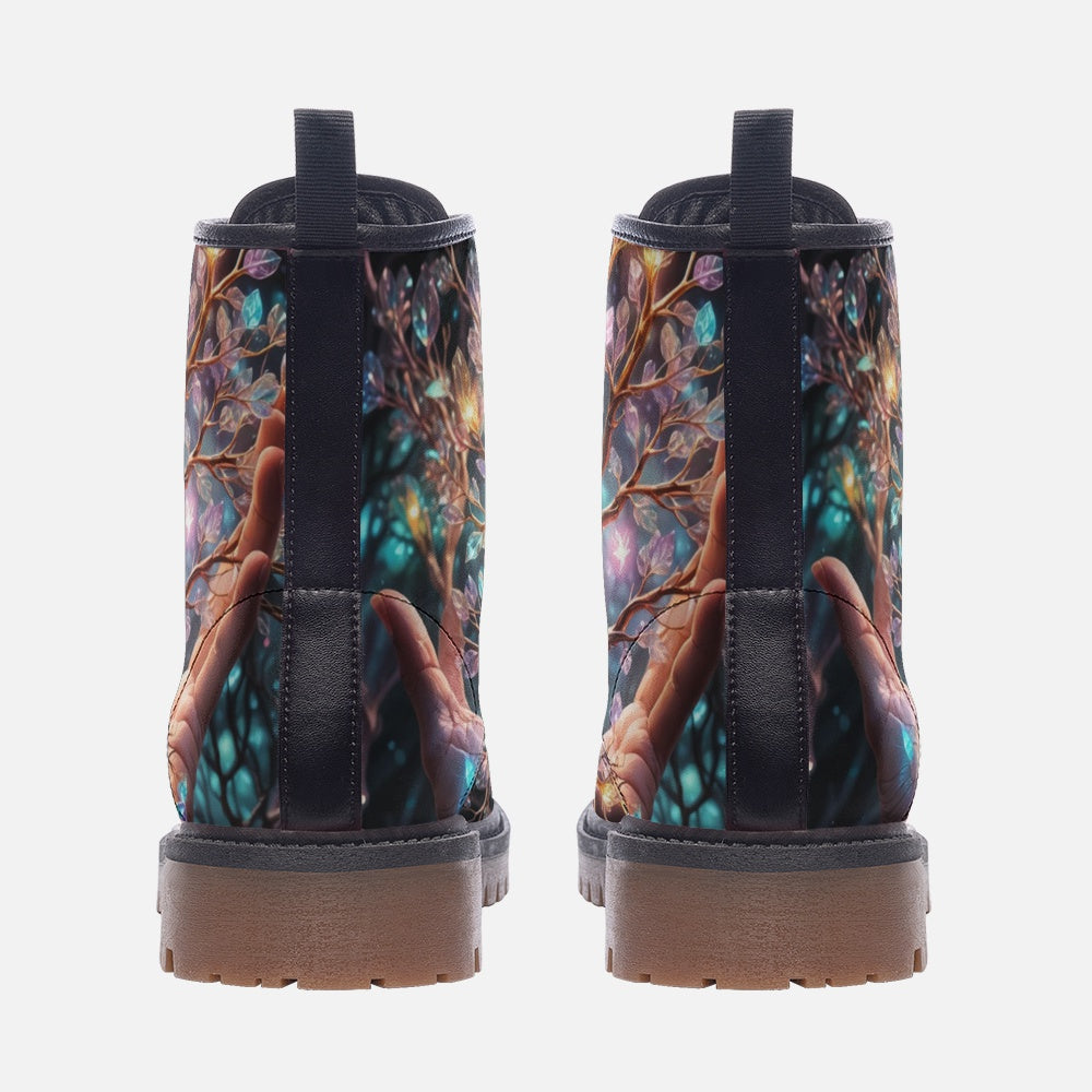 Connect with the essence of nature in our Tree of Life Hand vegan leather boots. This unique design features the Tree of Life growing from an outstretched hand, symbolizing growth, unity and harmony. Perfect for the free-spirited and boho crowd, these boots are crafted from eco-friendly vegan leather for comfort and durability. Embrace the magic of life with every step while adding style and purpose to your everyday adventures.