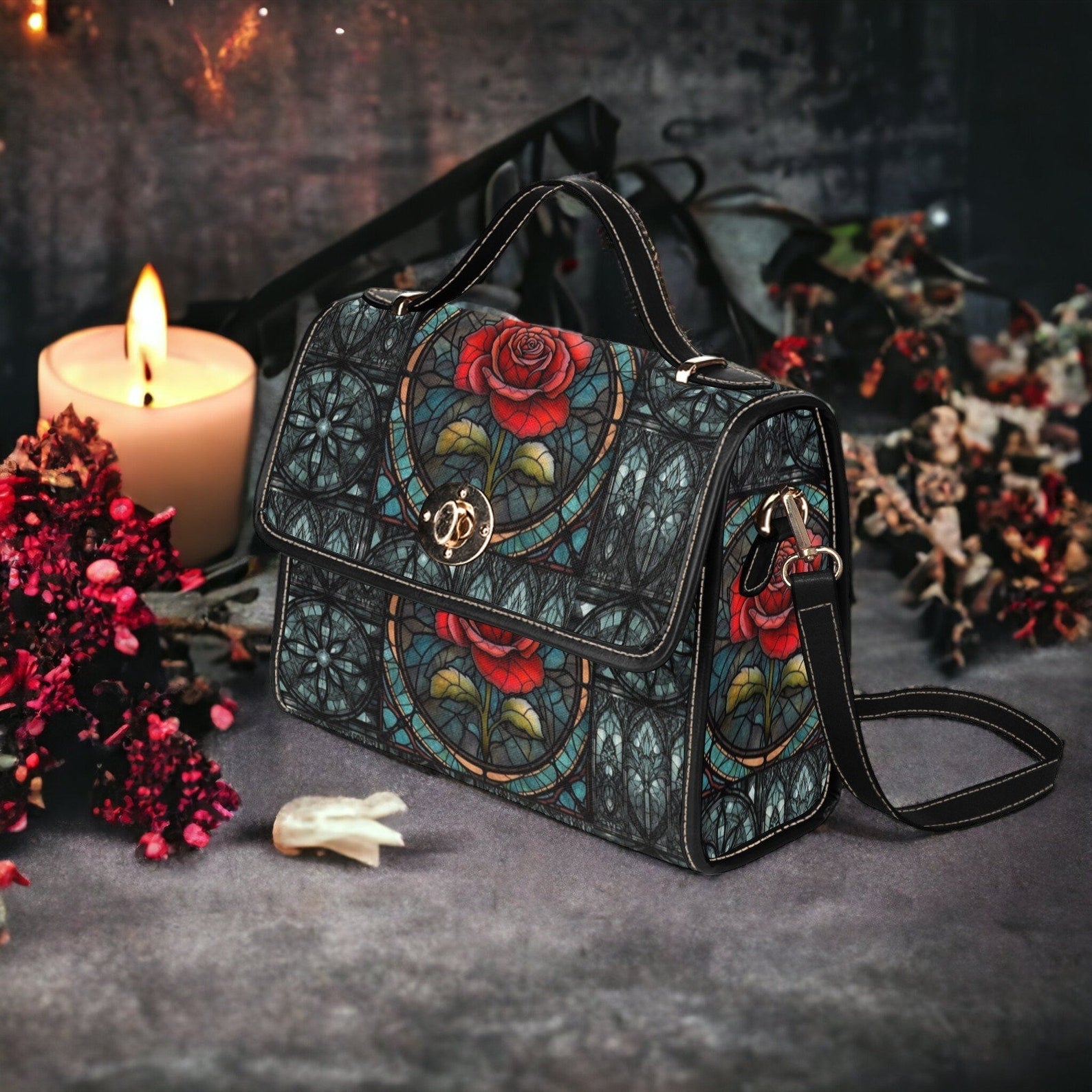 Introducing our Gothic Teal Rose Red Fabric Satchel Bag, a striking combination of Gothic elegance and floral charm. Inspired by stained glass art, this bag features an intricate teal pattern reminiscent of a cathedral window, decorated with deep red roses. Crafted from durable canvas, it combines timeless style with practicality, ideal for carrying your essentials with a touch of dramatic flair. Perfect for those who appreciate the Gothic aesthetic and seek accessories that make a statement with a unique blend of dark sophistication and natural beauty.