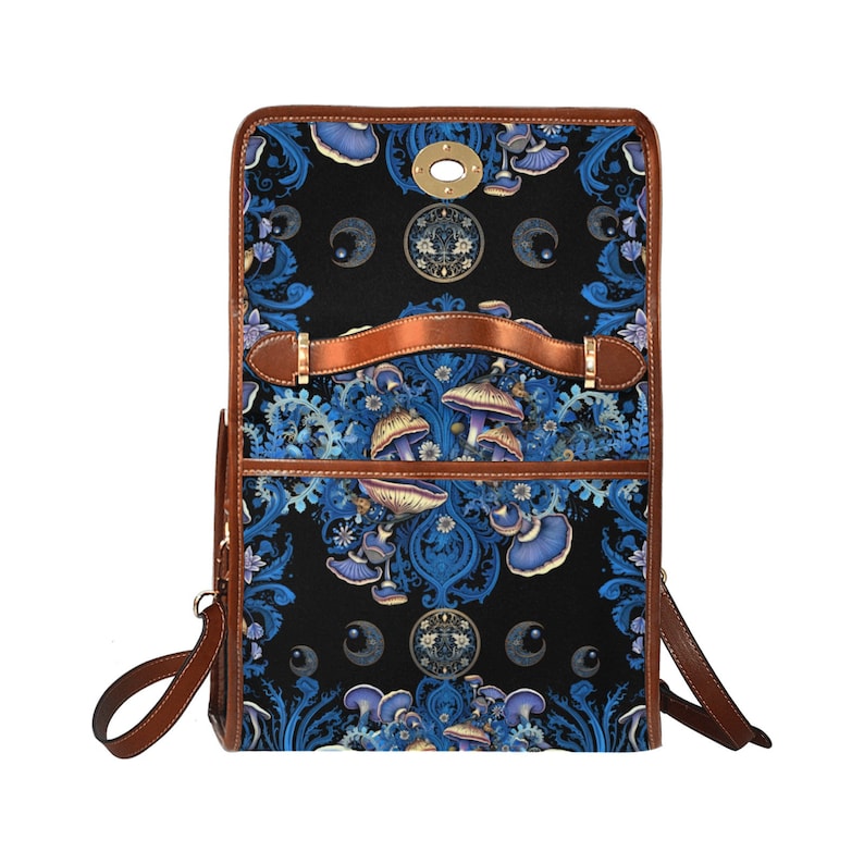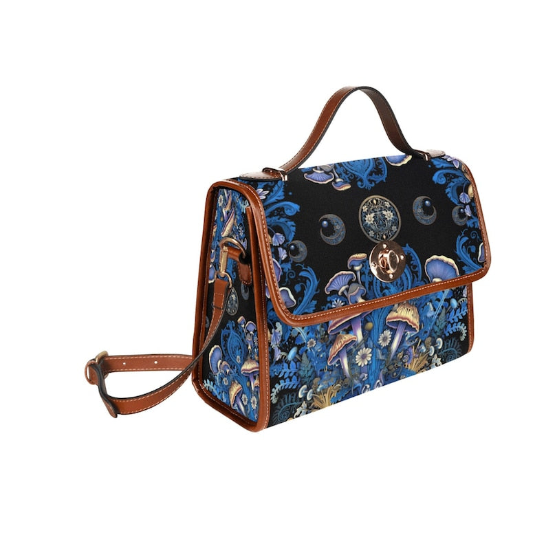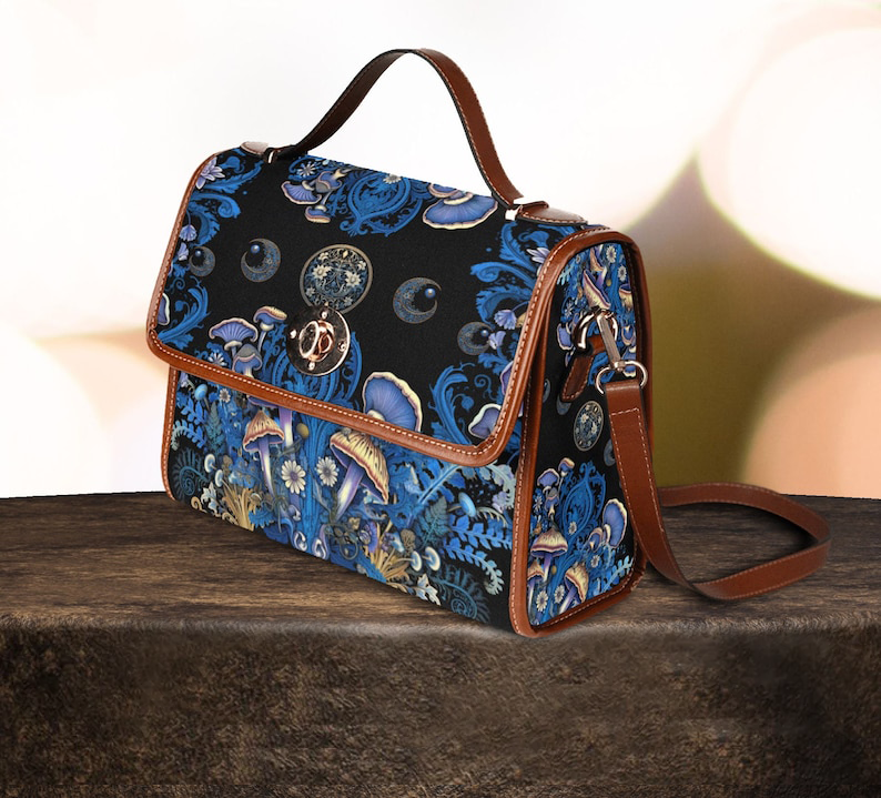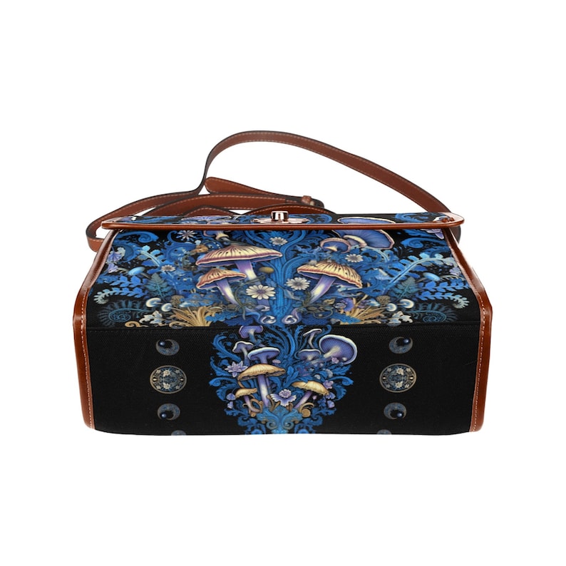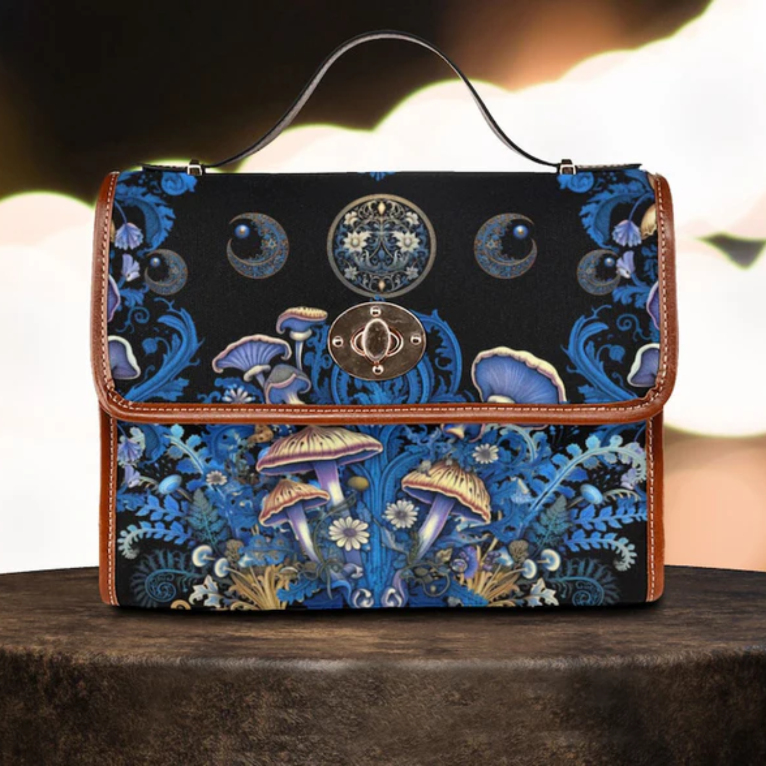 Introducing our Mushroom Satchel Bag, an exotic and paradise-inspired accessory that blends natural elements with mystical charm. Adorned with intricate mushroom motifs and a moon phase design against a serene backdrop, this bag embodies the essence of mesmerizing luxury. Crafted from durable materials, it combines practicality with artistic flair, perfect for carrying essentials with a touch of magical charm. Ideal for those who appreciate the beauty of nature and celestial themes, looking for accessories that reflect their love of whimsical and mystical motifs.