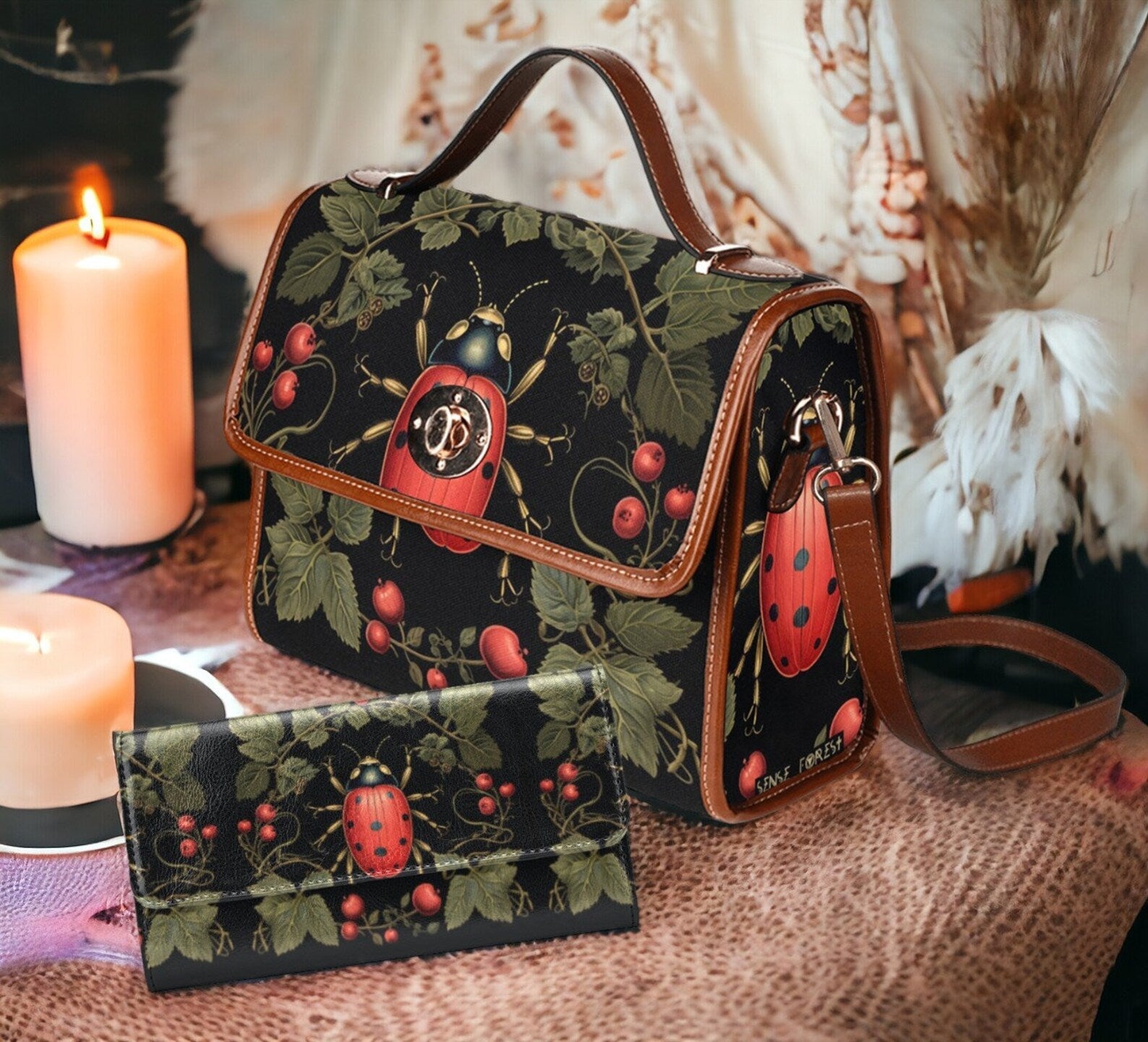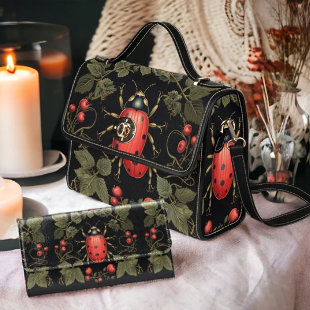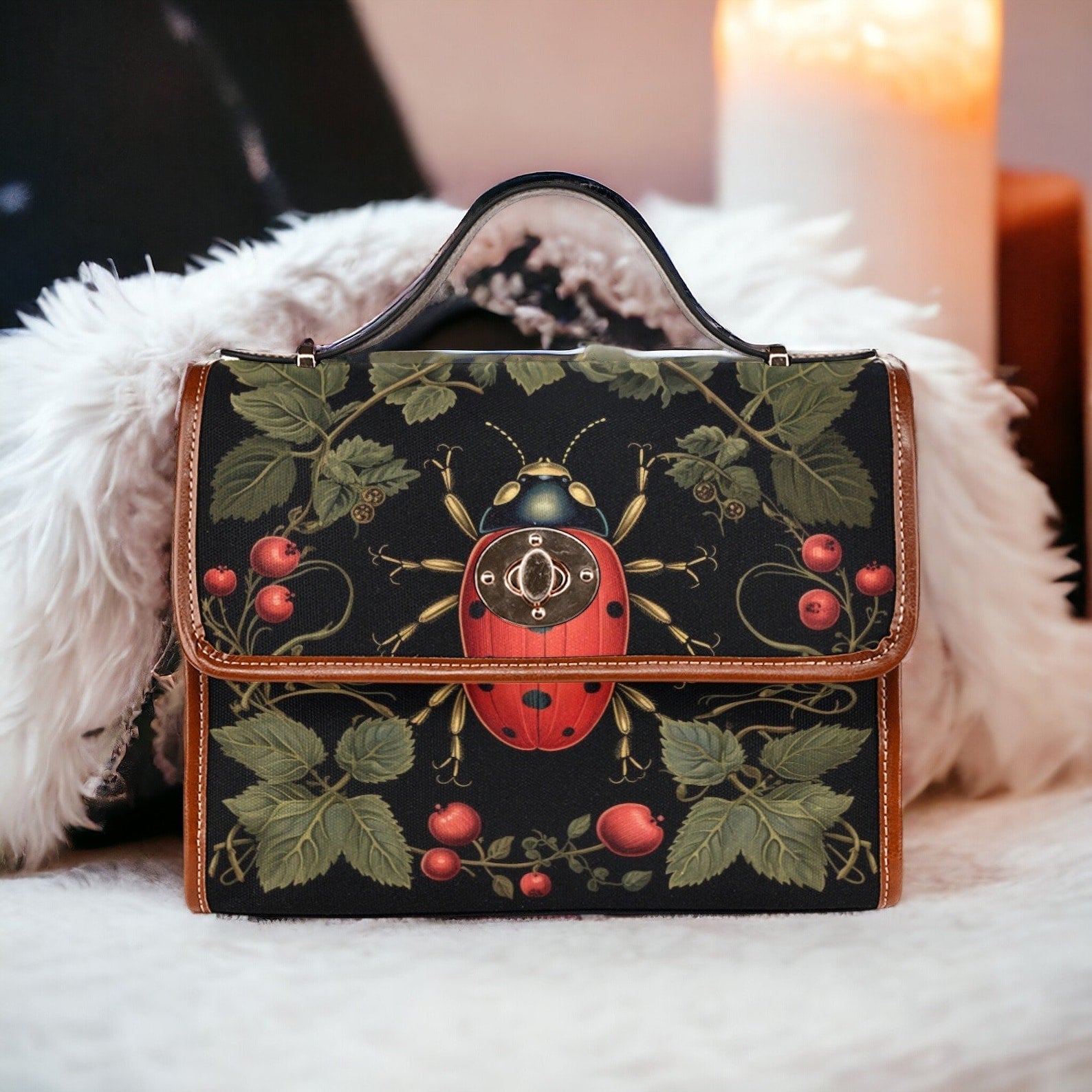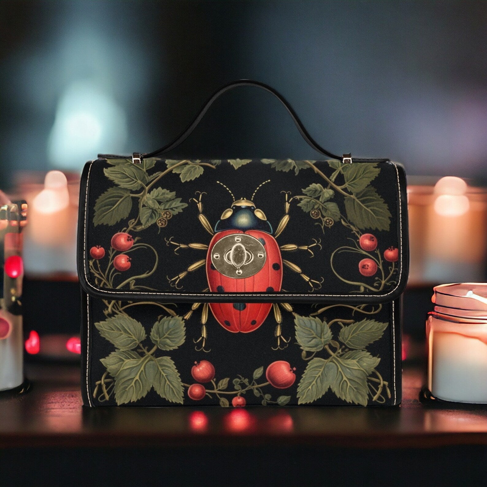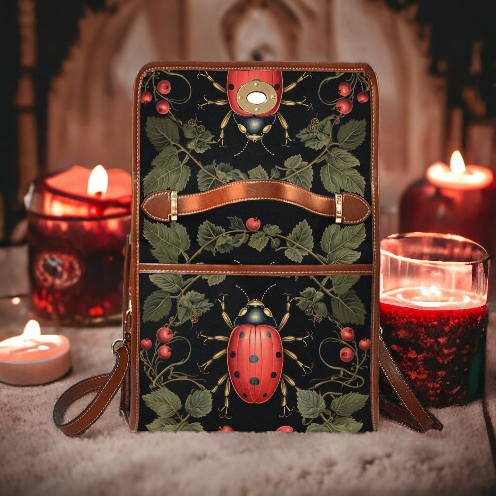 Introducing our red Ladybug Berry Satchel Bag, a delightful combination of whimsical and nature-inspired charm. Adorned with playful red ladybugs amid lush greenery and berries, this bag embodies the essence of natural beauty and cheerful spirit. Crafted from durable canvas, it combines practicality with artistic flair, perfect for carrying the essentials with a touch of fun luxury. Ideal for those who love the magic of the natural world and seek accessories that express their love with vibrant colors and playful patterns.