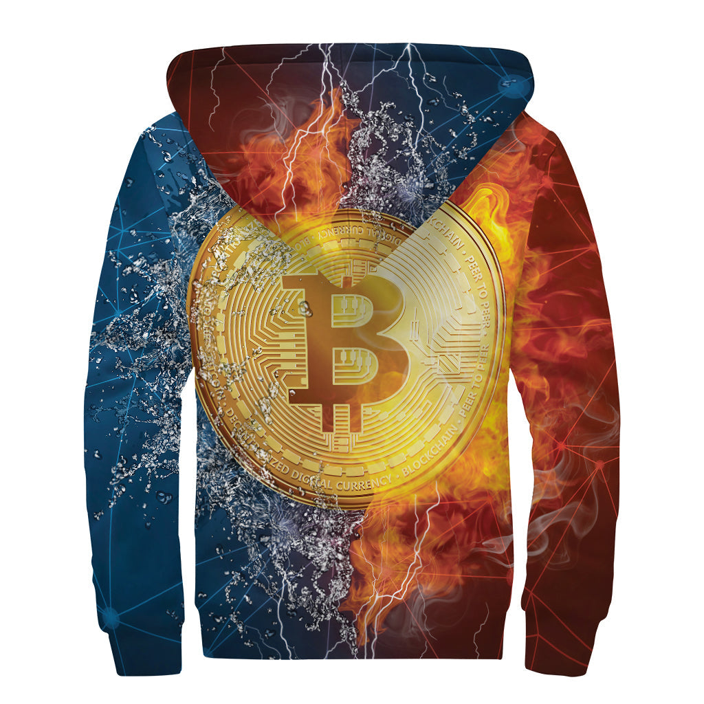 Fire and Water Bitcoin Print Sherpa Lined Zip Up Hoodie for Hipster Hippies