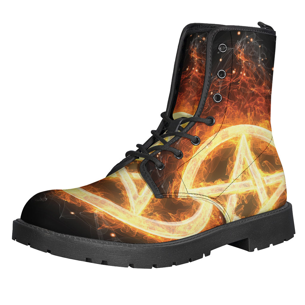 Flame Pentagram Print Leather Boots: Groovy Hippie Style for the Modern Bohemian - 1
