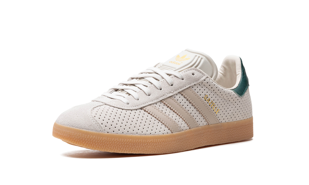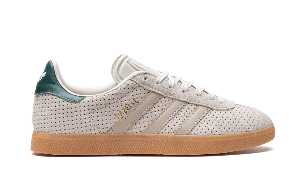 The adidas Gazelle “Aluminum/Collegiate Green” is a colorway of the retro shoe with unique details. The “Aluminum/Collegiate Green” features a perforated Aluminum-colored leather upper with Wonder Beige leather Three Stripes branding on the sides. Gold “Gazelle” detailing appears on the lateral side of the mid-panel. The Collegiate Green leather heel tab has a classic “adidas” Trefoil logo. More “adidas” insignia appears on the tongue. A gum sole completes the look.