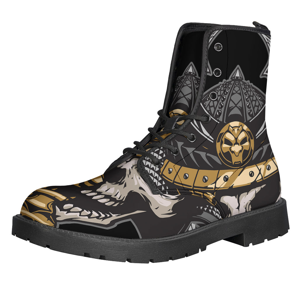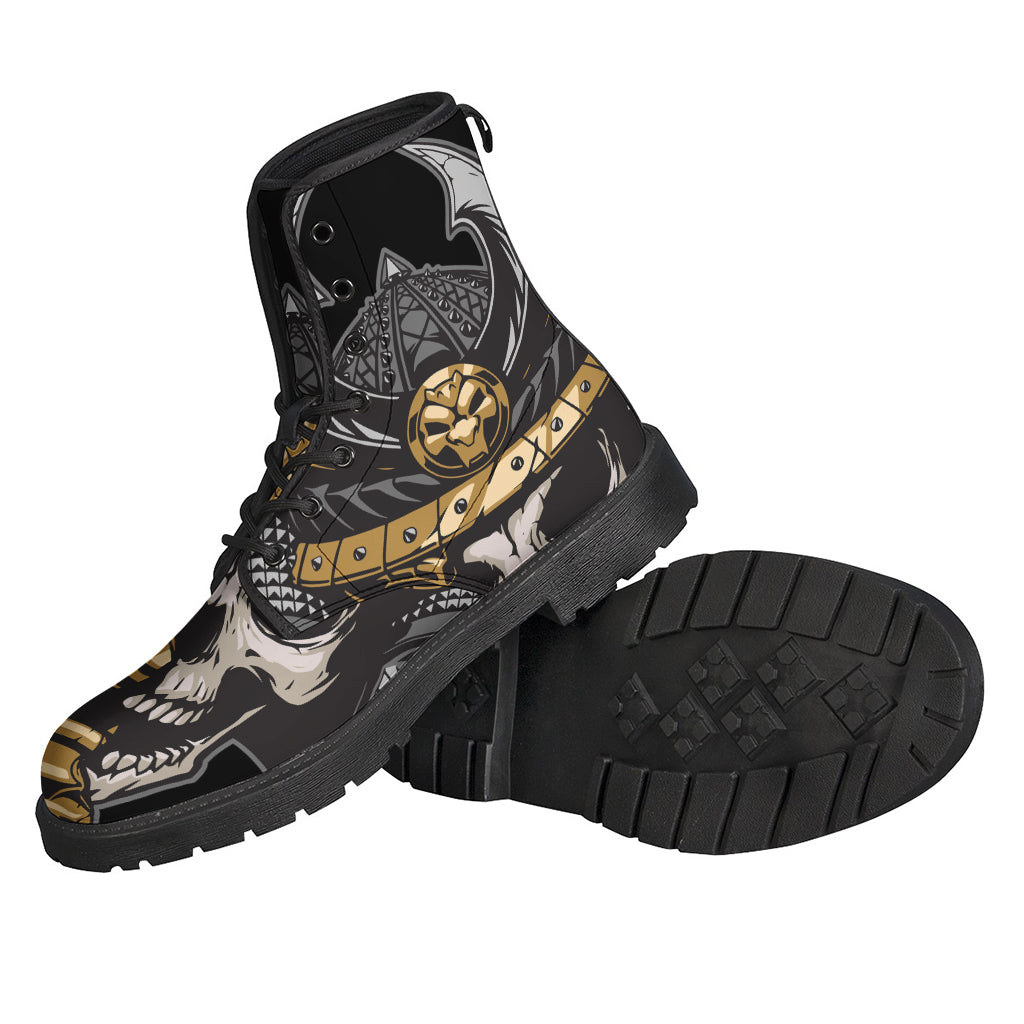 These black samurai skull print leather boots are the epitome of hippie style with a touch of edge. Made from lightweight leather, these boots are perfect for those who want to make a statement while still maintaining comfort and practicality. The unique samurai skull print adds a rebellious and bohemian touch to any outfit, making them perfect for festival season or just everyday wear. Whether you're dancing in a field or exploring the city streets, these boots will ensure that you stand out from the crowd in true hippie fashion.