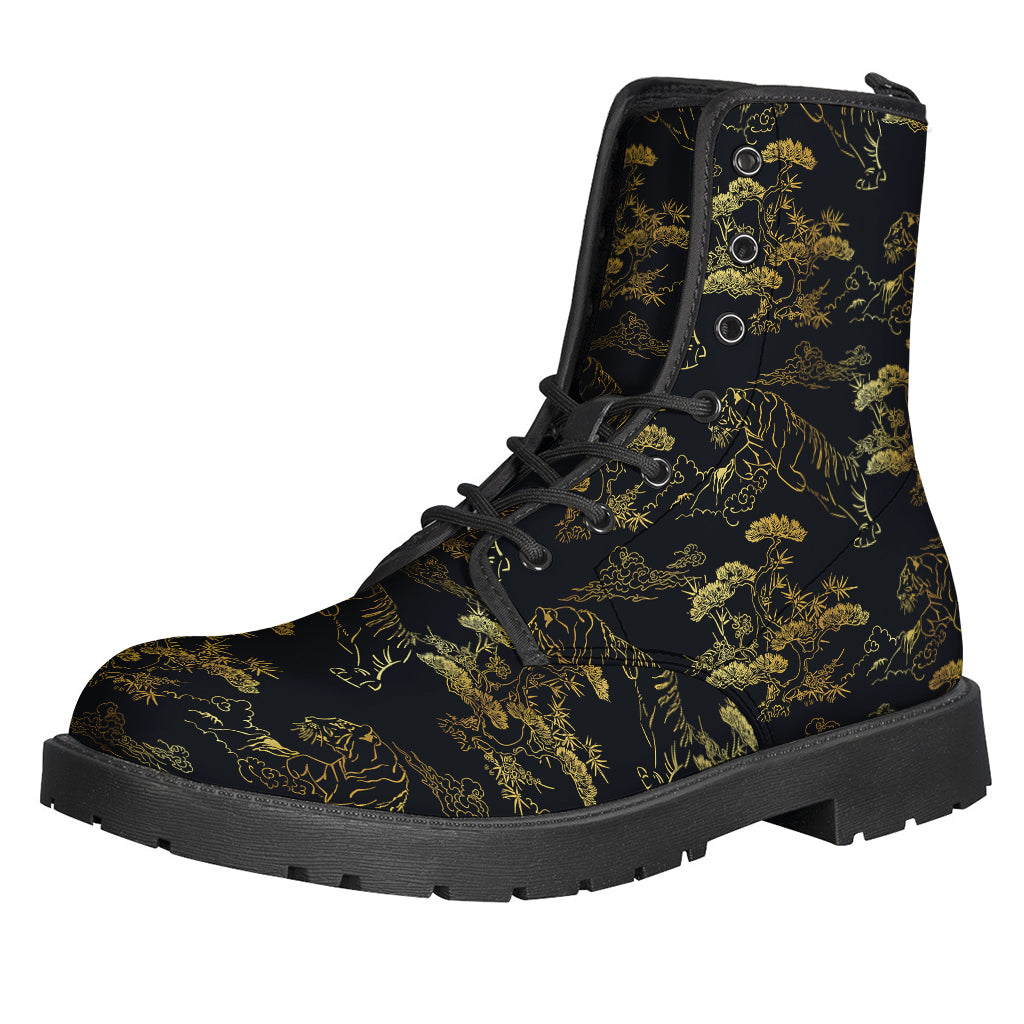 These hip and trendy Leather Lightweight Boots are perfect for the free-spirited hippie in your life. Featuring a unique black and gold Japanese tiger print design, these boots exude a sense of style and individuality. Made with high-quality leather, these boots are durable and comfortable, making them perfect for all-day wear. Slip into these boots and let your inner hippie shine as you dance to the beat of your own drum. Add a touch of bohemian flair to your wardrobe with these stylish and eye-catching boots.