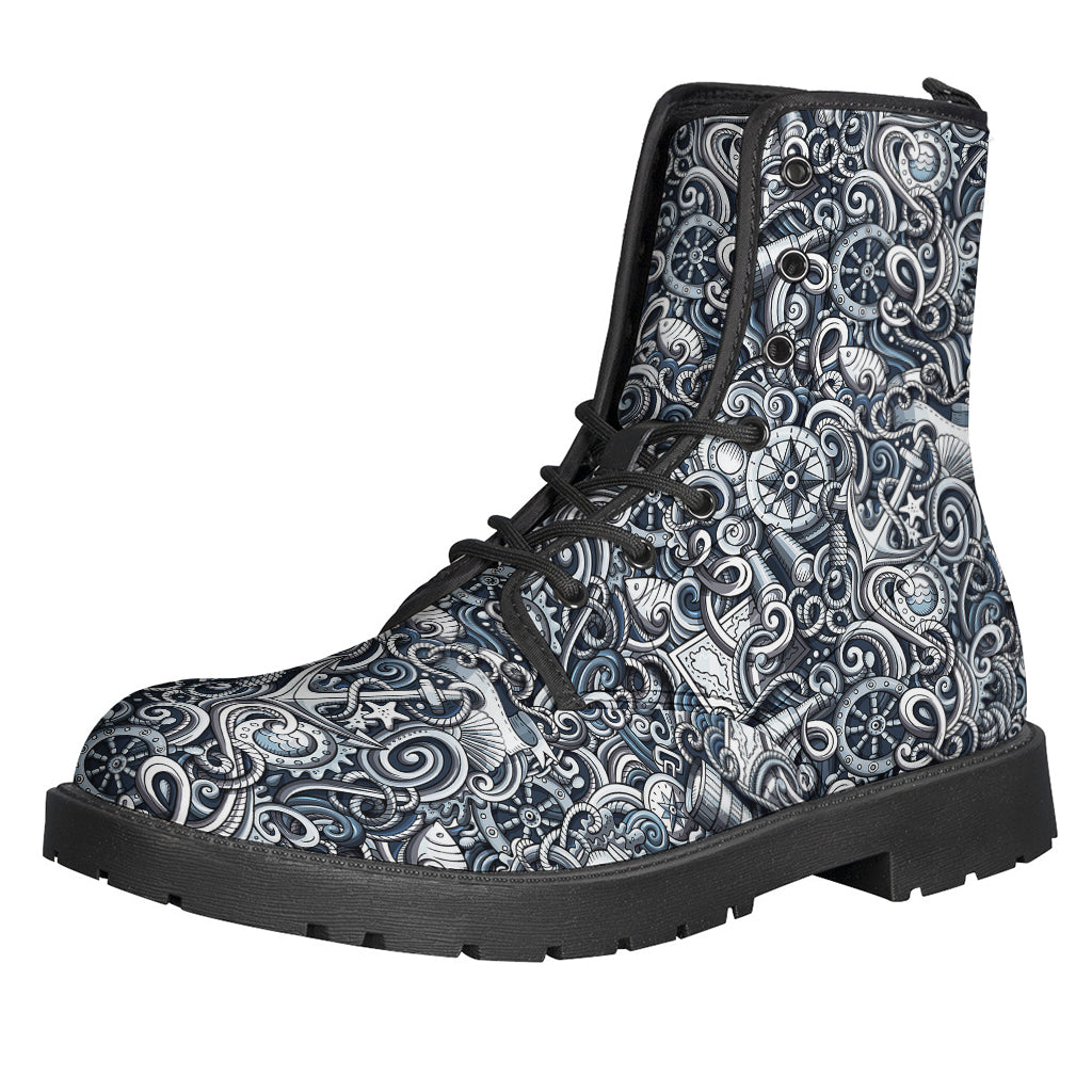 These Bohemian-inspired hippie Leather Lightweight Boots are the perfect addition to any free-spirited individual's shoe collection. Featuring an abstract nautical anchor pattern print on genuine leather, these boots are both stylish and durable. The lightweight construction allows for comfortable all-day wear, while the intricate design adds a touch of uniqueness to any outfit. Whether you're heading to a music festival or simply embracing your inner flower child, these hippie Leather Lightweight Boots are sure to make a statement.