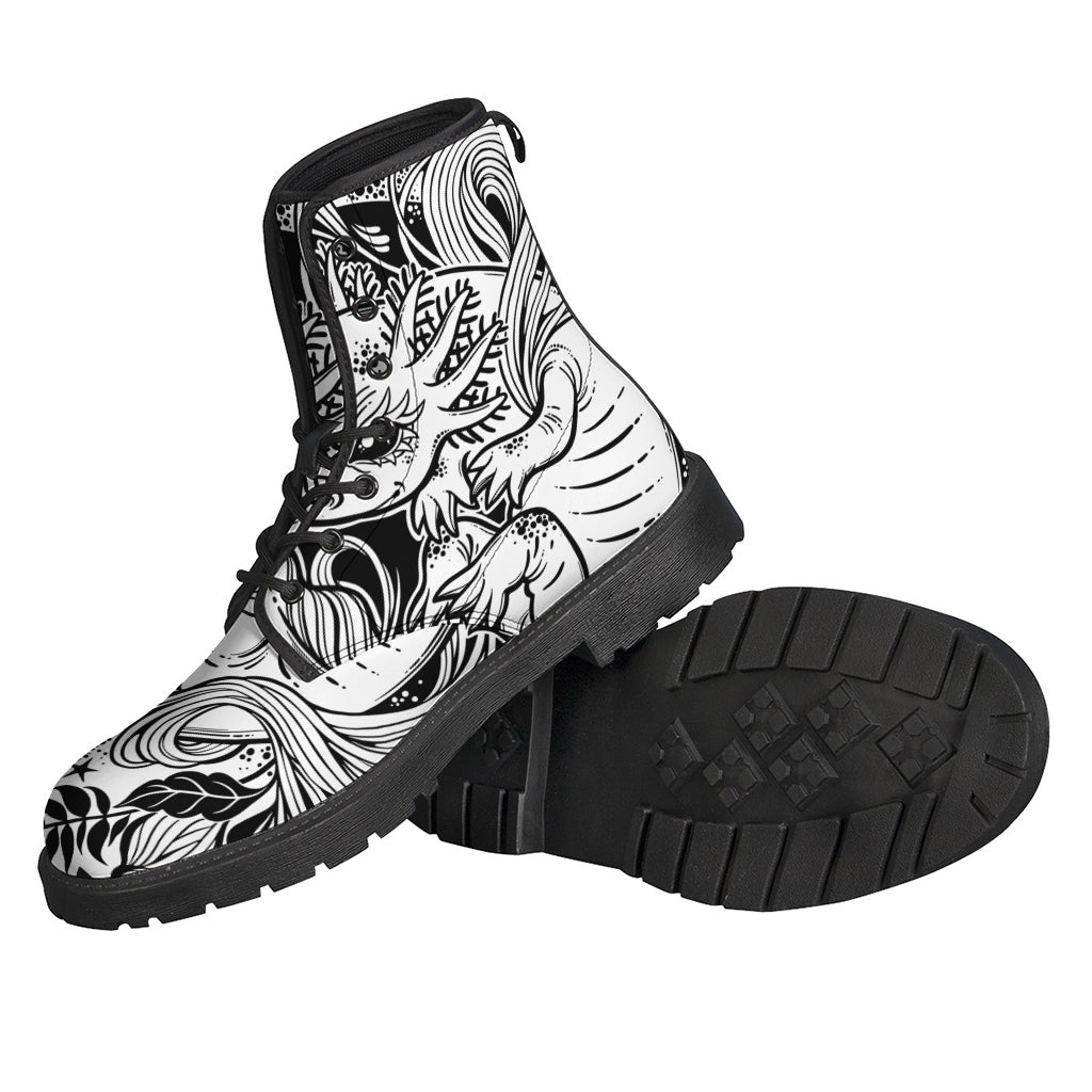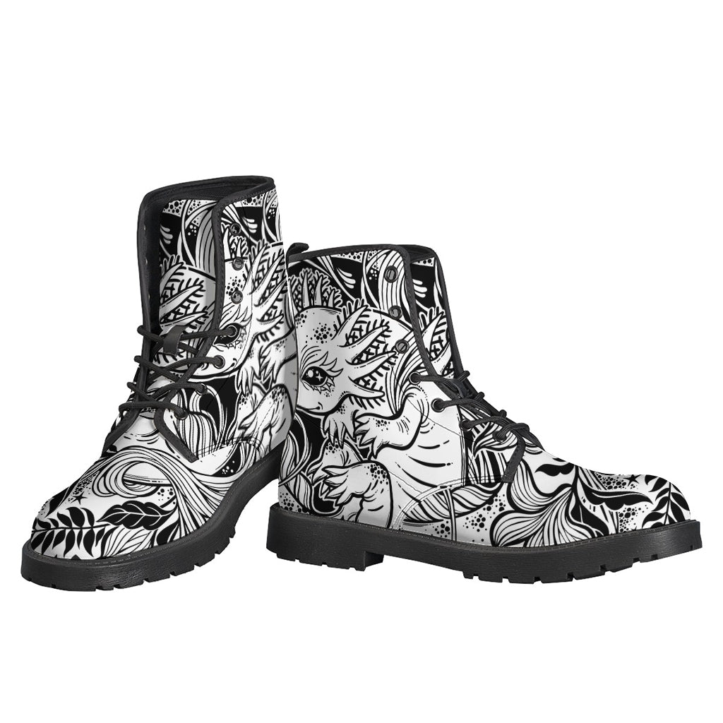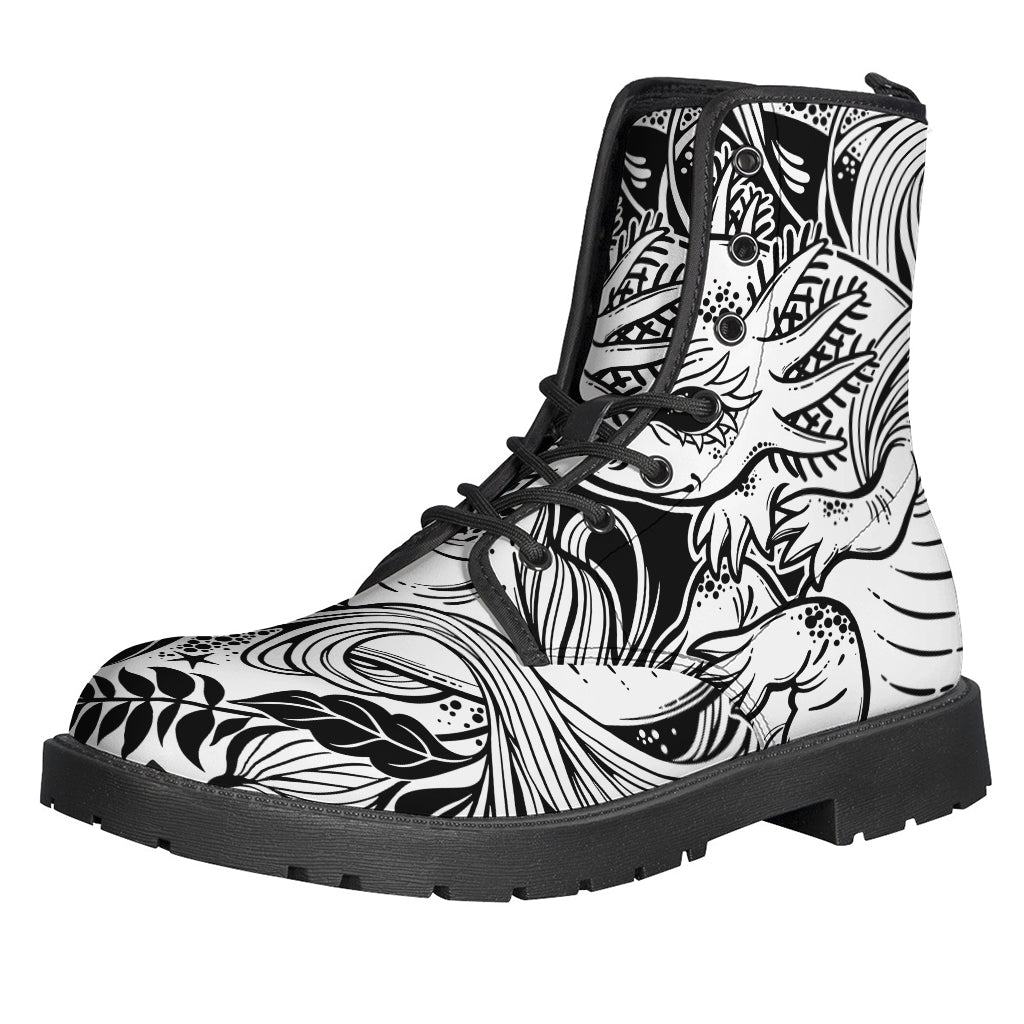 These unique leather lightweight boots are perfect for any modern-day hippie looking to make a statement with their footwear. The black and white axolotl print adds a touch of whimsy and individuality to this classic style. These boots are not only stylish but also comfortable, making them ideal for long days of walking or dancing at a music festival. The high-quality leather construction ensures durability and longevity, while the lightweight design makes them easy to wear all day long. Step out in style and show off your hippie spirit with these one-of-a-kind boots.
