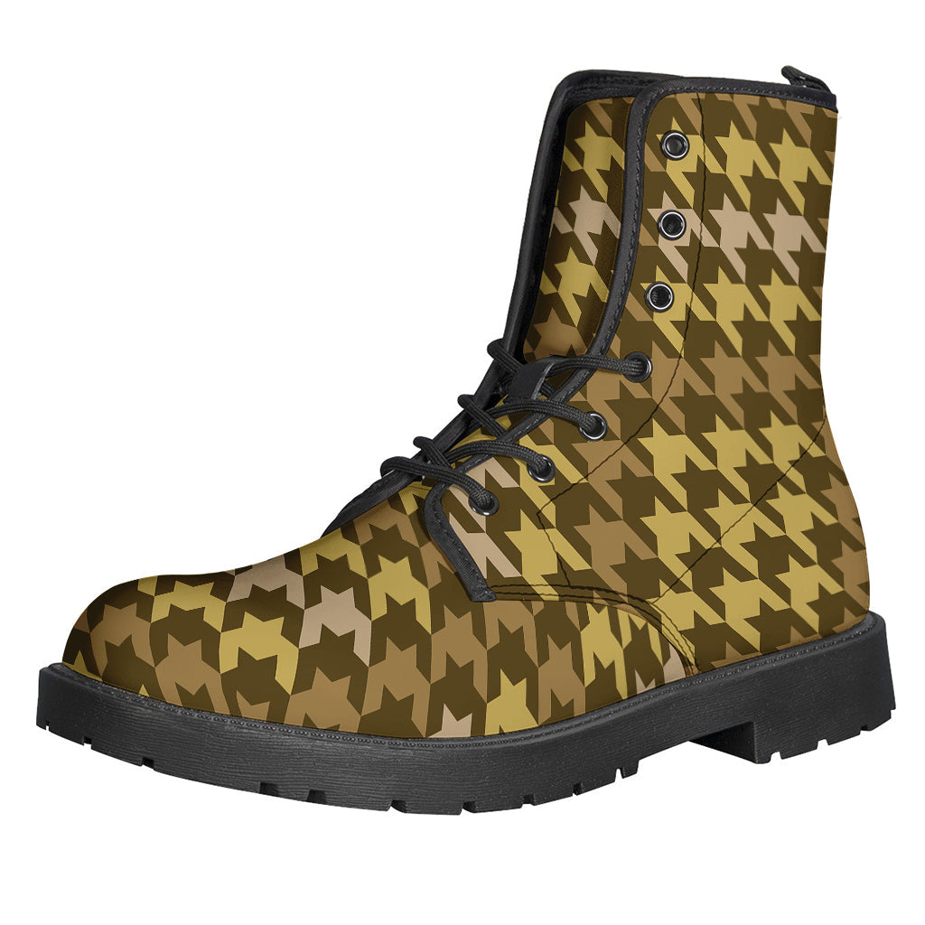 These hippie-inspired Leather Lightweight Boots are perfect for those looking to add a touch of bohemian flair to their wardrobe. The brown and tan houndstooth pattern adds a unique and eye-catching element to these boots, making them a standout piece for any outfit. Made from high-quality leather, these boots are not only stylish but also durable and comfortable for all-day wear. Whether you're heading to a music festival or just want to add some retro vibes to your everyday look, these hippie boots are sure to turn heads wherever you go.