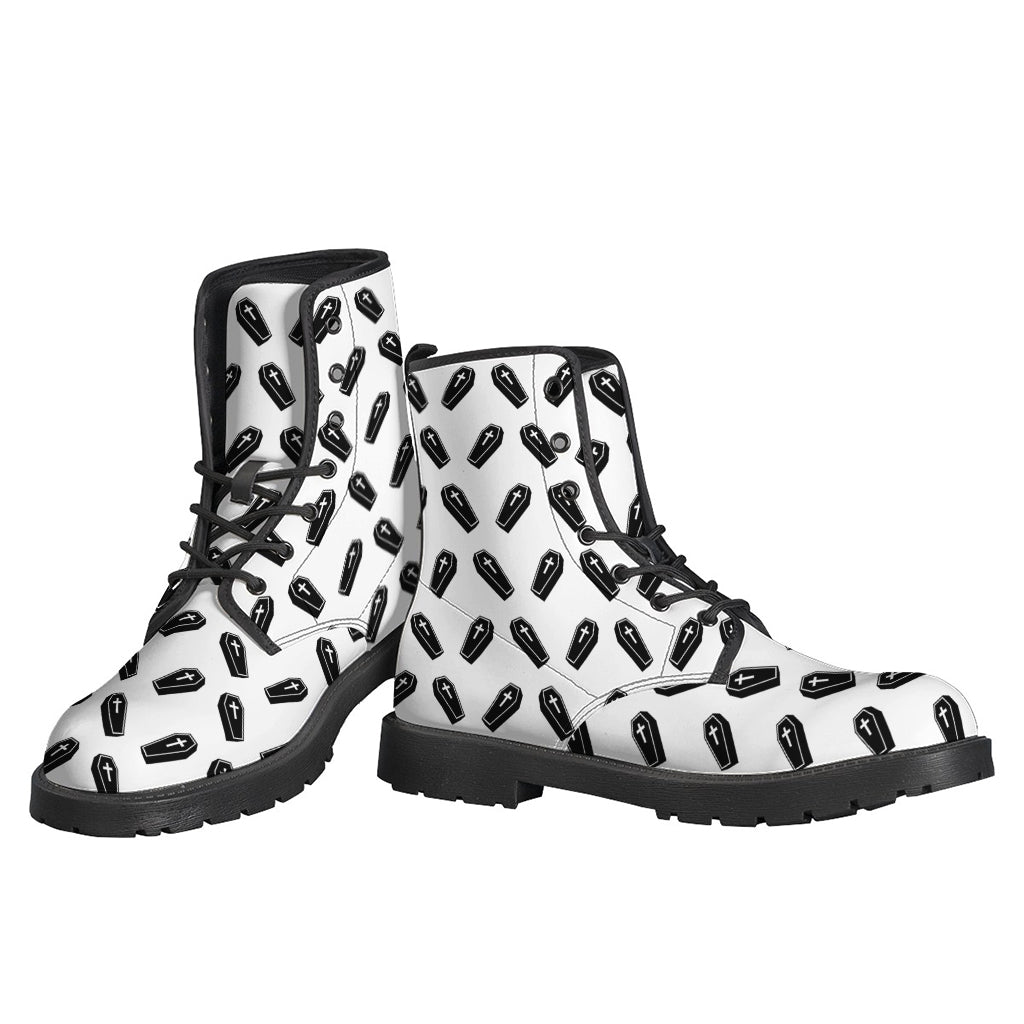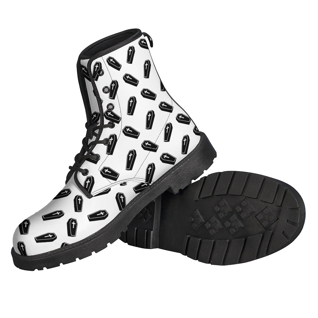 Embrace your inner bohemian spirit with these Hippies Leather Lightweight Boots. Featuring a unique black and white coffin pattern print, these boots are sure to make a statement wherever you go. Made from high-quality leather, they are not only stylish but also durable and long-lasting. The lightweight design and comfortable fit make them perfect for all-day wear, whether you're exploring music festivals or simply strolling through the city streets. Step out in style and show off your free-spirited style with these one-of-a-kind boots.