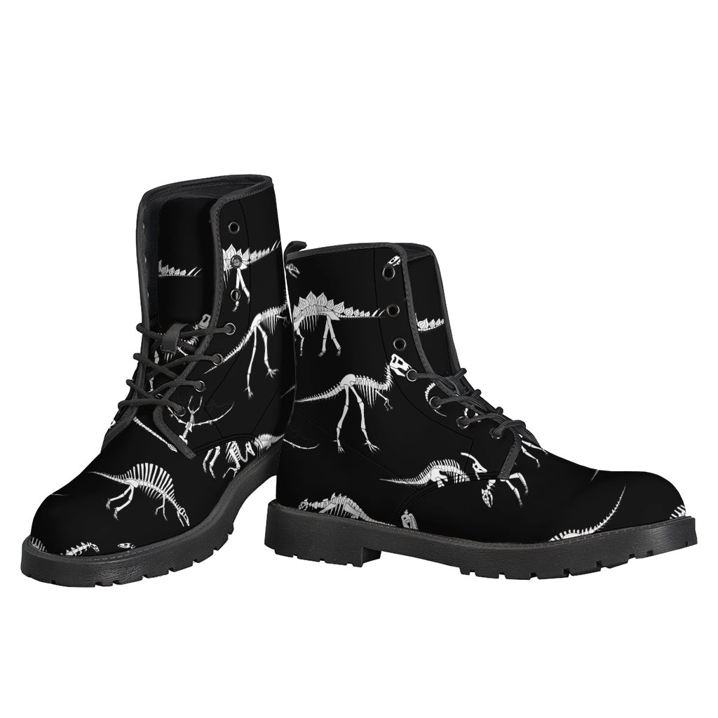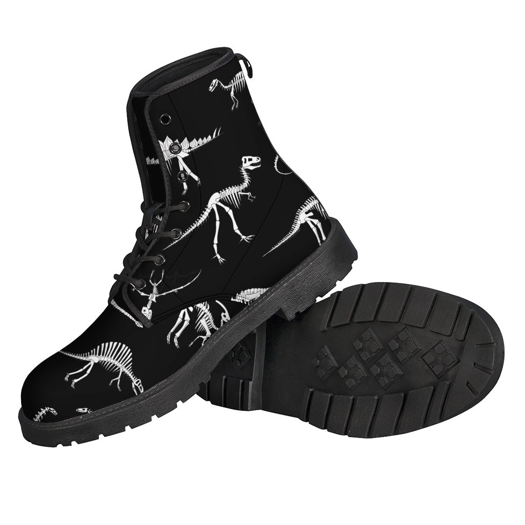 These Black and White Dinosaur Fossil Print Leather Boots are perfect for the modern-day hippie looking to add a unique and edgy touch to their boho-chic wardrobe. Made from lightweight leather, these boots feature a striking black and white dinosaur fossil print that is sure to turn heads wherever you go. The lace-up design and low heel make them comfortable for all-day wear, while the durable construction ensures they will last for many festivals and adventures to come. Whether you're dancing at a music festival or exploring the great outdoors, these boots are a stylish and versatile choice for any free-spirited individual.