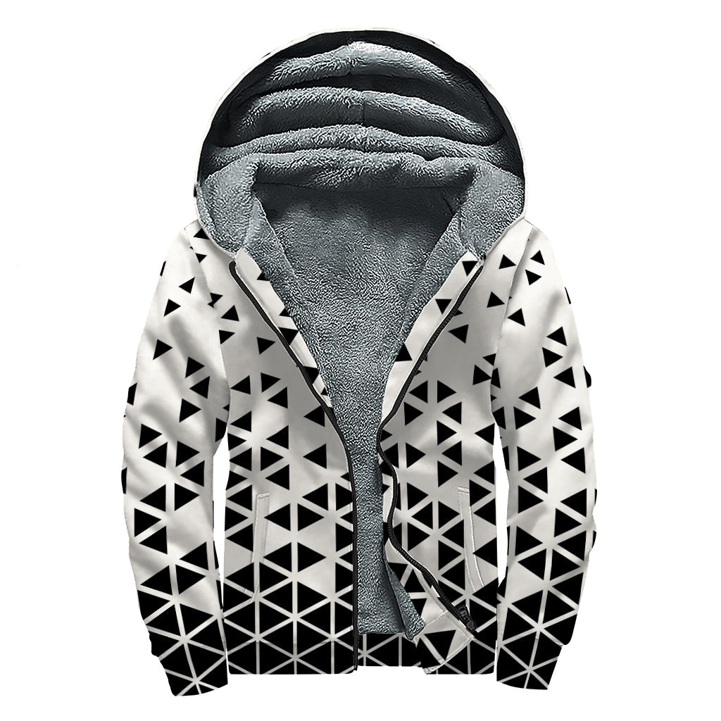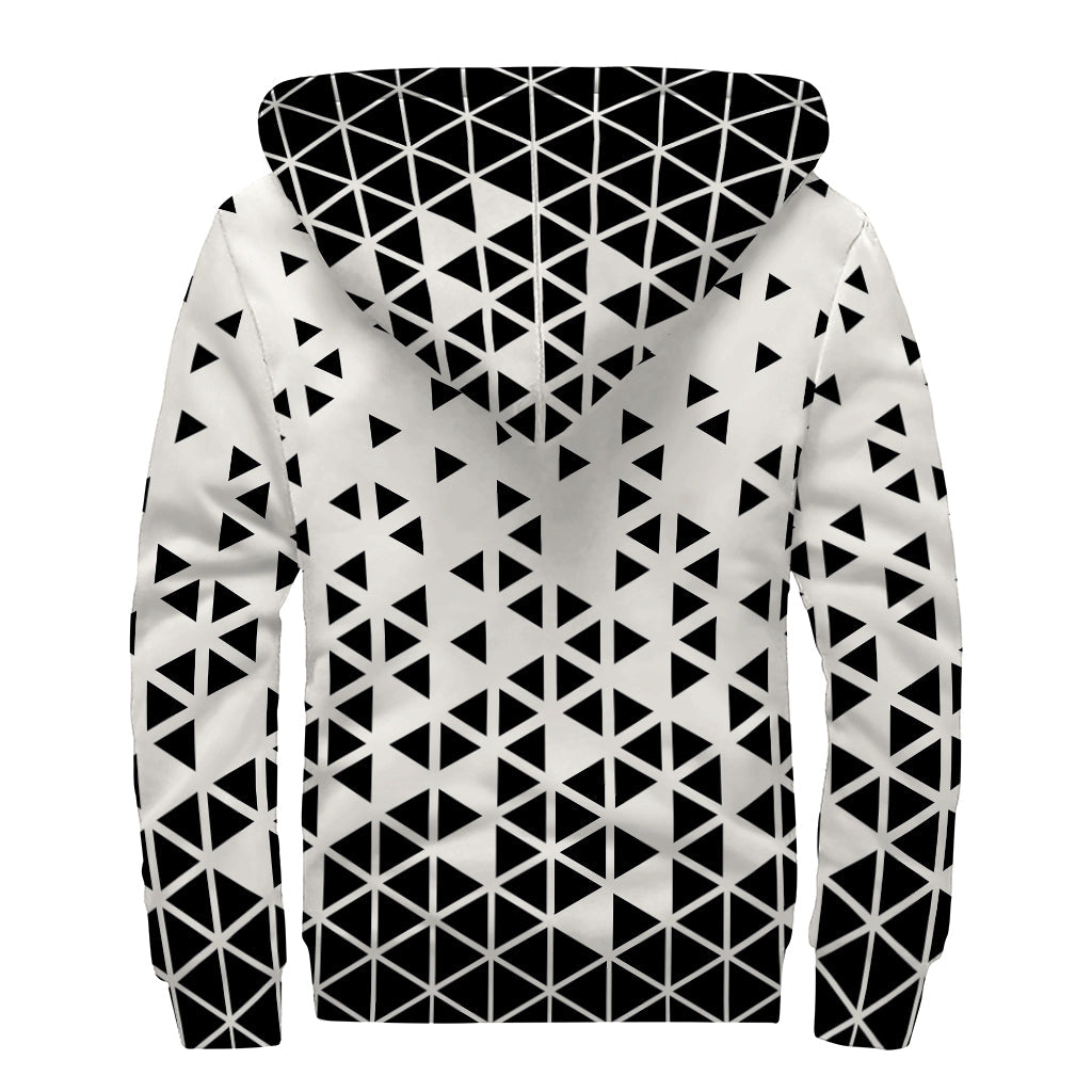 Stay warm and cozy in this stylish and unique Black and White Geometric Pattern Print Sherpa Lined Zip Up Hoodie. Inspired by the free-spirited style of hippies, this hoodie features a bold geometric pattern that will make a statement wherever you go. The sherpa lining provides extra warmth and comfort, perfect for chilly days and nights. Whether you're heading to a music festival, out for a hike, or just lounging at home, this hoodie is the perfect addition to your wardrobe. Embrace your inner hippie and rock this cool and comfortable zip-up hoodie for a laid-back and bohemian look.