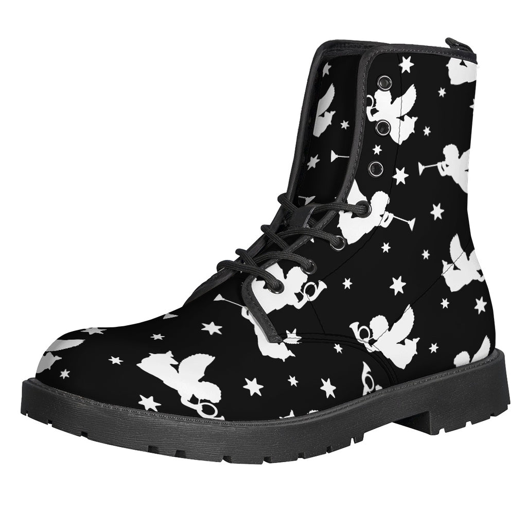 These black and white Angel pattern print leather boots are the perfect choice for those who want to embrace their inner hippie style. Made from high-quality, lightweight leather, these boots are not only durable but also stylish and comfortable. The unique angel pattern print adds a touch of whimsy and individuality to any outfit, making these boots a standout piece in your wardrobe. Whether you're heading to a festival, a concert, or just out for a casual day, these hippie leather boots will complete your look and have you feeling confident and stylish. Channel your inner free spirit and express your personality with these fashionable and eye-catching boots.