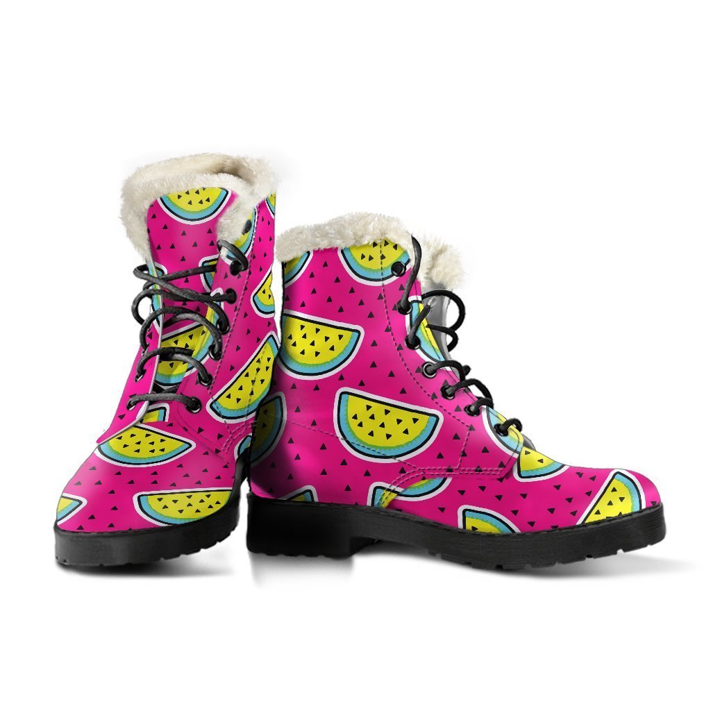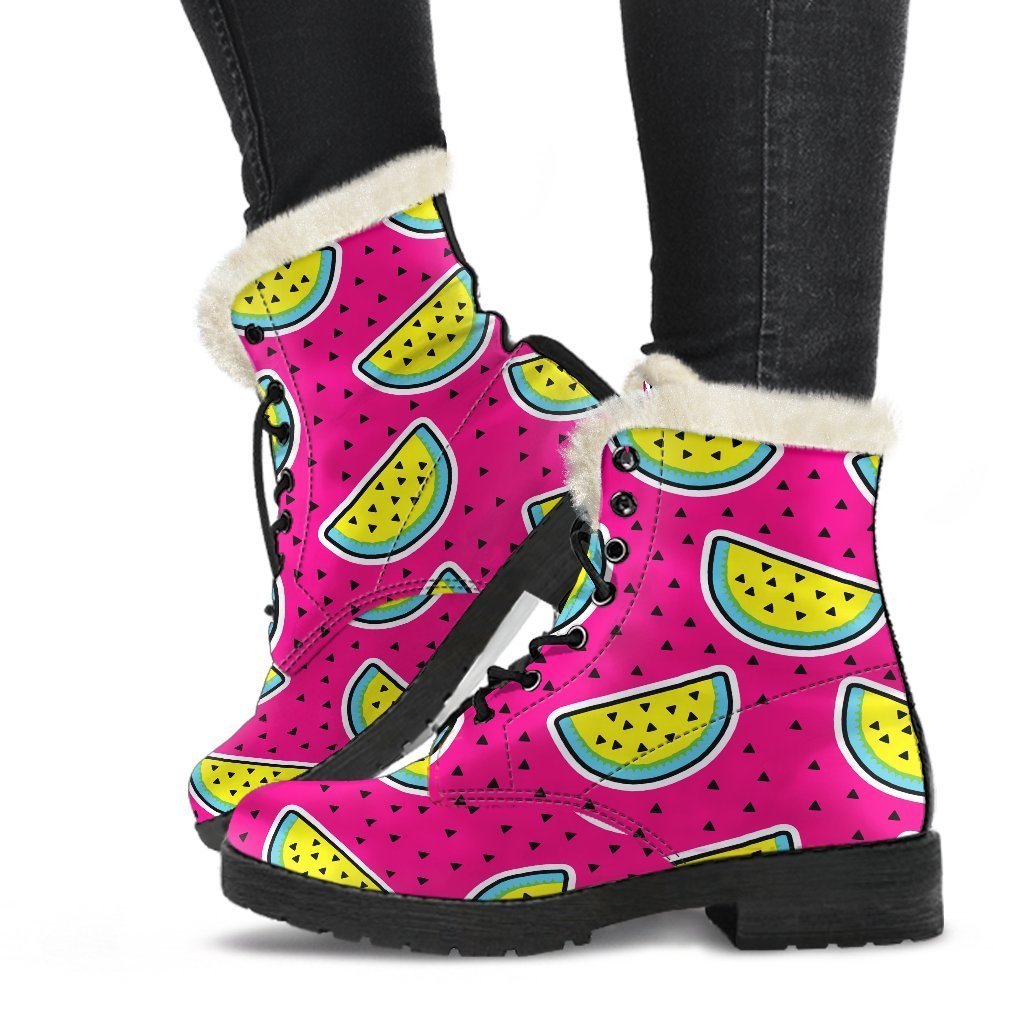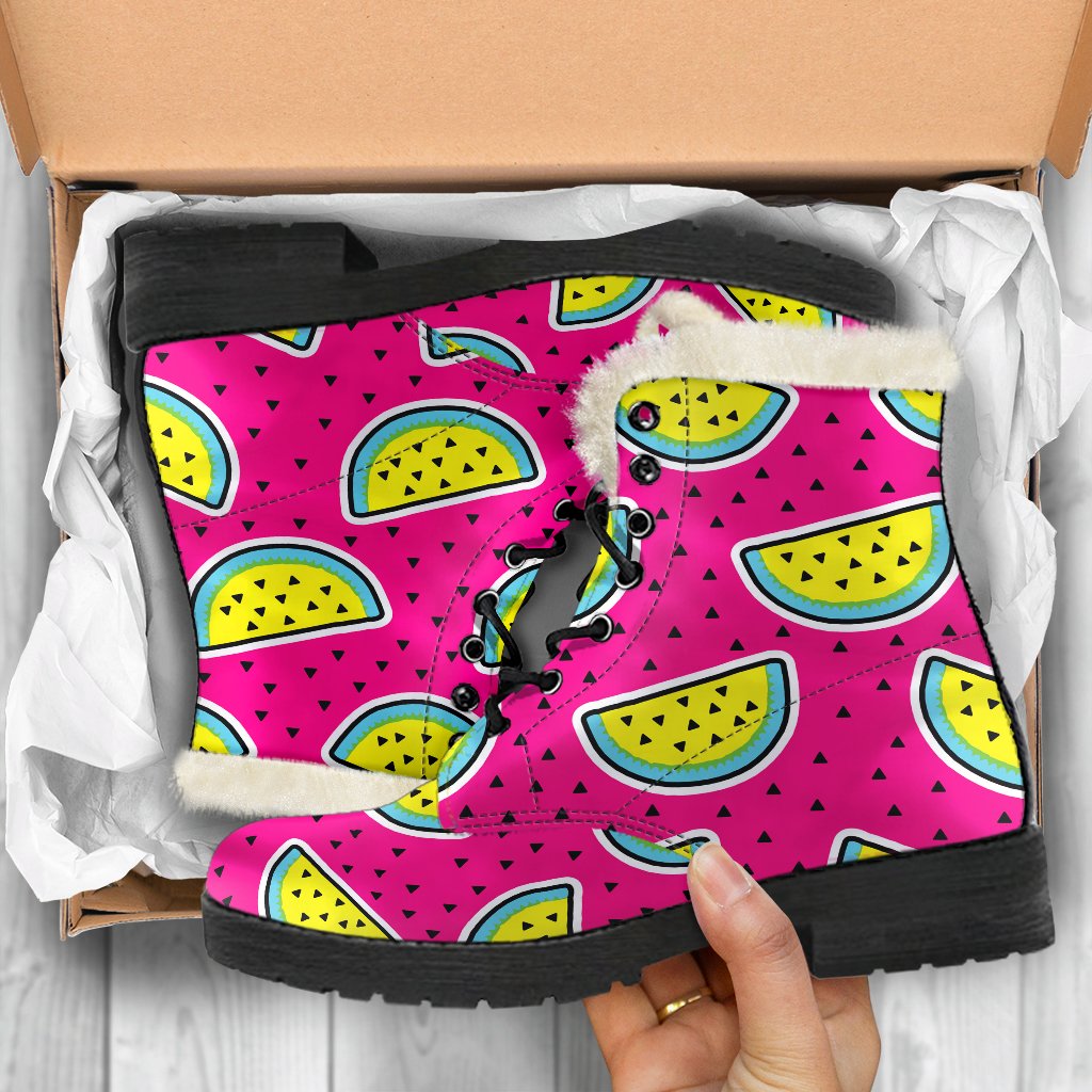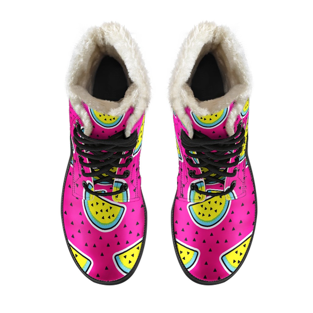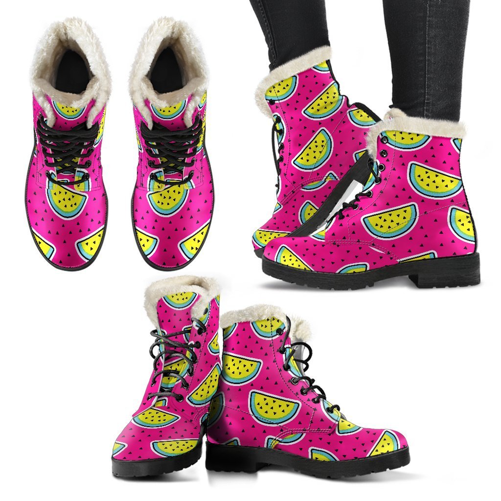 Embrace your inner flower child with these Purple Fancy Watermelon Pattern Print Faux Fur Leather Boots. Designed for the free-spirited individual who loves to express themselves through their style, these boots are a perfect addition to any hippie-inspired wardrobe. The vibrant purple color and whimsical watermelon pattern add a playful touch, while the faux fur lining provides warmth and comfort. Whether you're dancing at a music festival or wandering through a farmers' market, these boots will keep you looking stylish and feeling cozy. Slip them on with your favorite bohemian dress or flowy pants for a look that is effortlessly chic. These boots are not only fashionable but also eco-friendly, making them a guilt-free addition to your shoe collection. Take a step towards peace, love, and good vibes with these Hippies Faux Fur Leather Boots.