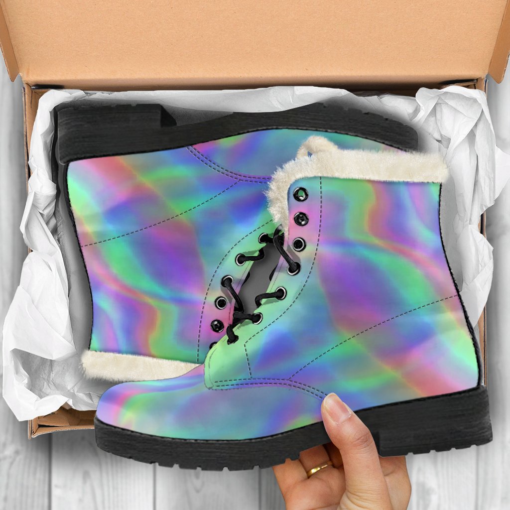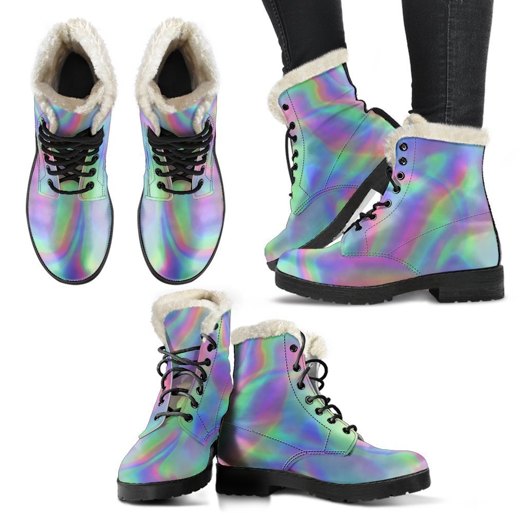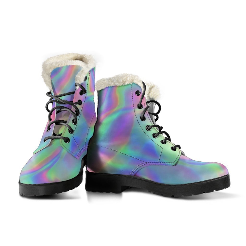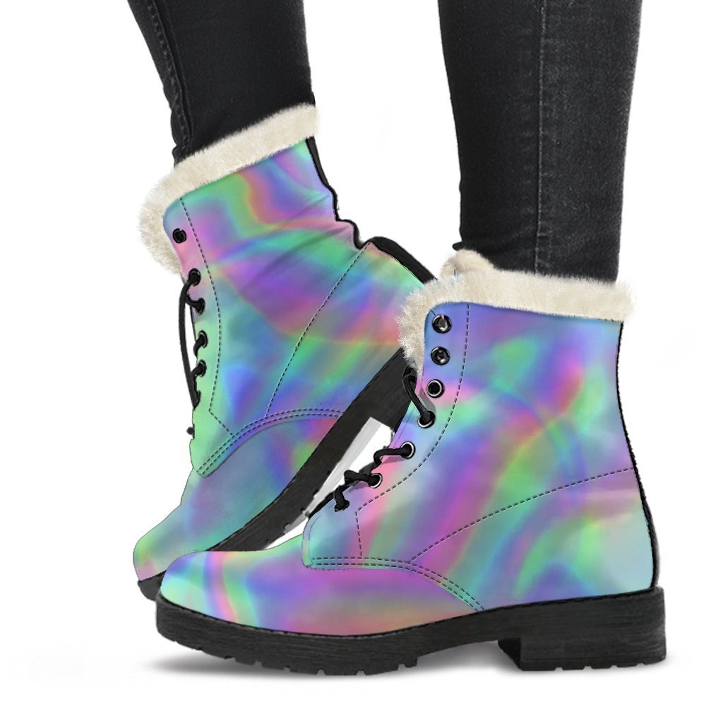 Channel your inner flower child with these psychedelic holographic trippy print faux fur leather boots. These boots are perfect for hippies who want to showcase their unique and eclectic style. The vibrant colors and funky design will make a statement wherever you go. The faux fur lining will keep your feet warm and cozy, while the leather exterior adds a touch of edge to your look. Whether you're headed to a music festival or just want to add some flair to your everyday outfit, these boots are sure to turn heads. Embrace your free-spirited style with these groovy boots.