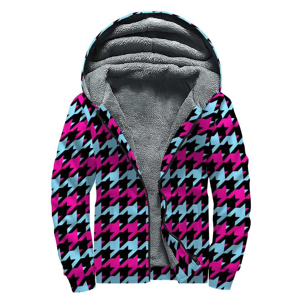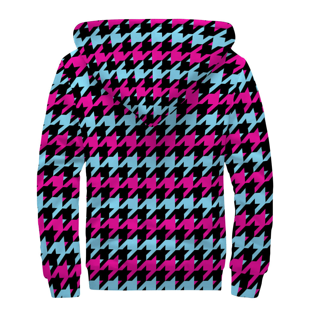 Get cozy and stylish with this Sherpa Lined Zip Up Hoodie from Gearfrost. This unique hoodie features a pink, blue, and black houndstooth print that is sure to make a statement. The Sherpa lining adds extra warmth and comfort, making it perfect for chilly days or nights. Whether you're heading to a music festival or just hanging out with friends, this hoodie is the perfect addition to any hippie-inspired wardrobe. Embrace your free spirit and rock this fun and funky hoodie wherever you go!