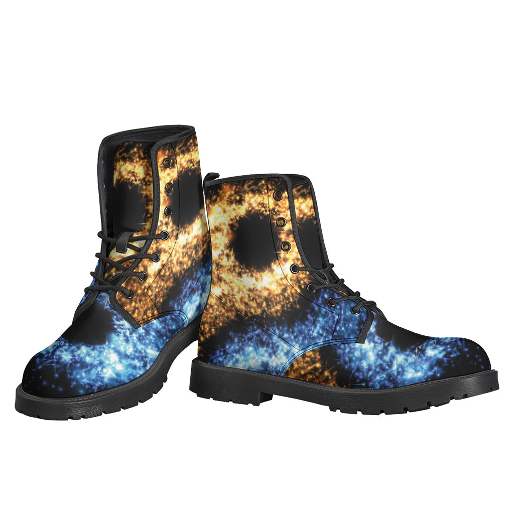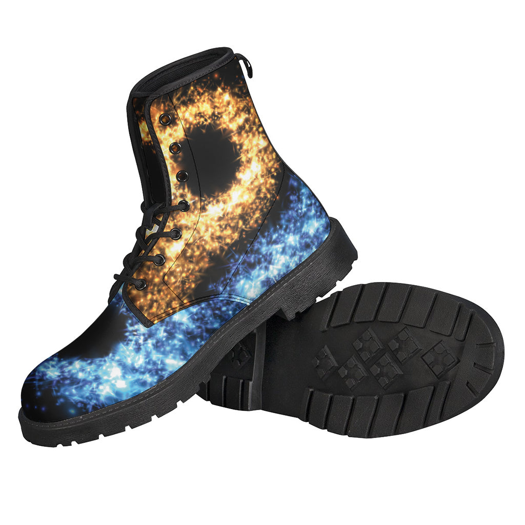 These hippie Leather Lightweight Boots are perfect for those who love to embrace nature and express their unique style. The Fire and Ice Sparkle Yin Yang print adds a mystical touch to these boots, making them stand out from the crowd. The leather material makes them durable and long-lasting, while still being lightweight and comfortable to wear. Whether you are heading to a music festival, a hike in the woods, or simply want to add some eclectic flair to your everyday wardrobe, these boots are sure to make a statement. Embrace your inner hippie spirit with these stylish and eye-catching boots.