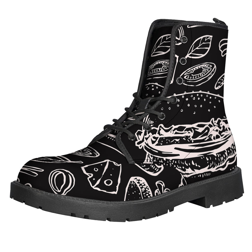 Embrace your inner free spirit with these stylish Hamburger Print Leather Boots from Gear Frost. These boots are perfect for any modern-day hippie who wants to make a bold fashion statement. Made from lightweight leather, these boots feature a vibrant black and white hamburger print that is sure to turn heads wherever you go. The comfortable design and durable construction make these boots perfect for everyday wear, whether you're heading to a music festival or simply hanging out with friends. Step out in style and show off your unique personality with these one-of-a-kind hippie leather boots.